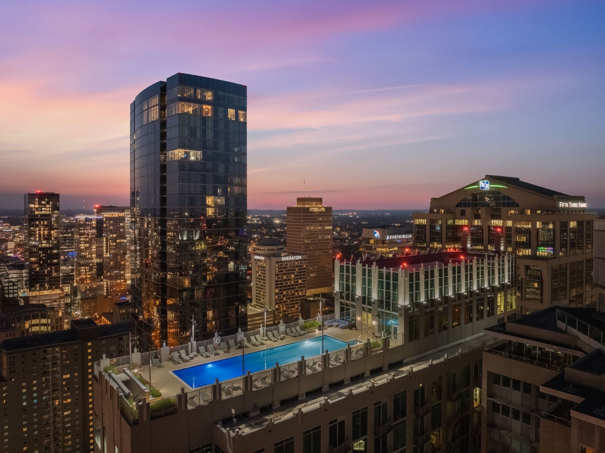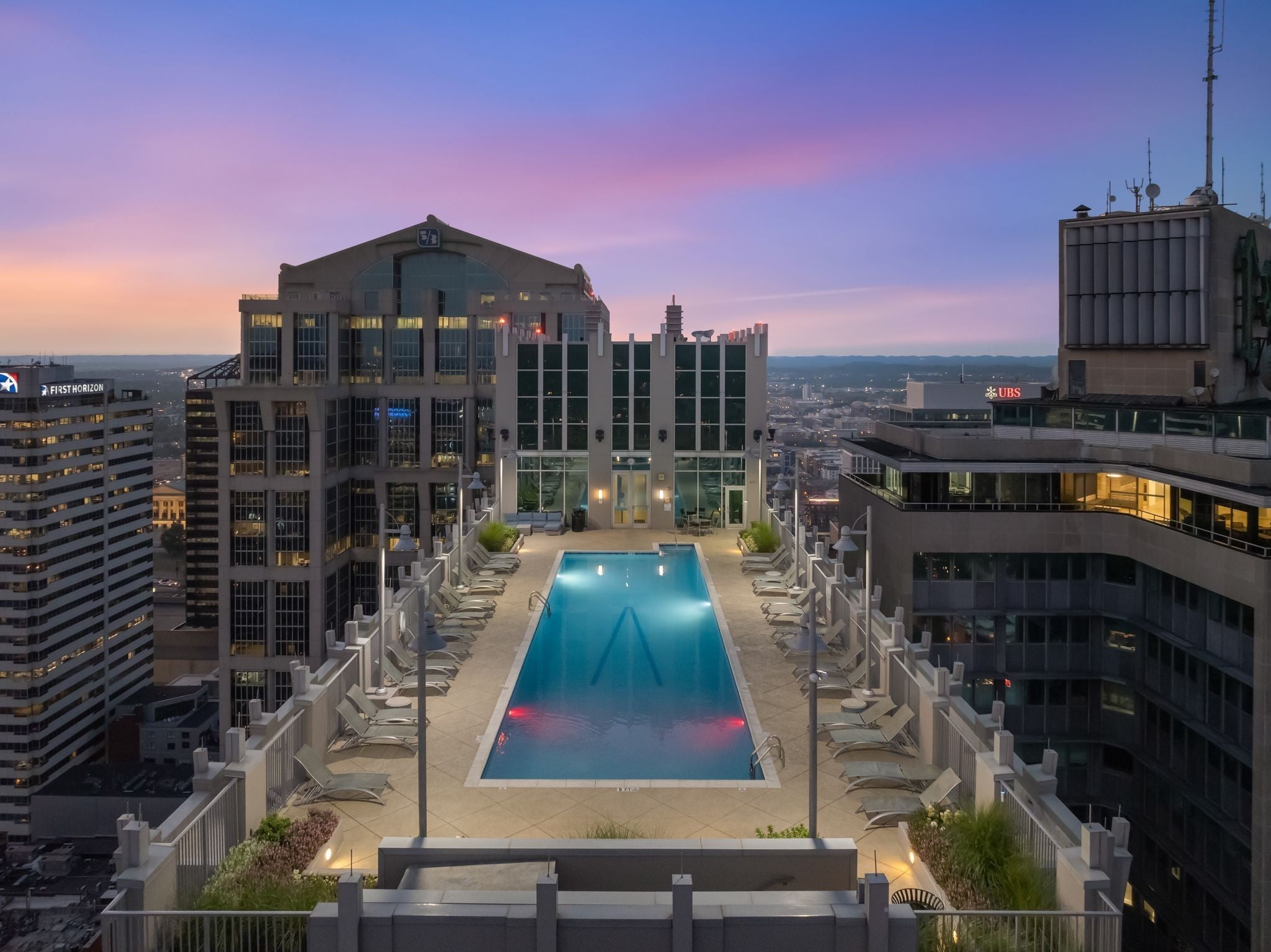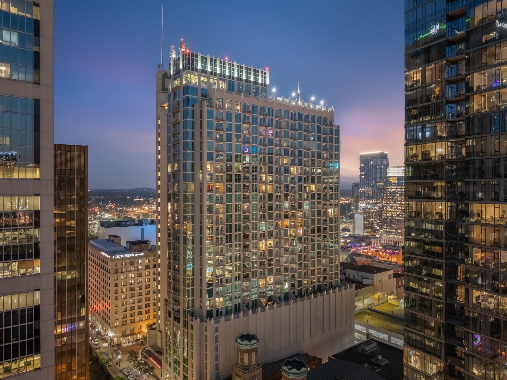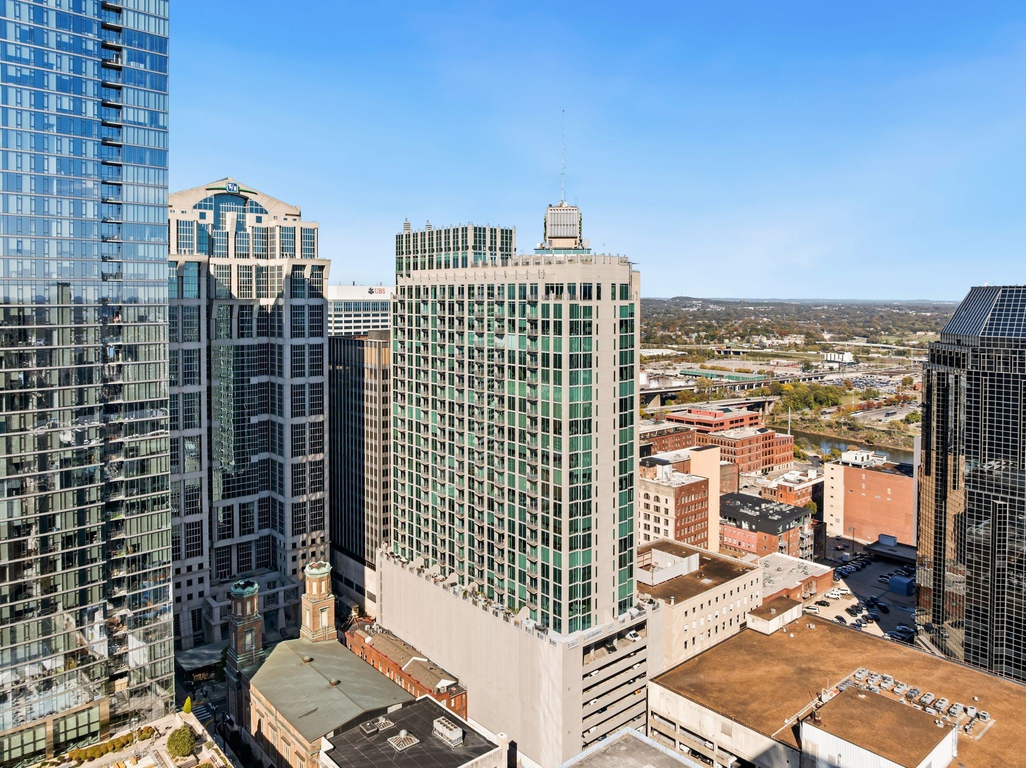 This two bedroom, corner unit has incredible views from every room with incredible floor-to-ceiling windows. This open concept living condo is filled with natural light and was recently updated with new floors, fresh paint, upgraded light fixtures and new countertops. The pet-friendly Viridian building is filled with amenities including a 24/7 concierge, rooftop pool and fitness center, rooftop club space and more. Walkable to Printers Alley, Bridgestone, Ryman Auditorium, Fifth & Broad, and some of the city’s best restaurant scenes, this is a rare opportunity to have luxury downtown living at an unbeatable price. This unit includes two parking spaces just steps away from the elevator!
