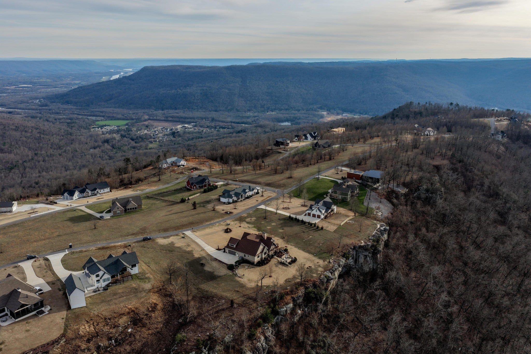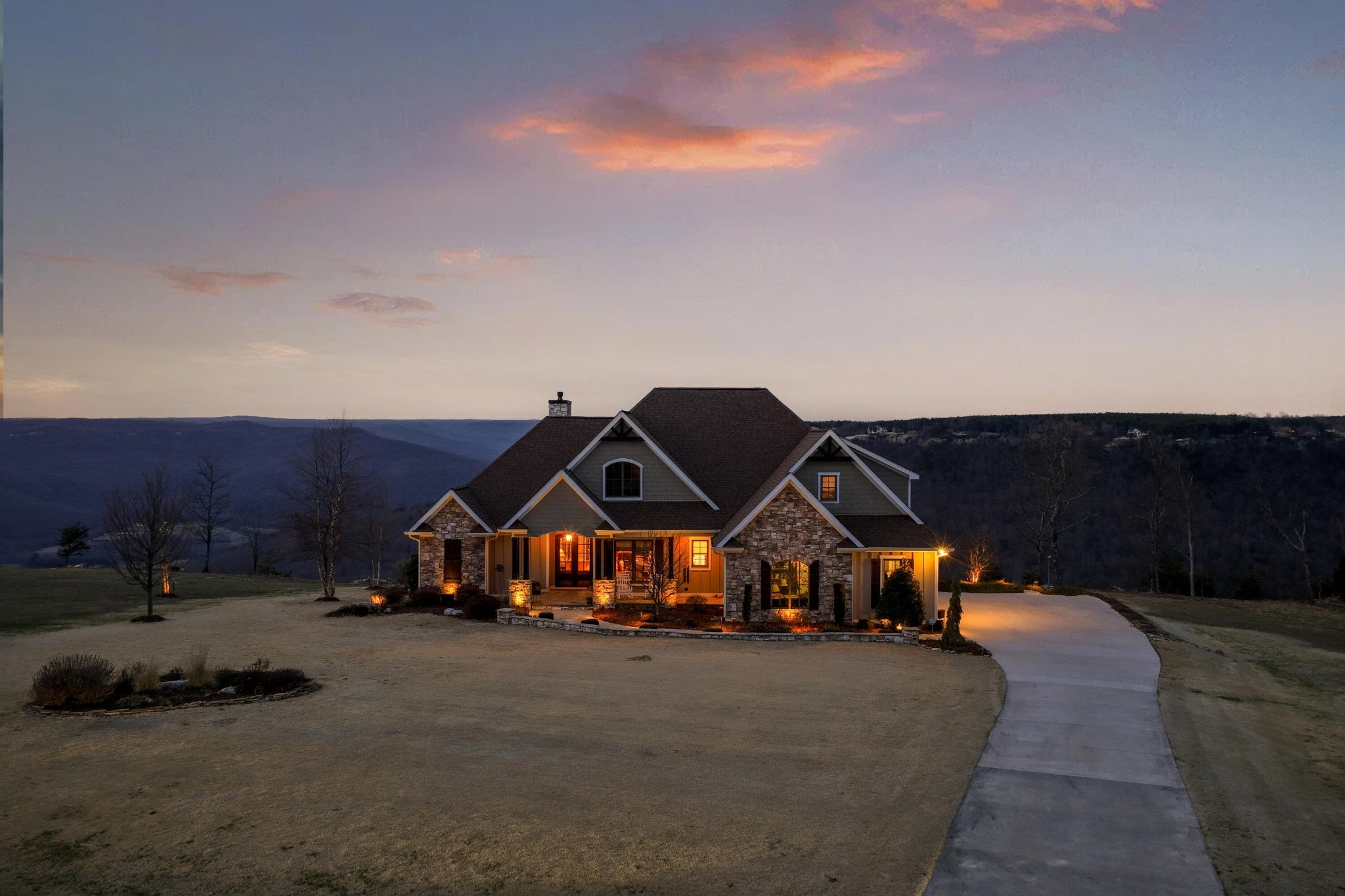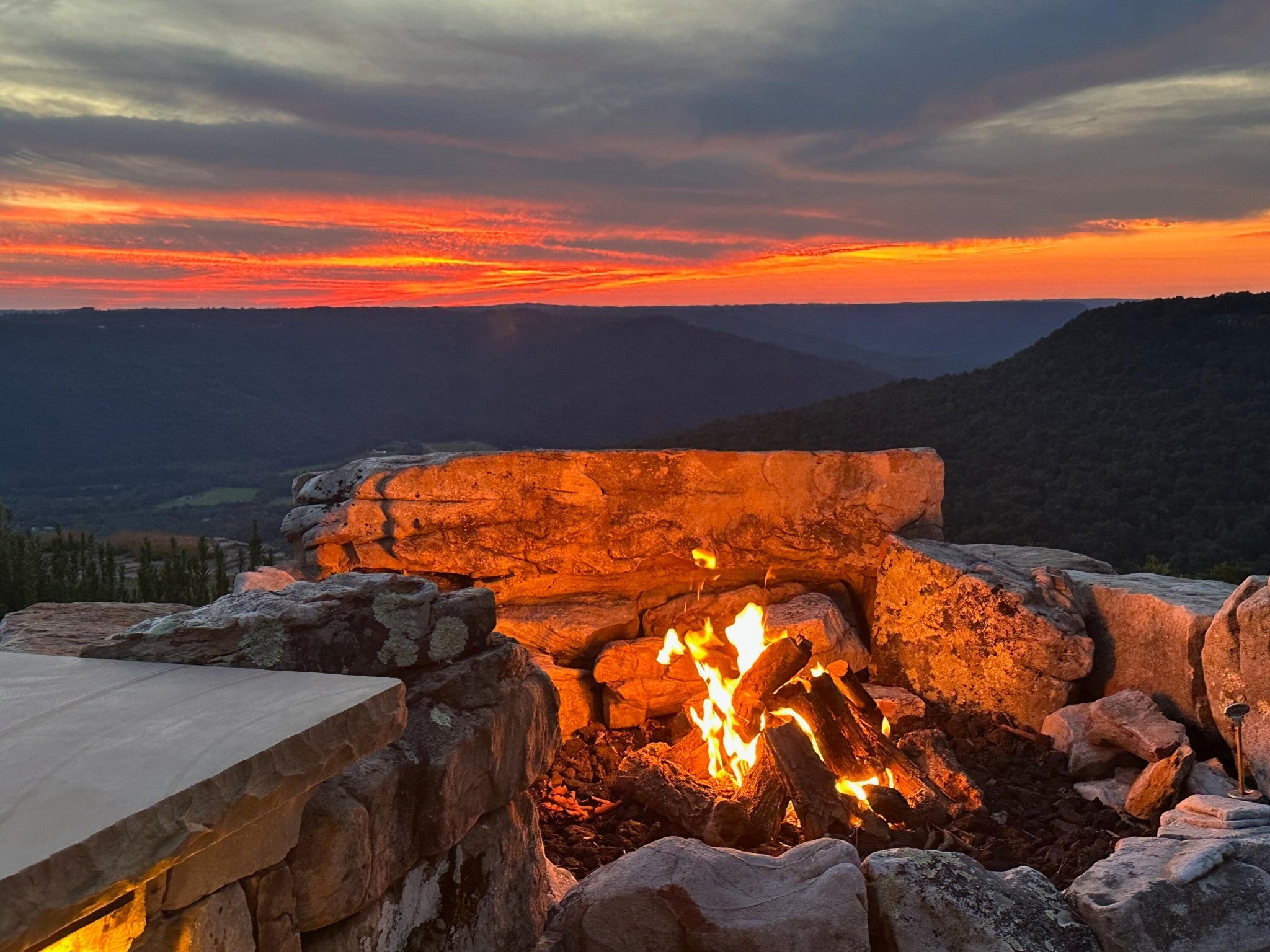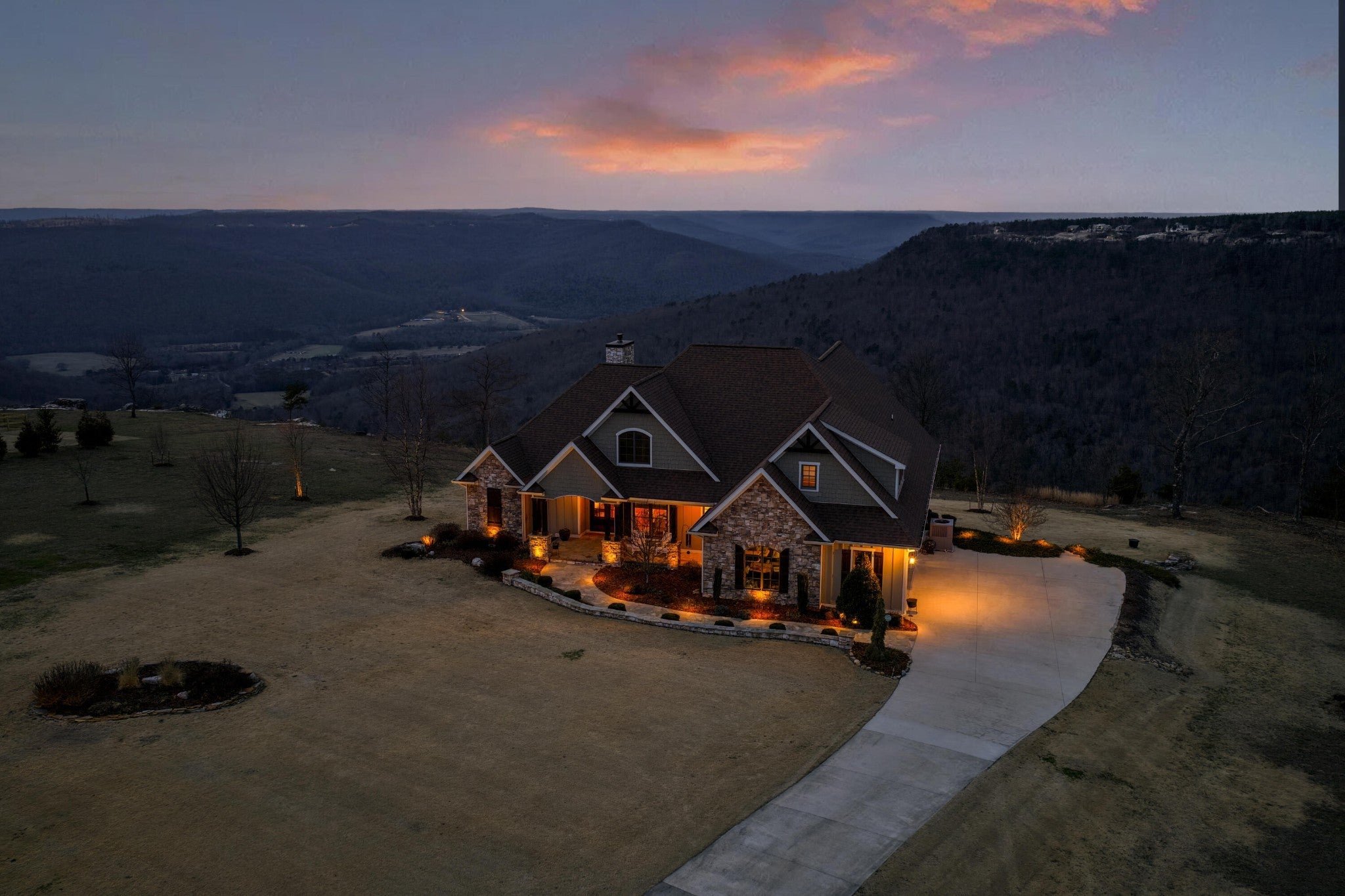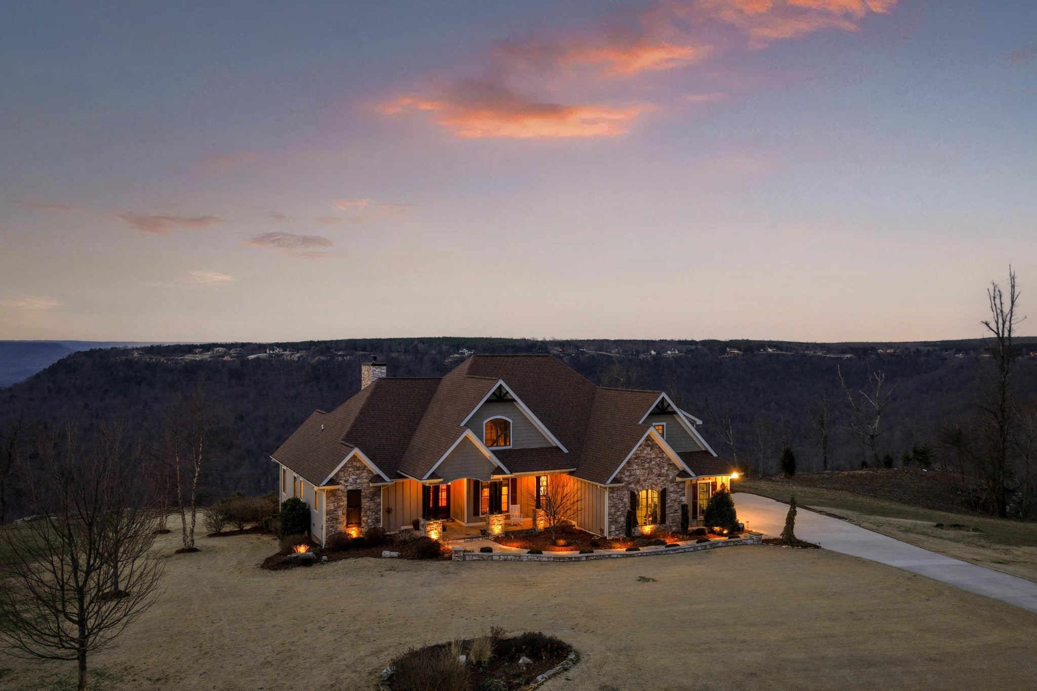 Endless Mountain Views from a Quiet Bluff Retreat Extraordinary Bluff Estate | 325+ Ft Brow Frontage, Quiet Mountain Setting, 1.8 Acres, Sweeping Plateau & Valley Views Perched along one of the most coveted bluff lines in Jasper Highlands, 985 Sunset Circle offers a rare opportunity to experience luxury mountain living on 1.8 private acres with over 325 feet of exceptional brow frontage on a quiet mountain peninsula. From this extraordinary vantage point, breathtaking panoramic views unfold across the Cumberland Plateau and deep into the Sequatchie Valley, creating a dramatic landscape of rolling mountains, expansive skies, and unforgettable sunsets. Uniquely positioned on the brow, the property enjoys both inspiring sunrises and spectacular sunsets, filling the home with ever-changing mountain light throughout the day. Thoughtfully designed to capture the scenery, inspiring mountain views are enjoyed from many of the home's primary living spaces, creating a constant connection to the surrounding landscape. Designed to embrace its spectacular setting, the home features multiple outdoor living spaces positioned to capture the remarkable bluff views. Just off the living room, a covered bluff-side deck provides an elevated vantage point for enjoying the surrounding mountains and valley below. Vaulted hardwood ceilings and custom-designed motorized blinds create a comfortable setting for relaxing or entertaining while immersed in the scenery. Below the deck, a beautifully crafted flagstone patio offers an inviting outdoor retreat surrounded by the natural beauty of the bluff and enhanced by thoughtfully designed mature landscaping that complements the natural mountain setting. A dramatic gas fire pit crafted from locally sourced mountain rock creates the perfect setting for evening gatherings beneath the stars, while a custom cascading waterfall feature provides a striking natural centerpiece, its gentle flow adding a soothing soundtrack to this tranquil out