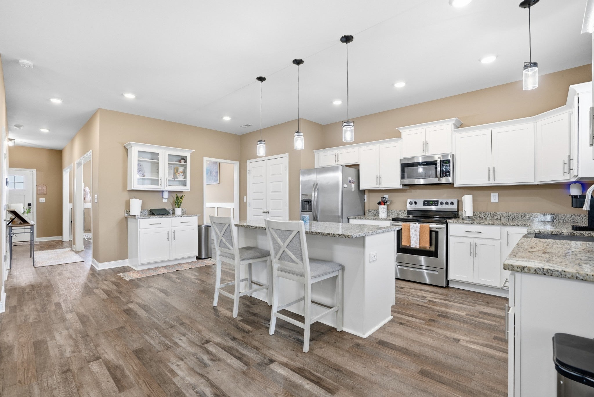 - Electric Oven, Range, Dishwasher, Disposal, Ice Maker, Microwave, Refrigerator, Stainless Steel Appliance(s)
