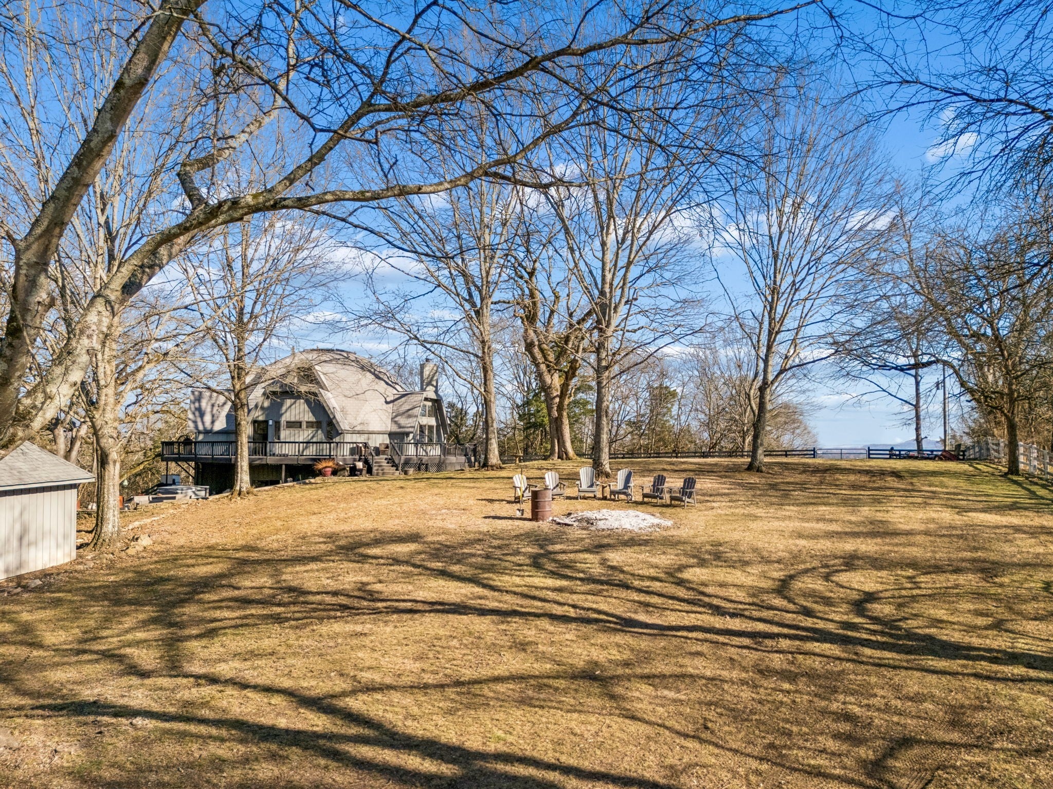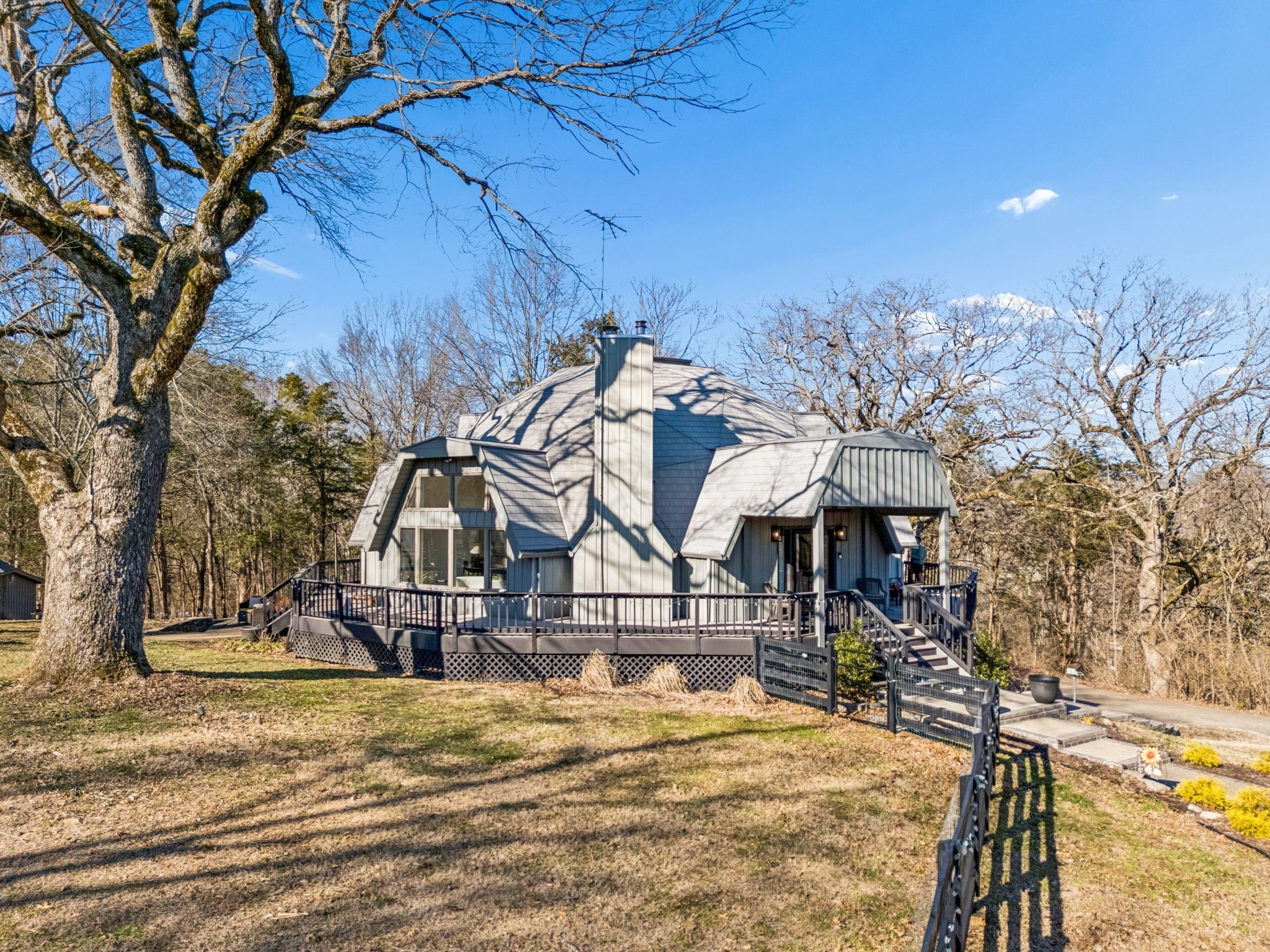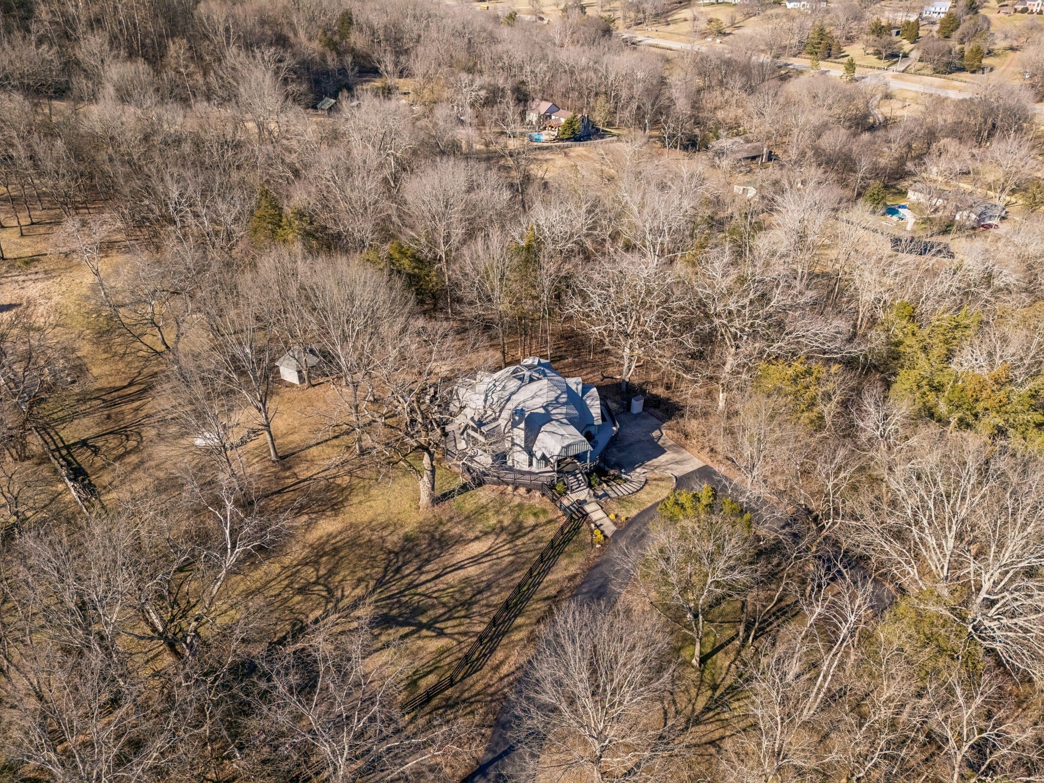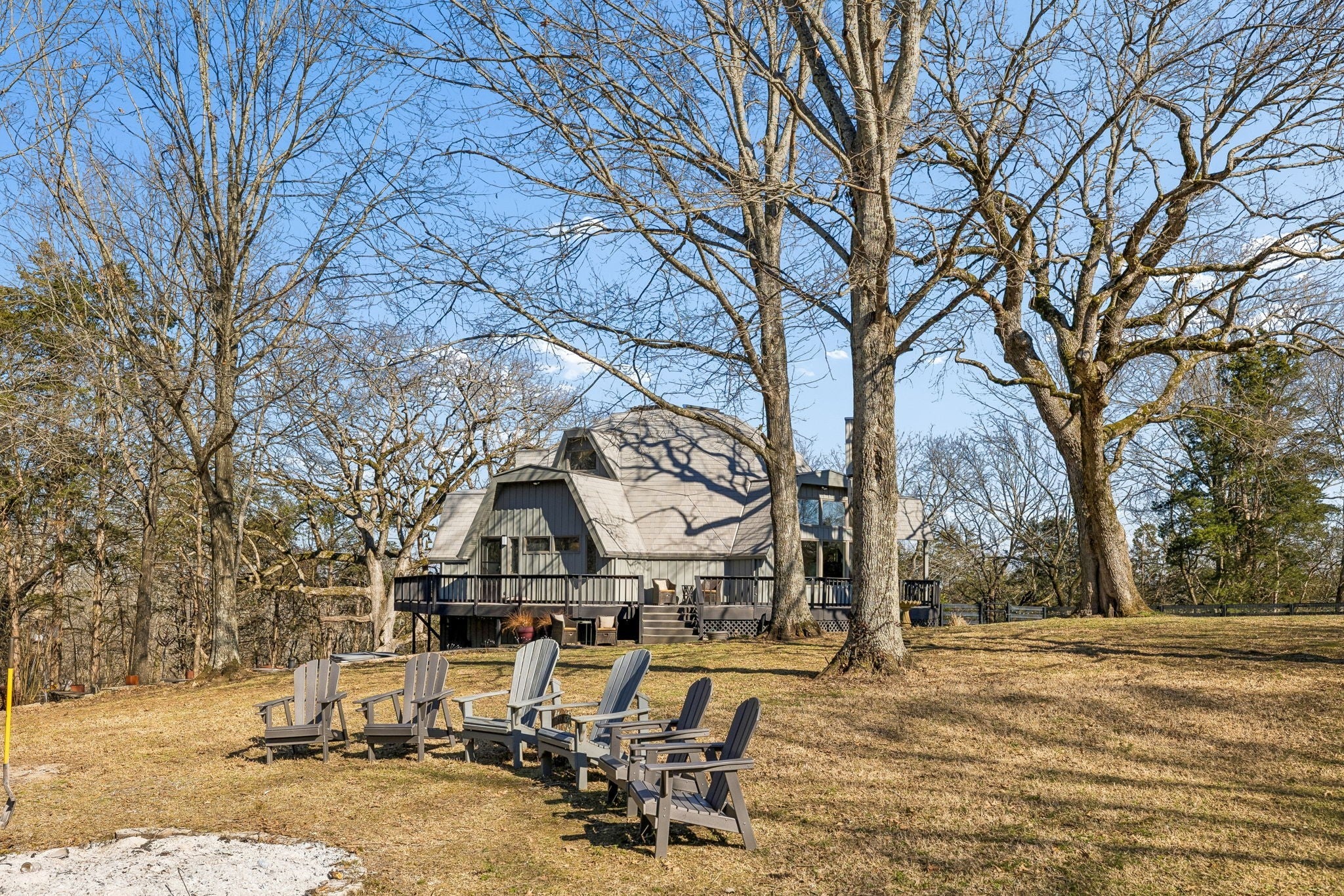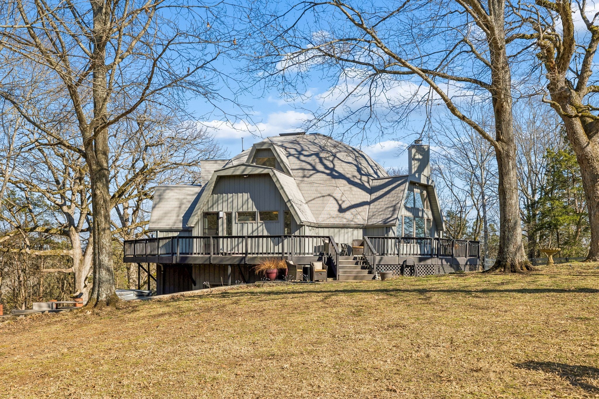 Tucked away on 5 private acres in the heart of Leipers Fork, this rare and architecturally striking geodesic dome home offers the perfect blend of privacy, sustainability, and convenience. Located less than 5 minutes from Leipers Fork Market, Westhaven, restaurants, shopping, and medical offices—and just a short drive to Franklin—this property delivers peaceful country living without sacrificing accessibility. Perched atop a scenic hill with beautiful views, the thoughtfully updated home spans nearly 4,300 square feet across three levels with 3 bedrooms, multiple flex spaces, and a fully finished walkout basement. Natural light floods the interior, highlighting the dome’s distinctive architecture and creating a space that feels like a private retreat. The main level features a welcoming living room with fireplace, updated kitchen with hidden pantry and coffee bar, spacious primary suite, and oversized laundry room. Upstairs offers two bedrooms and a loft ideal for a reading nook or creative workspace. The walkout basement provides exceptional flexibility with a second living area and fireplace, kitchenette, and two flex rooms perfect for a home office, guest quarters, gym, or studio—ideal for multigenerational living or Airbnb potential. Outdoor living truly sets this property apart: a wraparound weatherproof deck, hardscape patio for al fresco entertaining, and a fire pit tucked among the trees for star-filled Tennessee nights. The grounds include a gardening shed, chicken coop, and dedicated garden area utilizing reclaimed water—perfect for homesteading enthusiasts. Energy efficiency meets innovation with geothermal heating and cooling, significantly reducing utility costs while supporting a more sustainable lifestyle. A one-of-a-kind Leipers Fork home offering acreage, views, modern updates, income potential, and eco-conscious features—this is elevated Tennessee living at its finest.