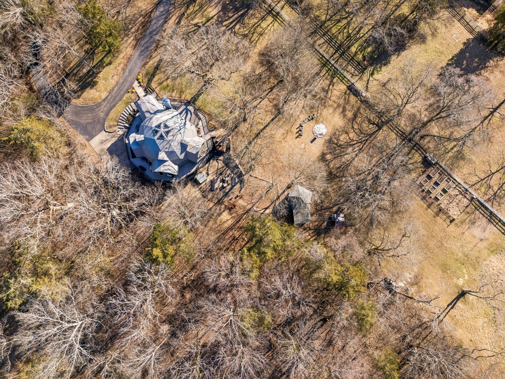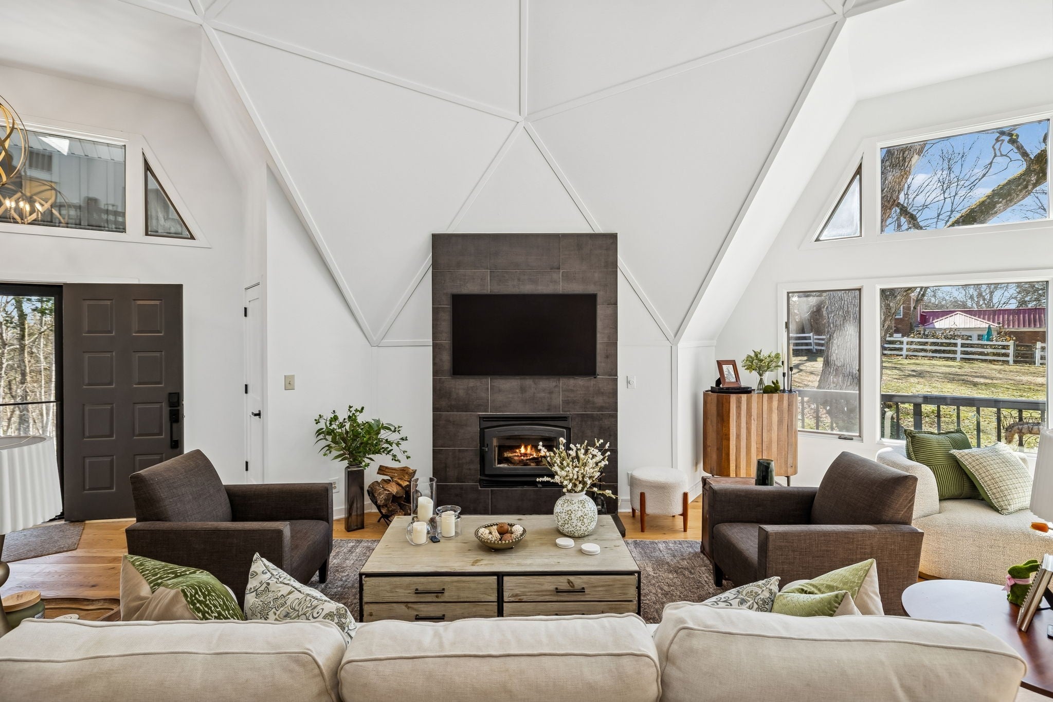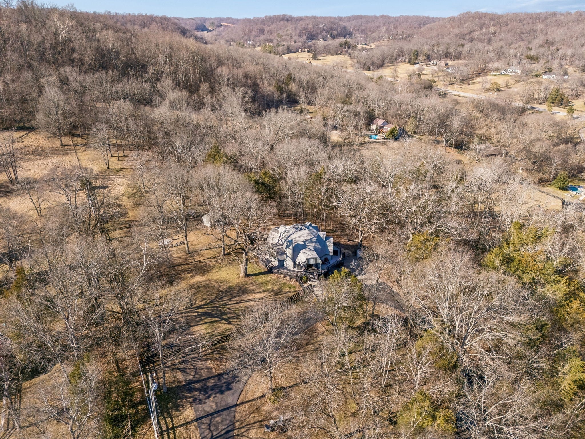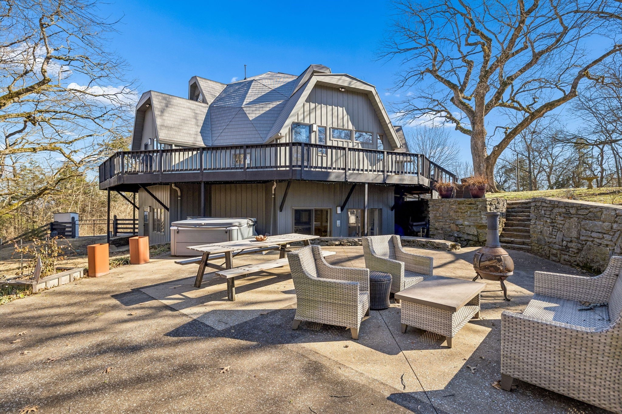 Tucked away on 5 private acres in the heart of Leipers Fork, this rare and architecturally striking geodesic dome home offers the perfect blend of privacy, sustainability, and convenience. Located less than 5 minutes from Leipers Fork Market, Westhaven, restaurants, shopping, and medical offices—and just a short drive to Franklin—this property delivers peaceful country living without sacrificing accessibility. Perched atop a scenic hill with beautiful views, the thoughtfully updated home spans nearly 4,300 square feet across three levels with 3 bedrooms, multiple flex spaces, and a fully finished walkout basement. Natural light floods the interior, highlighting the dome’s distinctive architecture and creating a space that feels like a private retreat. The main level features a welcoming living room with fireplace, updated kitchen with hidden pantry and coffee bar, spacious primary suite, and oversized laundry room. Upstairs offers two bedrooms and a loft ideal for a reading nook or creative workspace. The walkout basement provides exceptional flexibility with a second living area and fireplace, kitchenette, and two flex rooms perfect for a home office, guest quarters, gym, or studio—ideal for multigenerational living or Airbnb potential. Outdoor living truly sets this property apart: a wraparound weatherproof deck, hardscape patio for al fresco entertaining, and a fire pit tucked among the trees for star-filled Tennessee nights. The grounds include a gardening shed, chicken coop, and dedicated garden area utilizing reclaimed water—perfect for homesteading enthusiasts. Energy efficiency meets innovation with geothermal heating and cooling, significantly reducing utility costs while supporting a more sustainable lifestyle. A one-of-a-kind Leipers Fork home offering acreage, views, modern updates, income potential, and eco-conscious features—this is elevated Tennessee living at its finest.