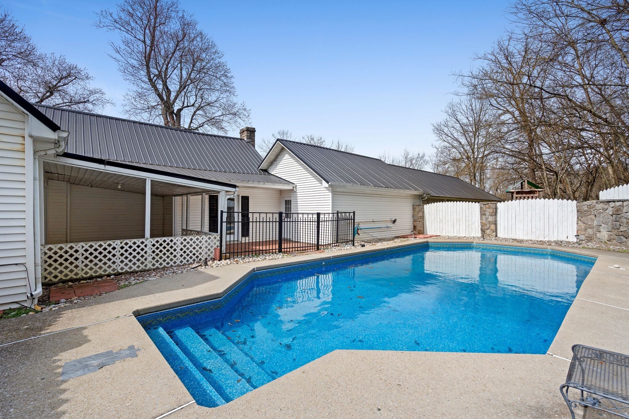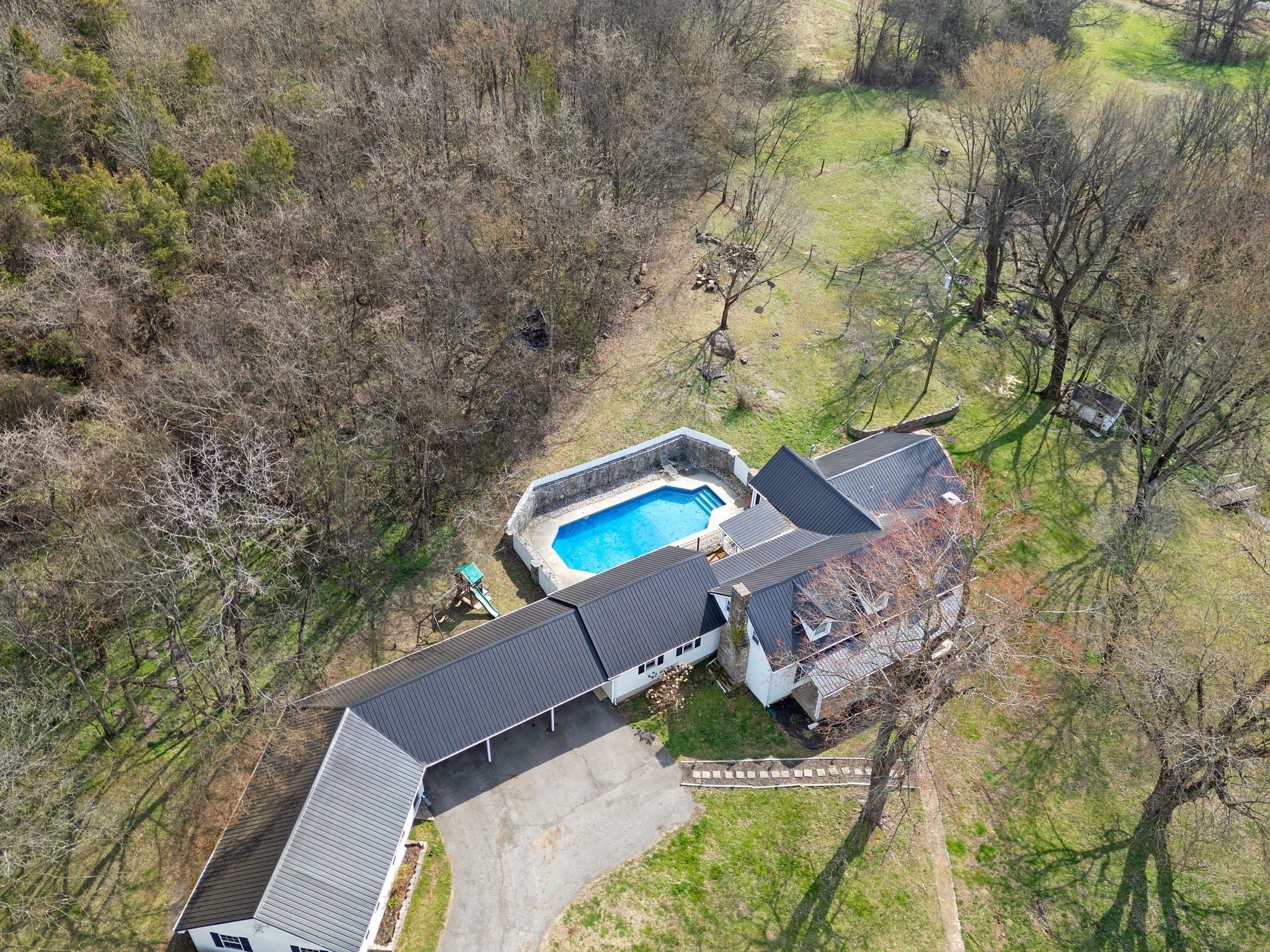 Charming country living on nearly 15 acres of beautiful rolling land! Experience the serenity of rural living surrounded by mature trees, open green space, and peaceful countryside views. This classic farmhouse-style home offers a welcoming front exterior with durable metal roof accents and timeless architectural charm. Step inside to discover a bright and inviting gathering space featuring warm wood flooring, expansive windows, and French doors that fill the home with natural light. The elegant staircase adds a touch of classic design, while the arched opening creates a seamless flow into the next living area. The dining space offers a refined yet comfortable setting for everyday meals and special occasions. The kitchen is designed for both style and function, showcasing stainless steel appliances, updated countertops, and abundant cabinet storage. A sunlit sunroom provides the perfect place to relax, read, or enjoy views of the surrounding landscape. The main level also features a full bathroom and a primary bedroom with built-in shelving, offering convenient single-level living if desired. Upstairs, you’ll find an additional cozy room with charming sloped ceilings, carpet flooring, and a full bathroom, making it an ideal space for a home office, guest area, or flexible living space. Outdoor living is a highlight, with a covered patio overlooking the in-ground pool and privacy fencing—perfect for enjoying warm days in comfort. The brick patio seating area and scenic creek view with a small footbridge add to the property’s tranquil character. Set in a peaceful location with tree-lined surroundings and open spaces, this property offers a wonderful opportunity to enjoy private, natural living while still embracing modern comforts. Seller can close quickly!