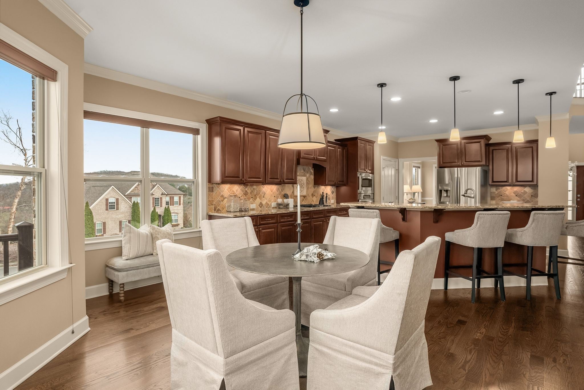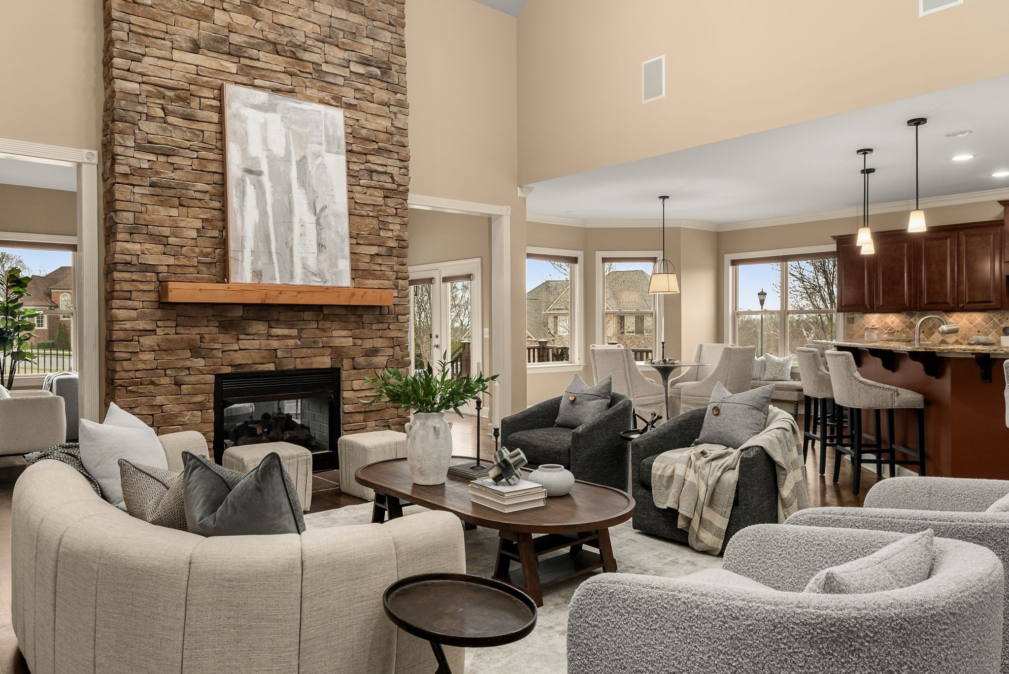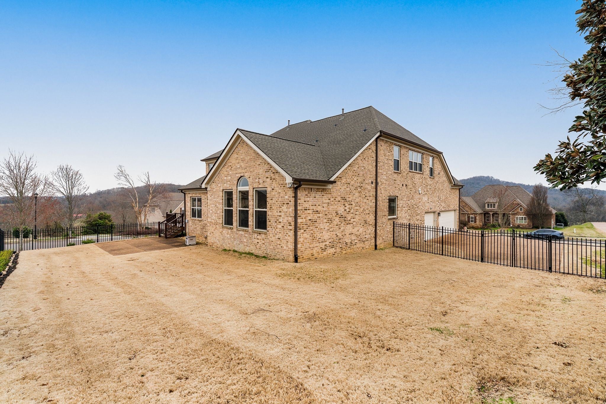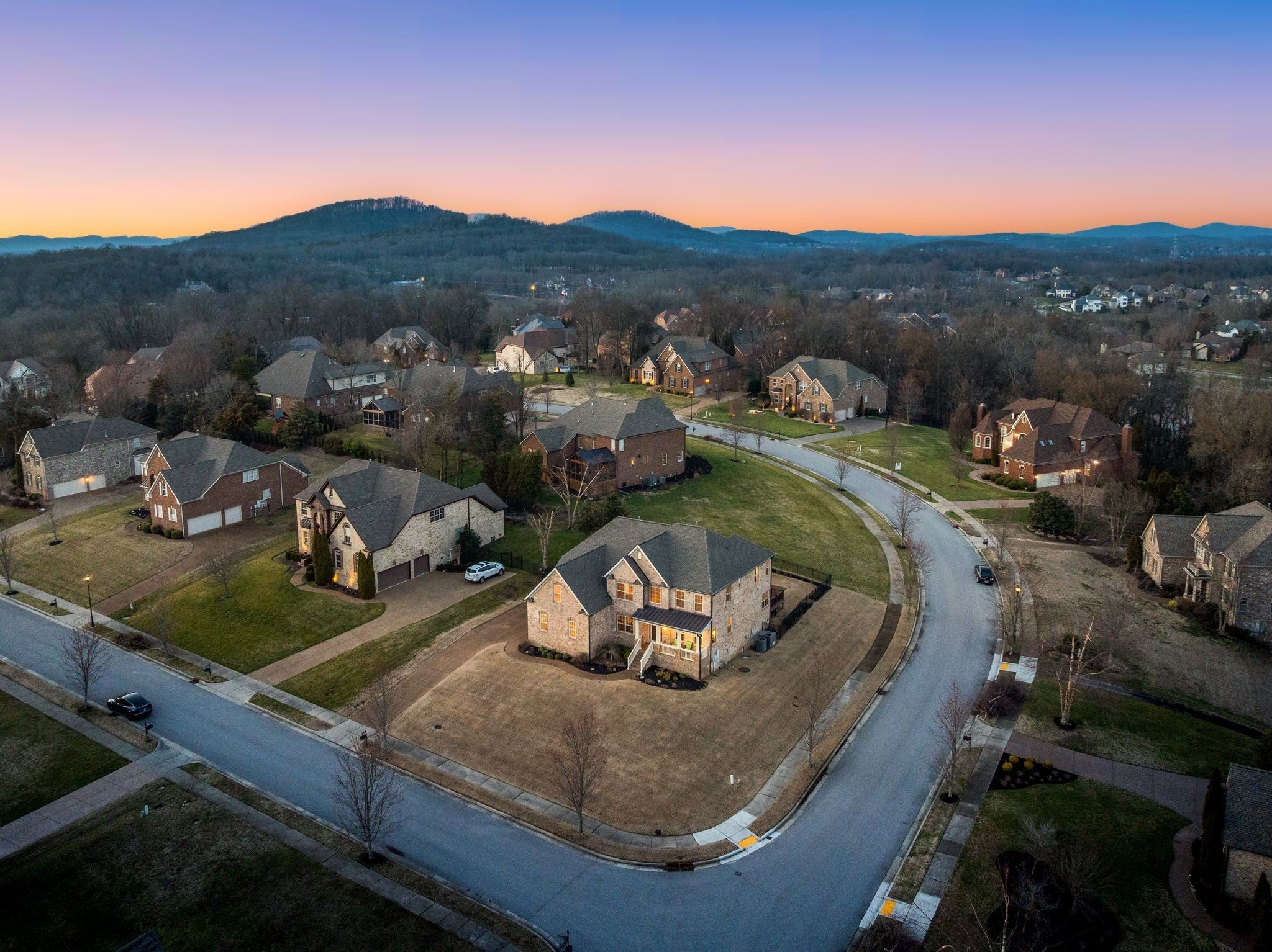 Perched at one of the highest elevations in the neighborhood with sweeping views and sunsets, this Brentwood residence stands apart for both its setting and exceptional care. From the stately brick façade to the welcoming front porch overlooking rolling landscape, the home offers a rare sense of elevation and privacy. Inside, soaring ceilings, expansive windows added to the original floor plan, and an open layout fill the home with natural light and create an effortless sense of space. The two-story great room, anchored by a double-sided stacked stone fireplace, delivers architectural presence while remaining warm and inviting. Hardwood floors and refined finishes carry throughout the main level. The kitchen flows seamlessly into the living areas with generous counter space, abundant cabinetry, and an oversized island designed for gathering. A dedicated main-level office provides privacy for work or study. Upstairs, spacious secondary bedrooms are complemented by a large bonus room and additional flex space that can function as a home office, gym, playroom, or potential fifth bedroom. The primary suite offers a comfortable retreat with a well-appointed bath and ample closet space. Beyond aesthetics, this home reflects exceptional stewardship. The roof and HVAC systems have been updated since 2023, a tankless water heater adds efficiency, new carpet enhances comfort, and the home has been consistently inspected and meticulously maintained. Upgraded insulation and a conditioned, encapsulated crawl space further improve comfort and efficiency. Situated on a 0.42-acre lot, the elevated setting maximizes privacy and views while a three-car garage provides everyday functionality. Located in the highly sought-after Sonoma community and zoned for Jordan Elementary and Ravenwood High School with convenient access to parks, trails, and I-65. Homes offering this level of care and setting do not come along often.