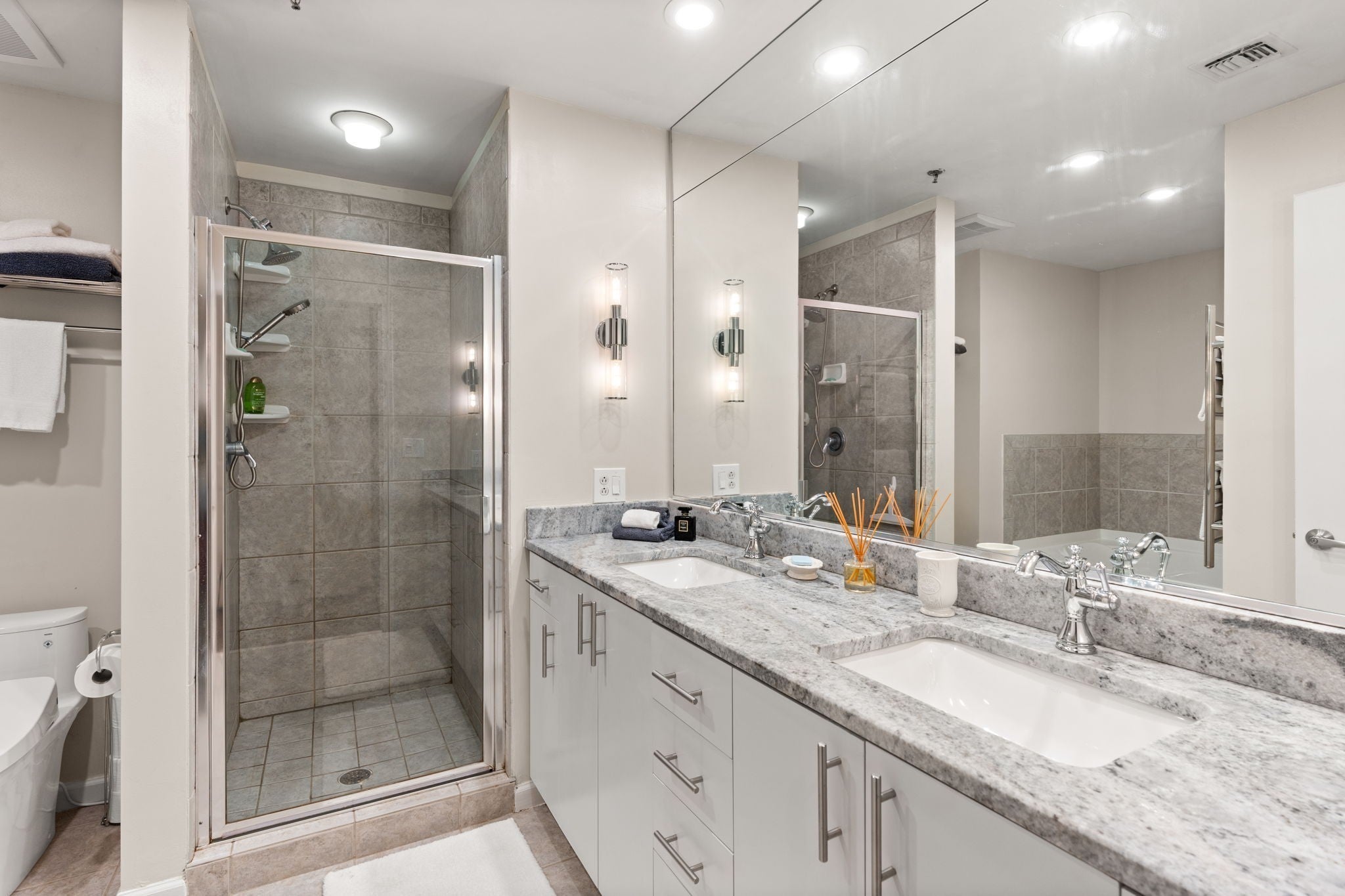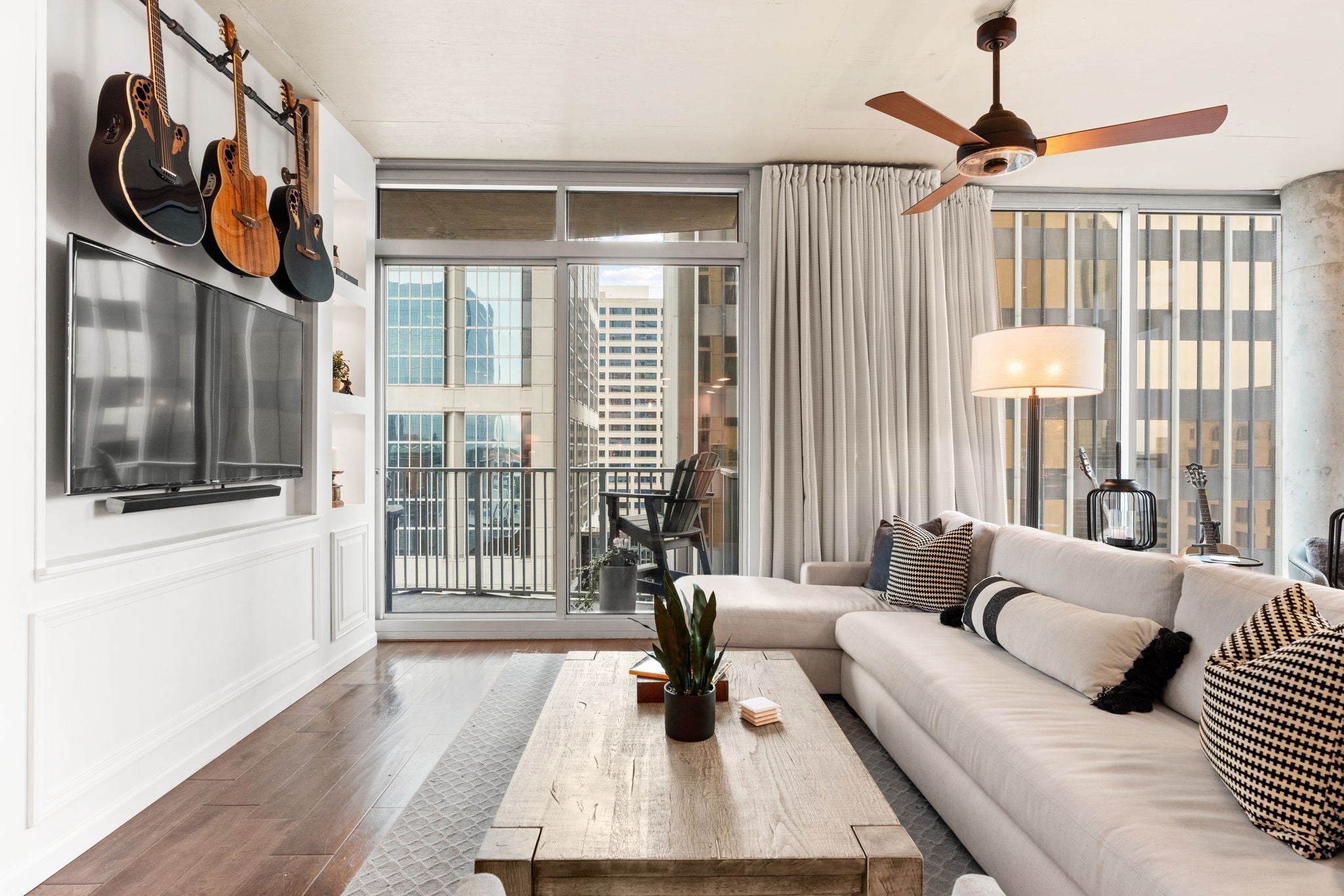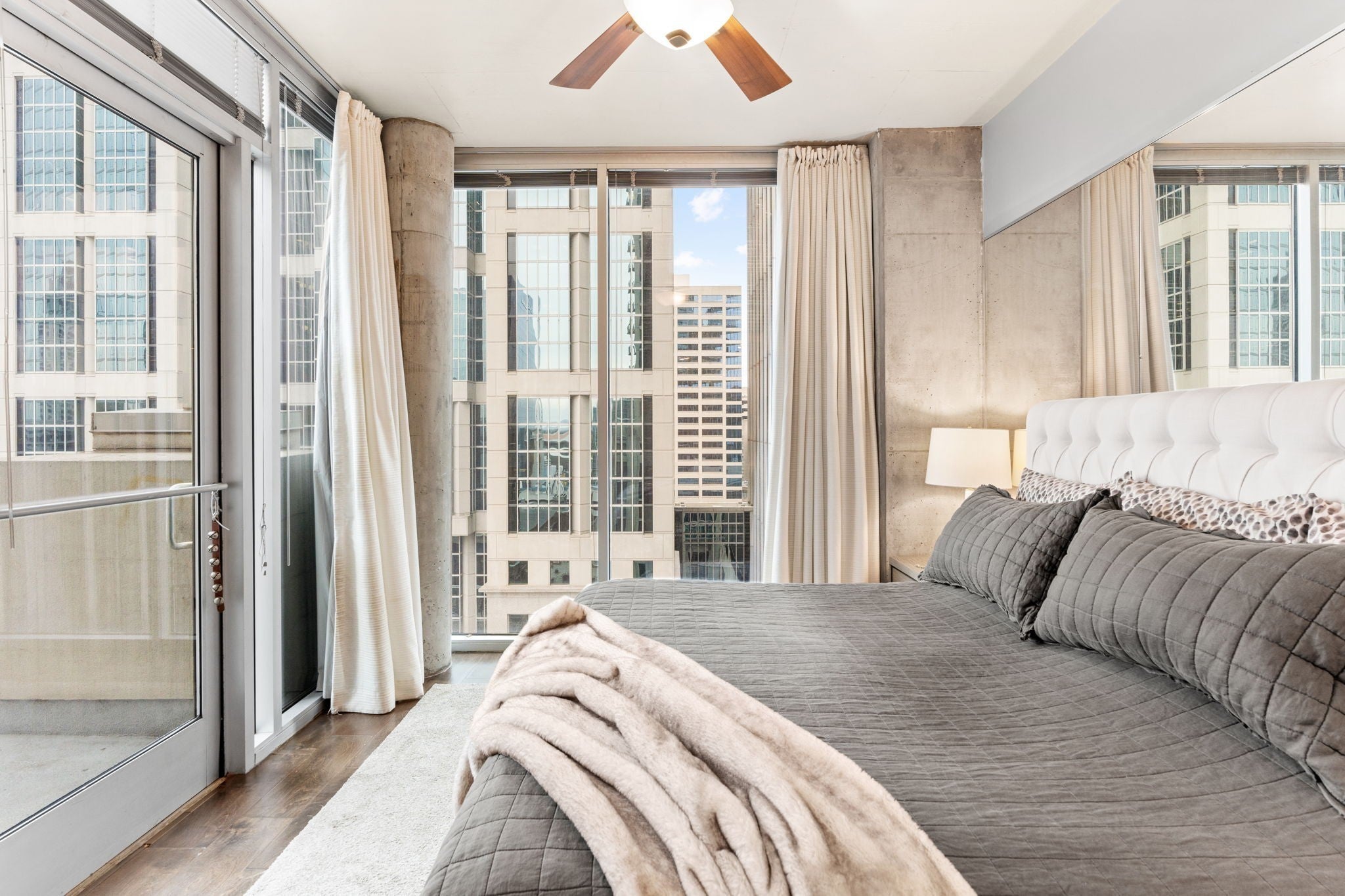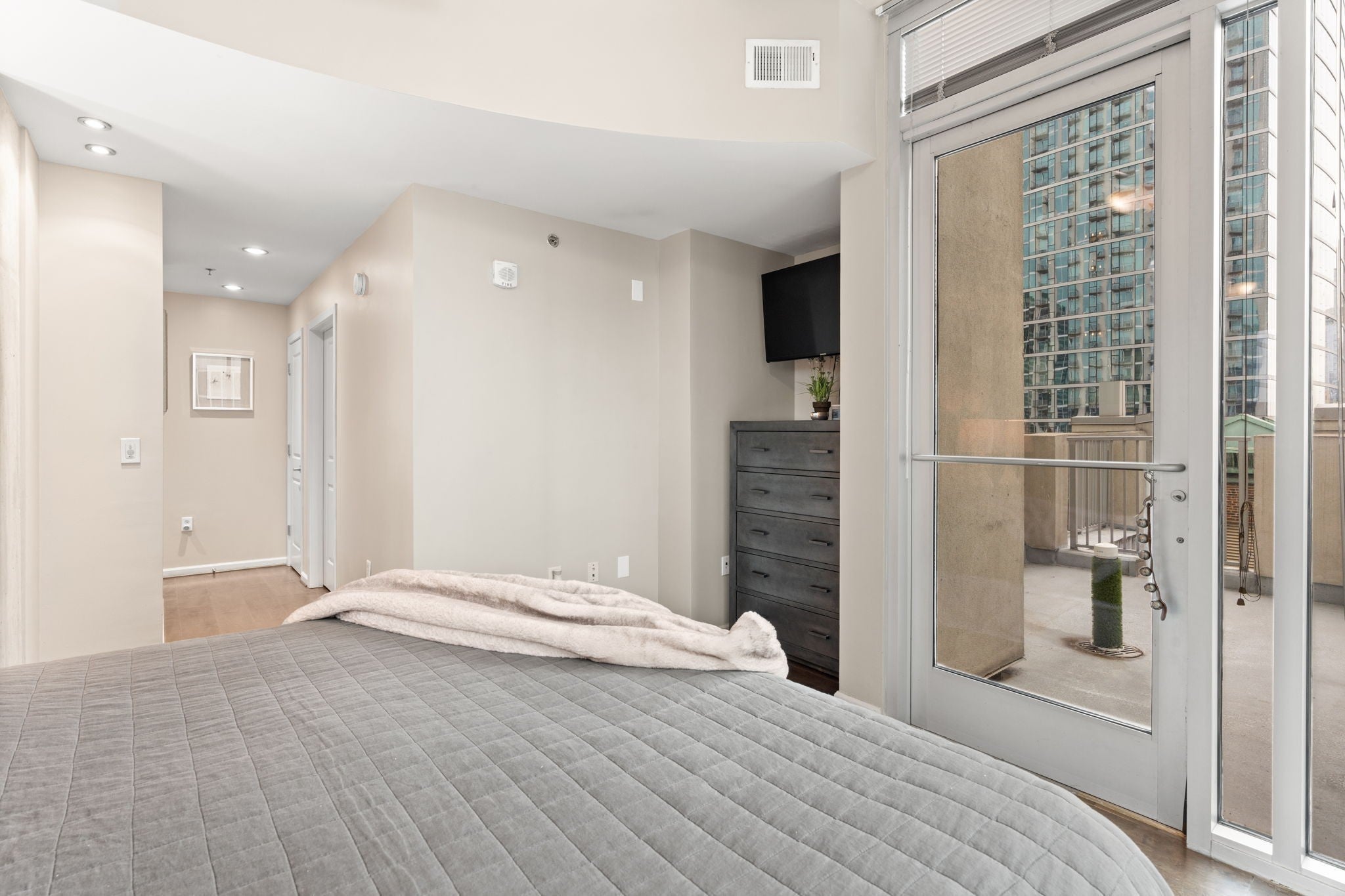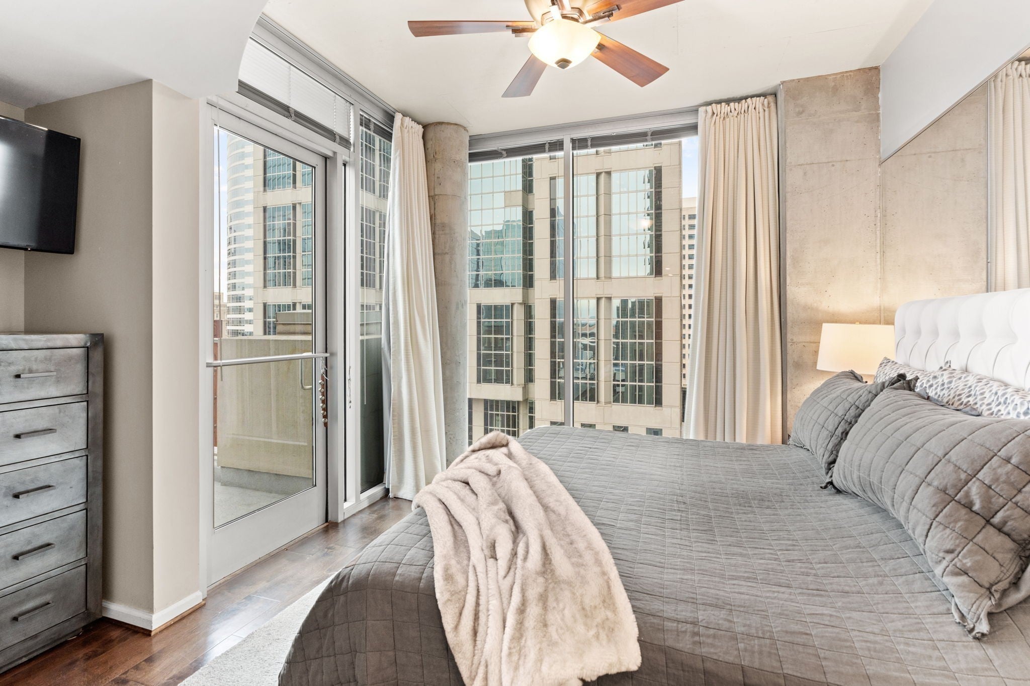 LARGE CORNER UNIT with 3 balconies in prime downtown Nashville location!! Seller offering $15,000 in concessions for flooring/paint or to use for closing costs. This large 2 bedroom, 2 bath corner unit lives like a home, with a private primary bedroom and ensuite bath. The 31st floor pool anchors the amenity package at the Viridian, including a gym overlooking the city and a clubroom with catering facilities. Two deeded parking spots on a lower parking level convey with the property. The condo is perfectly situated in the heart of downtown Nashville and walkable to Ryman, Bridgestone, the new Titans Stadium, the renovated Arcade, Nashville Yards, and the lights of Broadway! Schedule a showing today and enjoy all downtown Nashville has to offer!