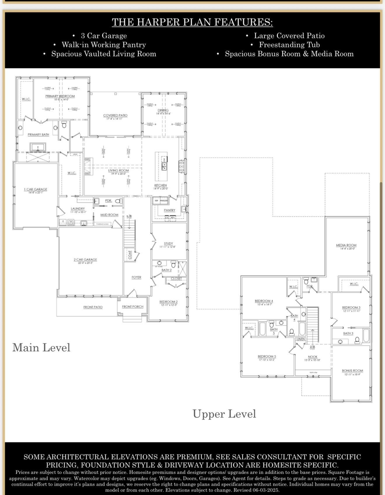 The Harper plan features a vaulted Family room, Primary suite and Dining room with white oak beams. Great room fireplace with built-in bookcases and cabinets. First floor has the Primary suite, Guest suite and office. The enormous kitchen has premium style driven appliances. There is a large covered outdoor living space off the Great room. The second floor features a Reading nook, 3 bedrooms with en-suite baths, a bonus room and a Media room.