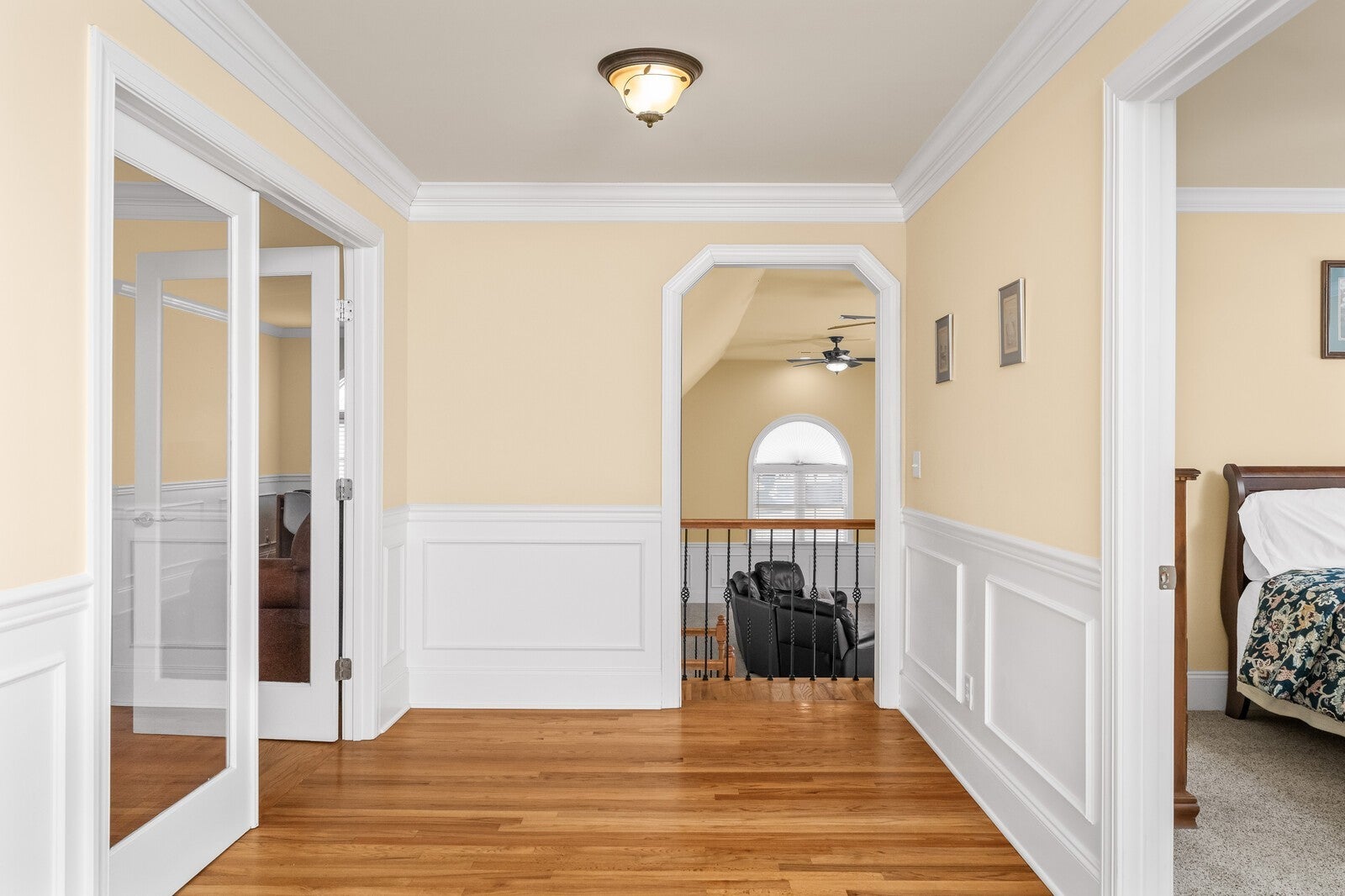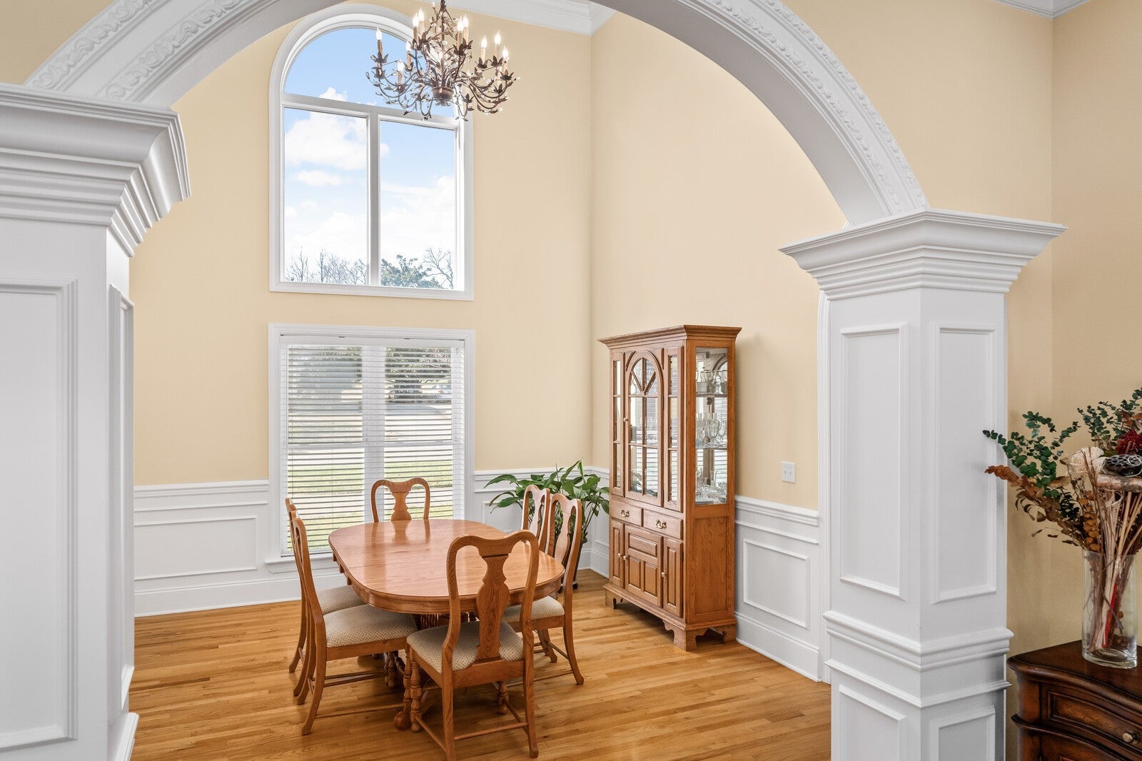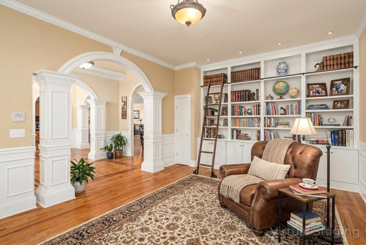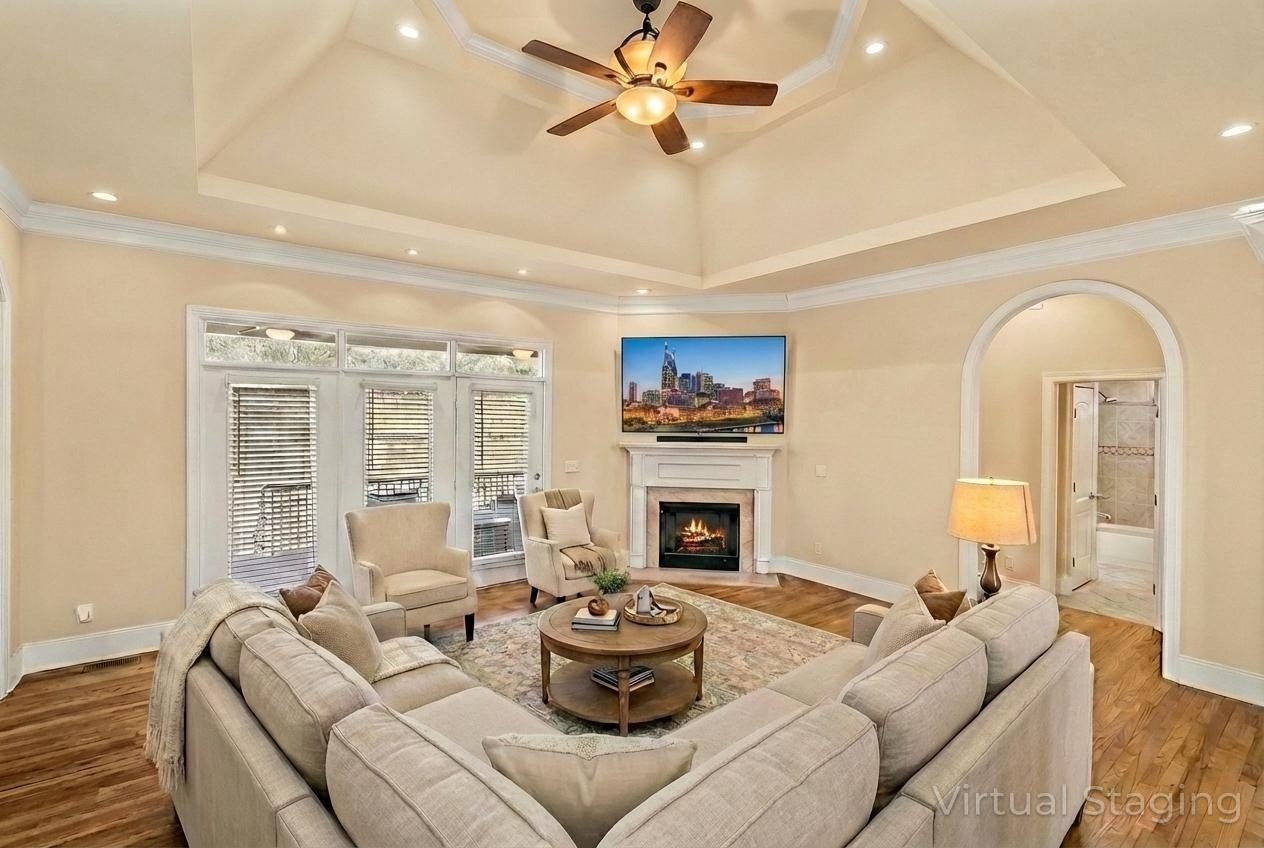 Cleveland Hall offers a lifestyle rooted in Middle Tennessee history and surrounded by premier recreation. This exclusive neighborhood overlooks Hermitage Golf Course, Tennessee’s top-rated public course known for its unique "General’s Retreat" and the free-range sheep that roam the fairways. For an even more elevated experience, the nearby Old Hickory Country Club and Old Hickory Lake provide private golf, social memberships, and easy access to boating and water sports. This 1.25-story brick residence presents a three-gable Craftsman silhouette with a circular drive and side-entry three-car garage, complete with EV charging and a dedicated RV pad with 220V power. The interior begins with a grand foyer flanked by a den with built-in bookshelves and a formal dining room with 20-foot ceilings. The main level centers on a living room with a fireplace, deep tray ceilings, and plantation shutters that open to the back porch. The kitchen features an island cooktop, maple cabinetry, and a second full-sized dining room surrounded by backyard views. The primary suite offers tray ceilings and a bathroom with a whirlpool tub inset into a tiled archway, a separate tiled, walk-in multi-head shower, and independent vanities and closets. A separate guest or in-law suite with a full bath is located on the opposite side of the home. The upper levels provide flexible space without the footprint of a full second story. A large, vaulted bonus room includes a built-in entertainment center, while a separate wing houses two additional bedrooms, a full bath, and a private flex room. Practical additions include hardwood oak floors, an intercom system, central vac, and a laundry room with a wash tub. The backyard featuring a recessed porch leading to an extended patio sits below a wooded hillside. As seen in the photos, the low-traffic short-line rail offshoot is tucked behind a thicket at roof level, remaining out of sight and inaccessible from the lawn. Tour today!