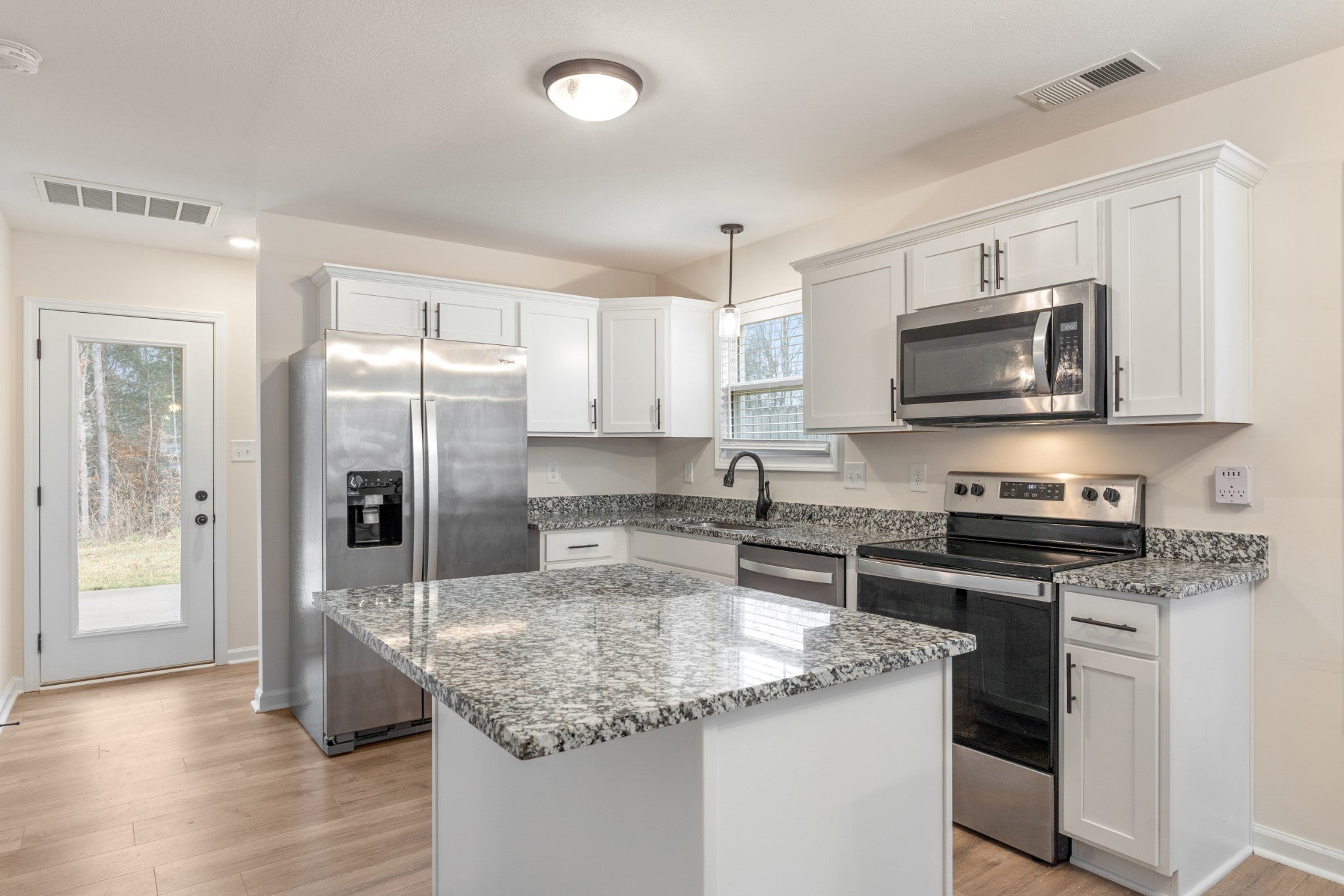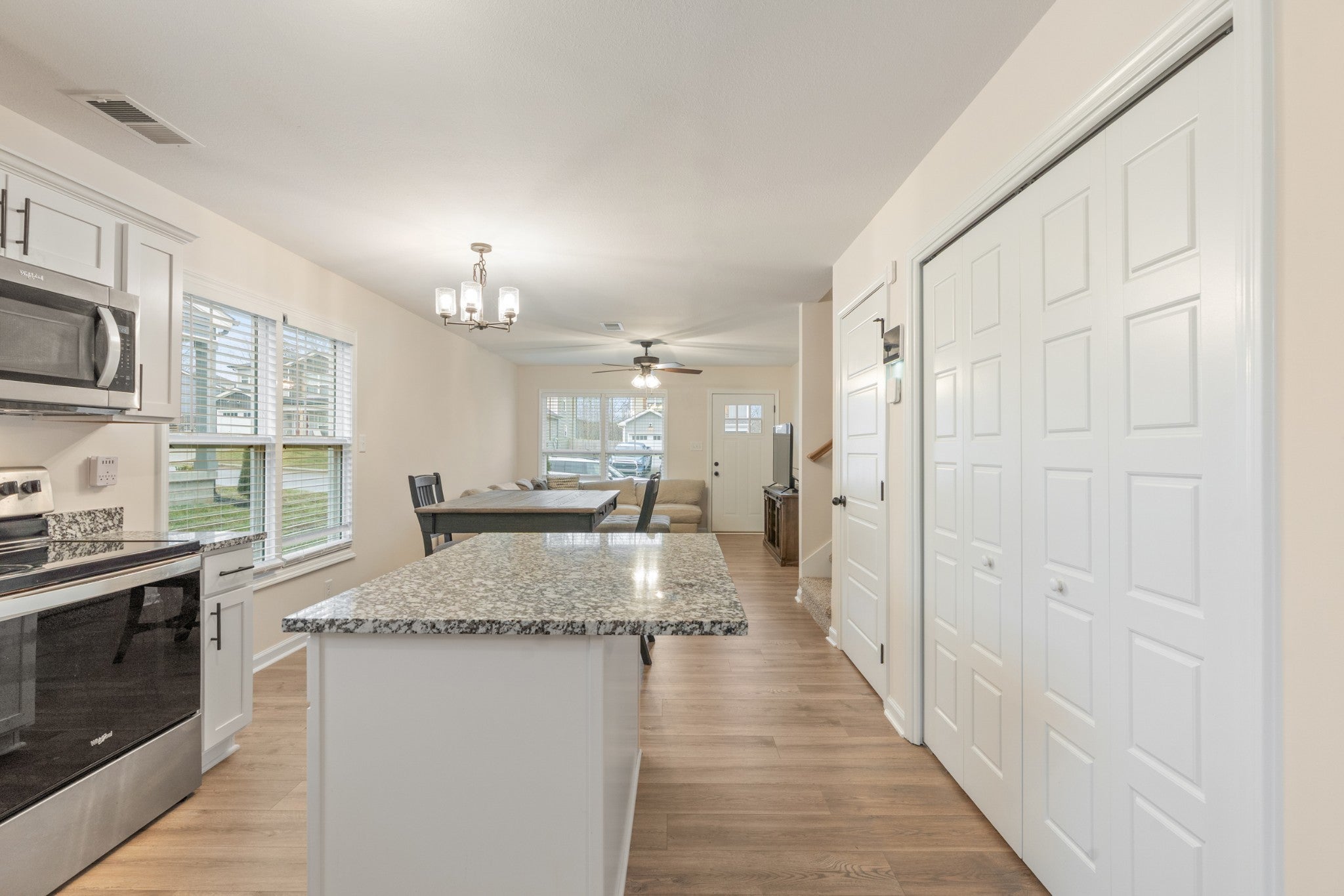 Conveniently located just minutes from Riverside and Downtown Clarksville, this charming home offers both comfort and accessibility to local dining, shopping, and entertainment. Inside, you’ll find a well-designed layout featuring 3 bedrooms and 2.5 bathrooms with stylish finishes throughout. The kitchen is equipped with stainless steel appliances including a stove, dishwasher, and range microwave, complemented by beautiful granite countertops that continue throughout the home. Durable LVT flooring runs across the main level, providing both style and easy maintenance. Step outside to a back patio that overlooks a peaceful, tree-lined backyard—perfect for relaxing or entertaining. The garage features a powder-coated floor, adding both durability and a polished look to this functional space. This home blends modern finishes with a convenient location, making it an excellent opportunity for homeowners seeking both comfort and value.