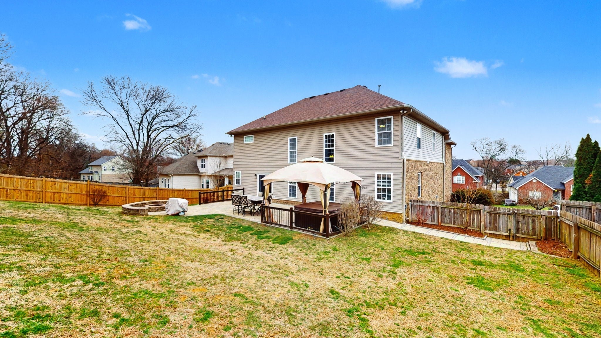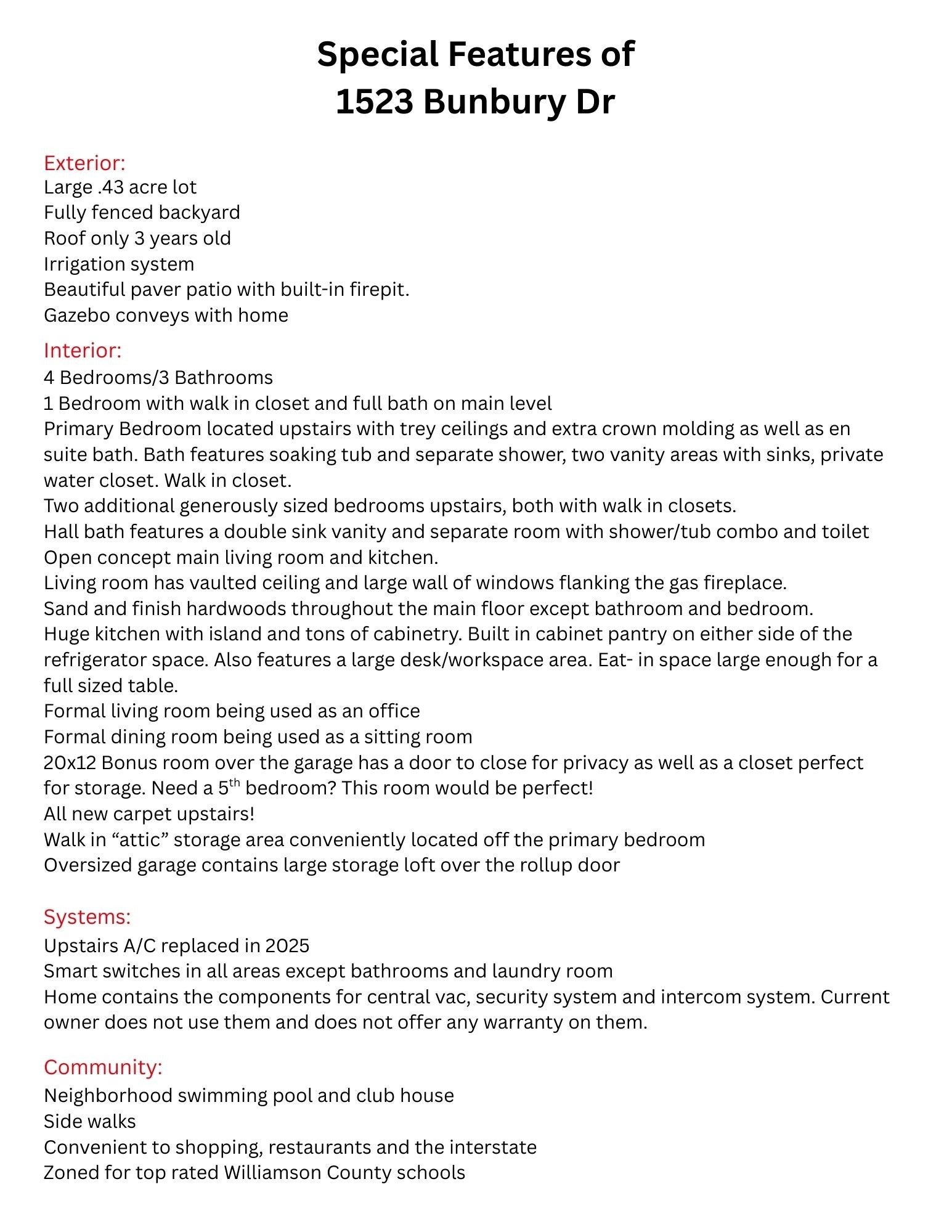 Best value in southern Williamson County! This large 4BR/3BA home located in the desirable Cherry Grove neighborhood is perfect for today's lifestyle. Open concept kitchen and living room area with vaulted ceilings and a cozy fireplace. The formal living room is being used as an office and the formal dining room as a sitting room. The downstairs bedroom is currently being used as a devotional room, but could be a perfect office. Tons of options to fit your needs! All new carpet upstairs! Primary bedroom located upstairs with newly painted bathroom and walk in closet. Bathroom has a shower and soaking tub, two individual vanities and a water closet. Trey ceiling with crown molding details adds to the elegance of this space. Access to a walk-in attic storage is so convenient! Two other generously sized bedrooms are located on the opposite side of the house upstairs and feature walk-in closets. The hall bath has a double sink vanity and a separate room for the shower/tub combo and toilet making morning routines a breeze. The large bonus room has a door to block out noise and also contains a walk-in closet perfect for game/toy storage. Need a 5th bedroom? This space could accommodate that! The back yard is an entertaining delight! Beautiful paver patio with built in firepit and a gazebo that conveys with the home. Lots of space to play or garden within the fenced in back yard. Oversized garage has a storage loft above the door. Convenient to shopping and access to the interstate. Don't miss the opportunity to own this home!