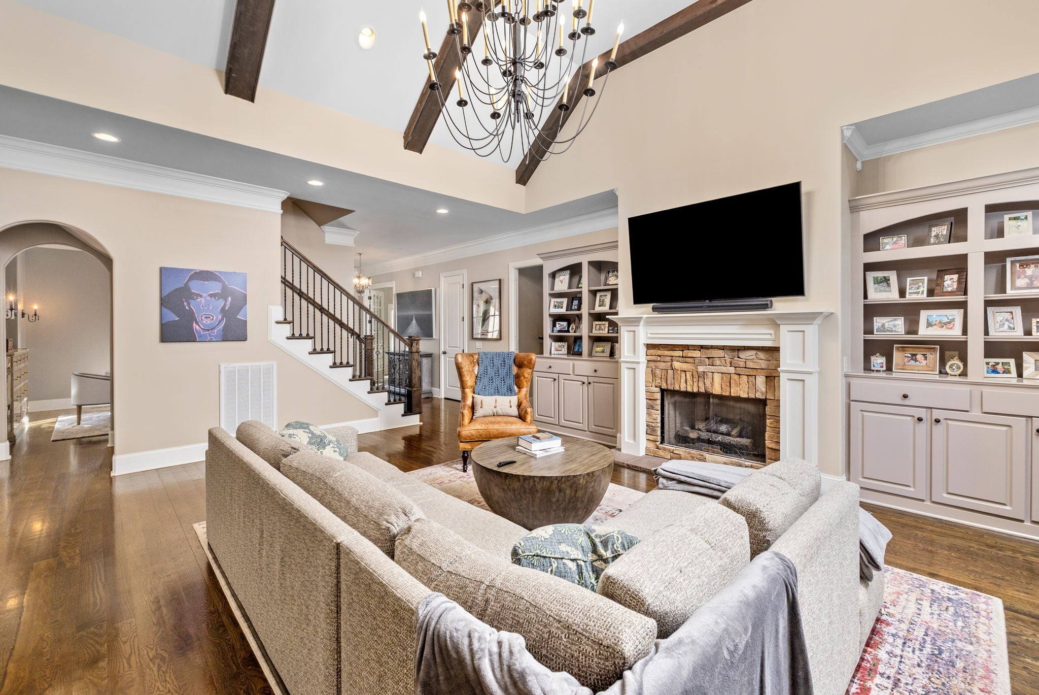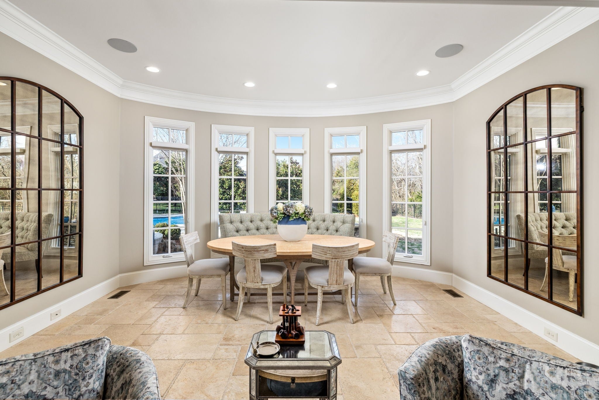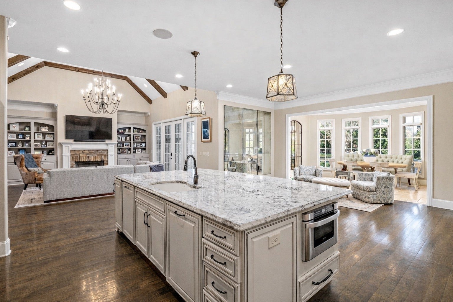 A seamless blend of refined craftsmanship and resort-inspired luxury, this exceptional residence invites a lifestyle of effortless elegance and unforgettable entertaining. Every space has been thoughtfully designed, where architectural details, rich millwork, and beautiful hardwood floors create a warm sophisticated atmosphere. At the heart of the home, the chef’s kitchen is both stunning and functional, appointed with premium appliances including Monogram and Bosch, illuminated cabinetry, a spacious walk-in pantry, and a beautifully designed butler’s pantry that allows gatherings to flow with ease. Coffered ceilings, custom trim work, and carefully curated lighting elevate the living spaces, creating a home that feels both grand and welcoming. Natural light and backyard views throughout! The primary suite offers a tranquil retreat, featuring a coffered ceiling and spa-inspired bath with a freestanding soaking tub, expansive walk-in shower, double vanities, and beautifully designed custom closet. Designed for entertainment, the home also features a private theater experience complete with projector screen, immersive surround sound, and custom-integrated speakers, perfect for movie nights or game day gatherings. Beyond the walls of the home lies a true outdoor sanctuary. The backyard unfolds as a private resort, where a heated pool, spa, gas fire pit and cascading waterfall create a stunning centerpiece. Underwater audio brings a unique sensory experience to the pool, while the outdoor kitchen, brand-new outdoor tv, and comfortable Sunbrella lounge furnishings invite effortless al fresco entertaining. A screened porch with a stone fireplace offers a cozy extension of the living space, allowing year-round enjoyment of the beautifully landscaped grounds. Additional thoughtful amenities include custom built-ins, plantation shutters, a well-appointed mudroom, a spacious laundry room with cabinetry/sink, walk-in attic storage, tankless water heater and more. A must see!