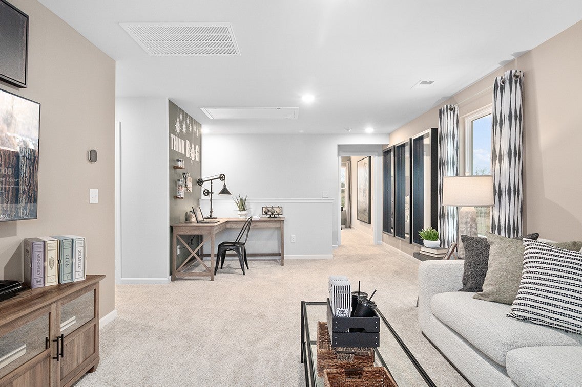 This Woodruff home at Barton Hills in Spring Hill, TN is designed for everyday comfort and easy entertaining. Tucked on a quiet cul-de-sac, this home is built for gathering and flexibility. The open main level showcases an extended kitchen with light gray cabinets, a spacious island, and easy flow into the great room and dining area. A bedroom and full bathroom are also on the main level. Upstairs, a large game room provides room to relax or entertain, while the primary suite includes a walk-in closet and a bath with a soaking tub. A covered patio and views of open green space complete the setting.
