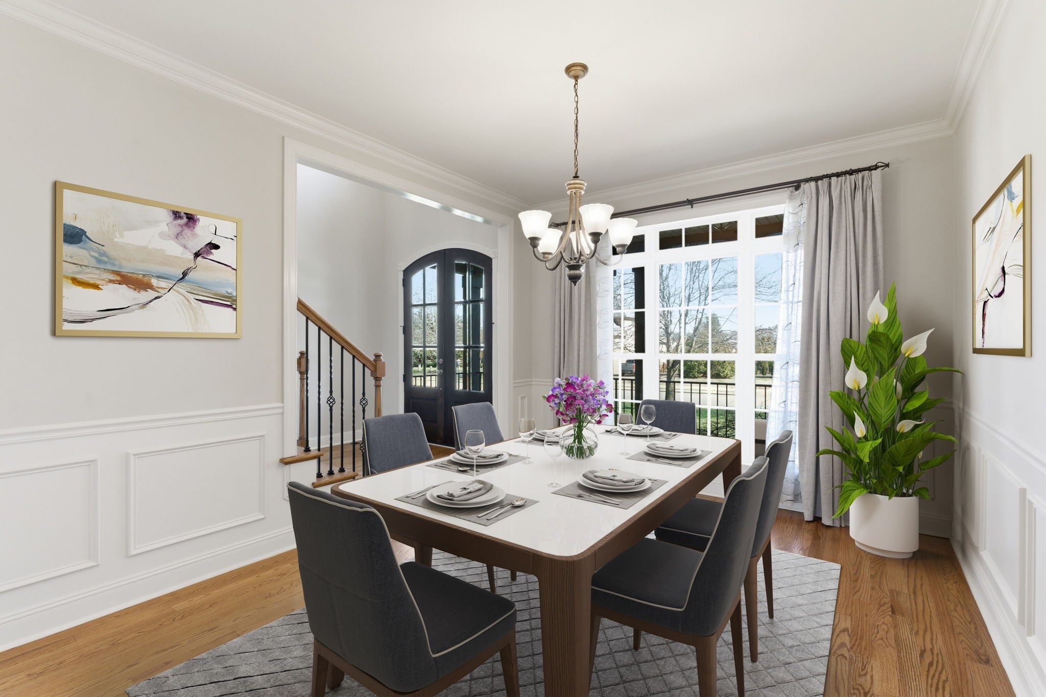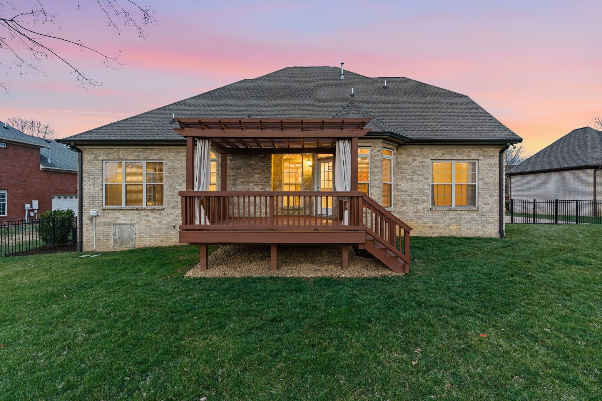 Welcome to Whispering Wind Way: Gorgeous family-friendly home featuring 5 spacious bedrooms, 3.5 bathrooms, perfect for comfortable, yet elegant, living & entertaining. The interior hosts a warm elegance while maintaining comfort and practical spaces. The primary suite is located on the main floor, end your days in the jetted tub. The exterior showcases beautiful architectural lighting and manicured lawn with efficient irrigation system making it a standout day and night. New roof and gutters in 2025! For environmentally conscious residents, the three-car garage is equipped with two electric vehicle chargers. Step outside to a fenced in backyard that offers privacy and security, perfect for children and pets. Relax on the deck adorned with a charming pergola, providing shade and stylish touch to outdoor living. A must see!