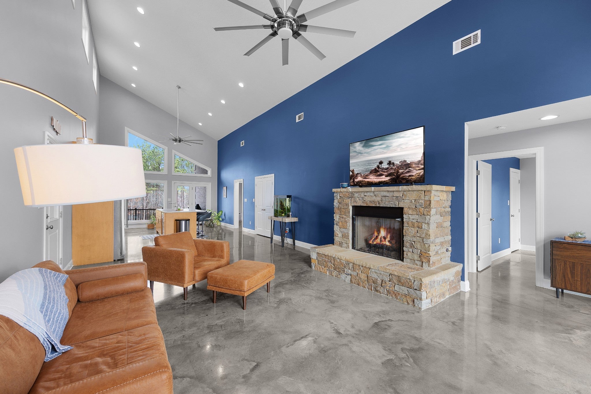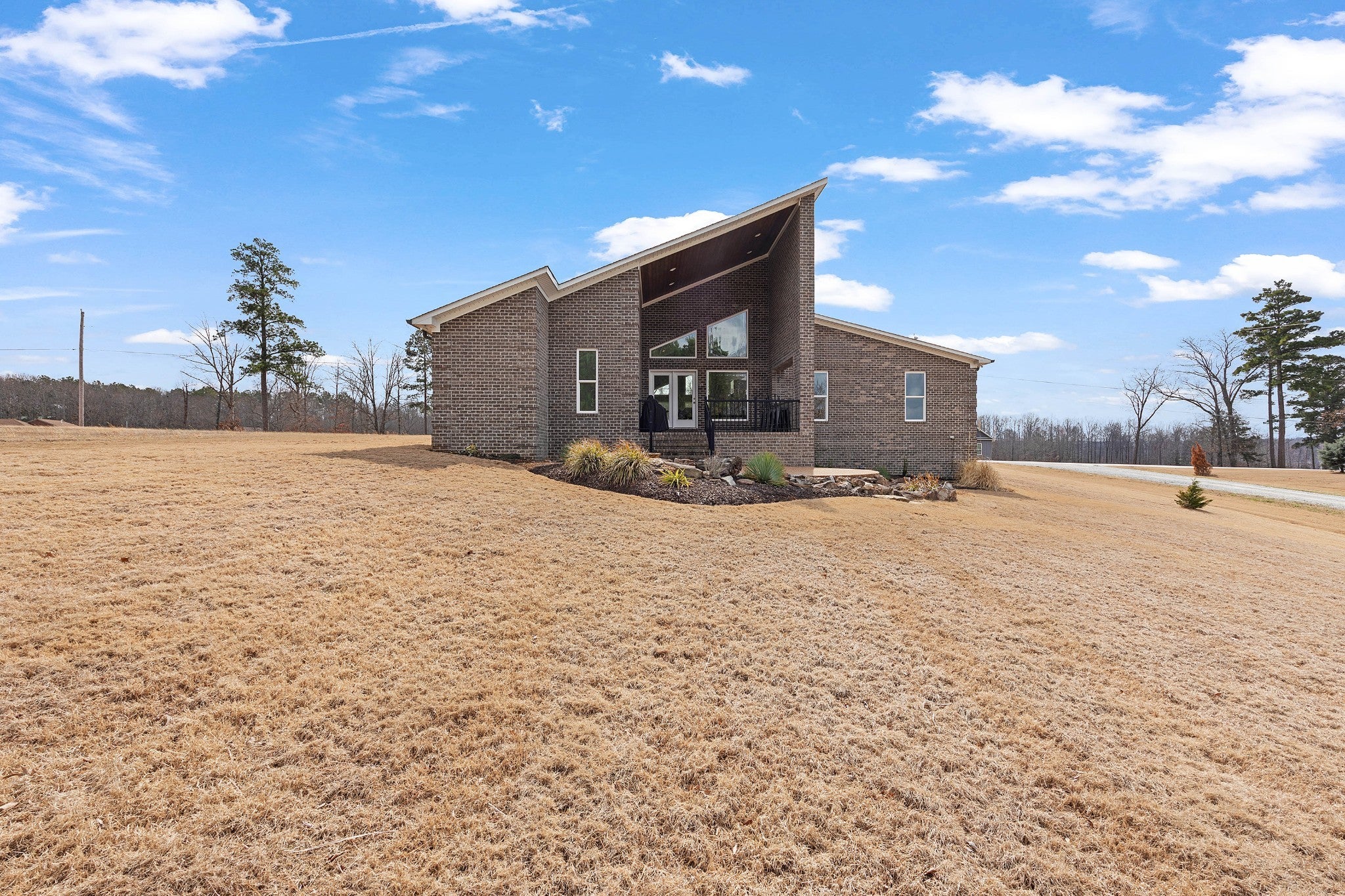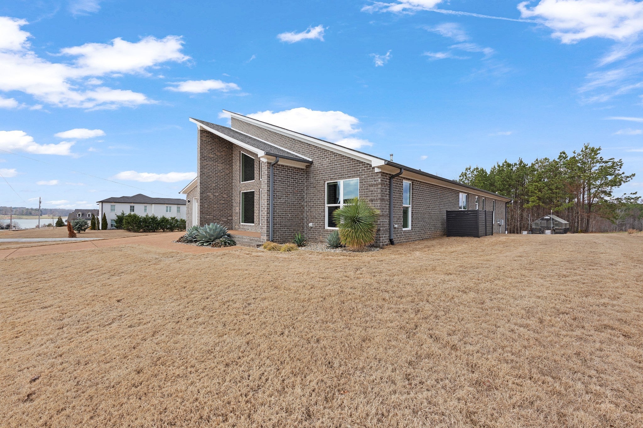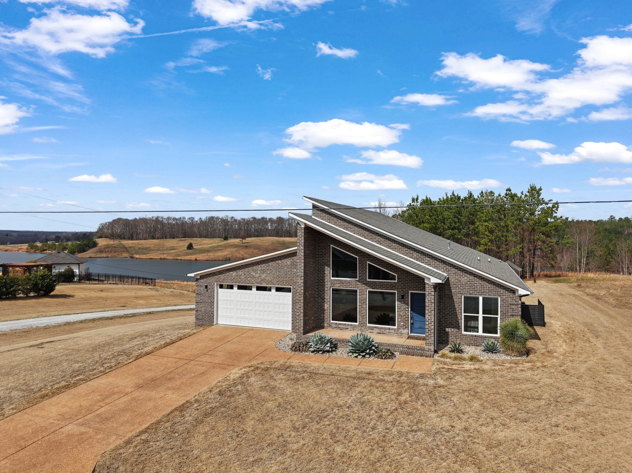 Soaring 22½-foot vaulted ceilings and a dramatic wall of windows create an unforgettable first impression in this modern home near Lake Halford, also known as Carroll County’s Thousand Acre Lake. Enjoy easy access to boating, fishing, and recreation along with thoughtfully designed living spaces inside and out. Built in 2019, this distinctive lake-area home offers 3 bedrooms, 2 baths, and 1,816 heated square feet with clean architectural lines and low-maintenance finishes. The main living area features polished concrete floors, spray foam insulation, and an open concept design connecting the living, dining, and kitchen spaces. The kitchen is designed for both everyday living and entertaining with granite countertops, custom cabinetry, and an island with bar seating, all overlooking the living room with a cozy gas log fireplace. A split bedroom floor plan provides privacy for the primary suite, which includes a spacious bath with an impressive 8' x 5.5' walk-in shower. Outdoor living continues with covered front and back porches offering views of the lake, along with an aggregate patio beside a pondless waterfall feature. A greenhouse provides additional space for gardening or starting plants. The 886 sq ft oversized garage easily accommodates multiple vehicles, boats, or recreational equipment and includes a Fain Storm Shelters steel safe room plus a workshop/utility area. Situated on 0.52 acres, the property is about a mile from the lake’s public boat ramp, fishing pier, and swimming beach. Lake Halford is recognized as a Bill Dance Signature Lake, known for excellent fishing along with boating, kayaking, and other recreational opportunities. A rare opportunity for a primary residence or weekend lake retreat with modern design and convenient lake access. The dramatic ceiling height and natural light truly need to be experienced in person to appreciate the design and scale of this unique lake-area home.