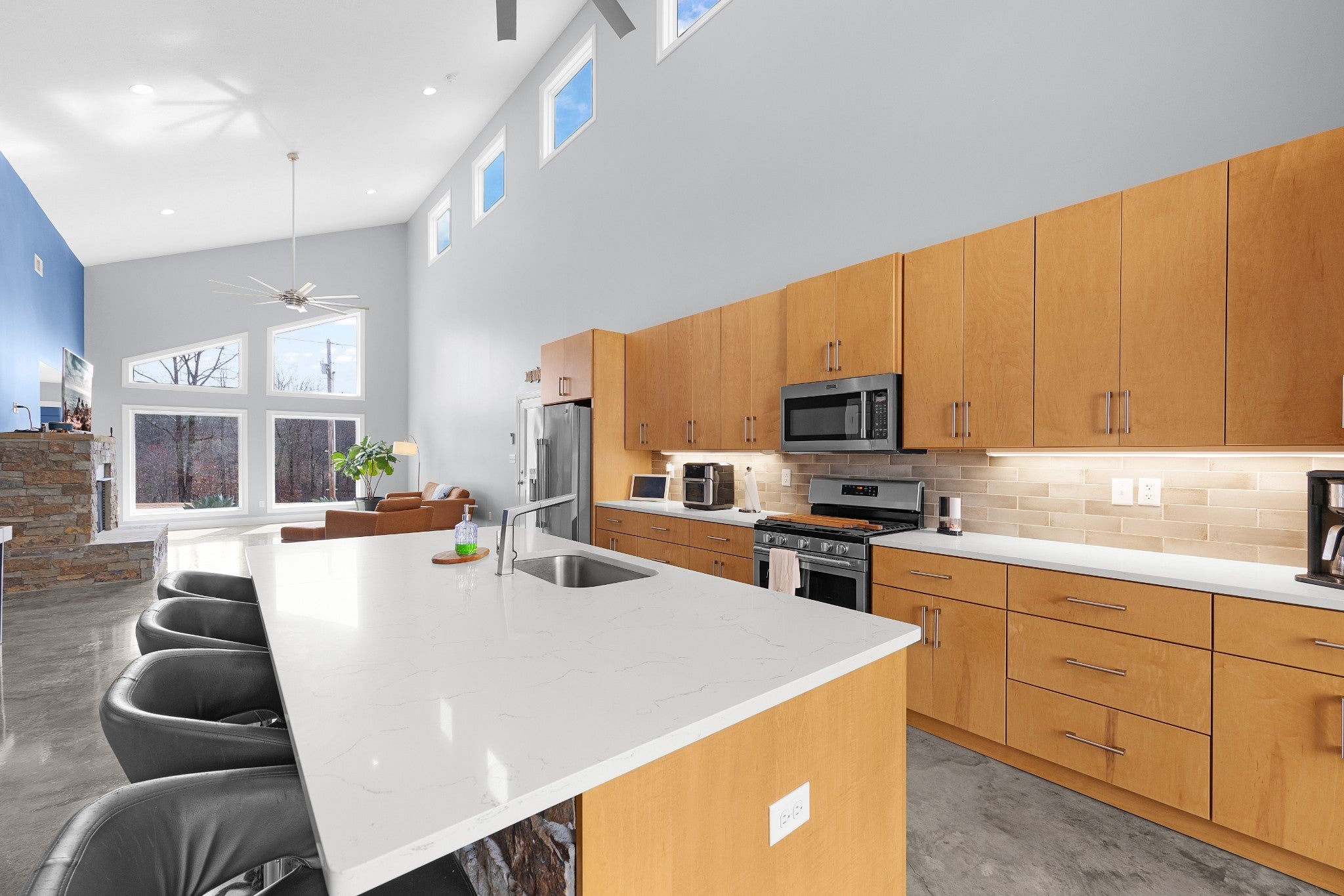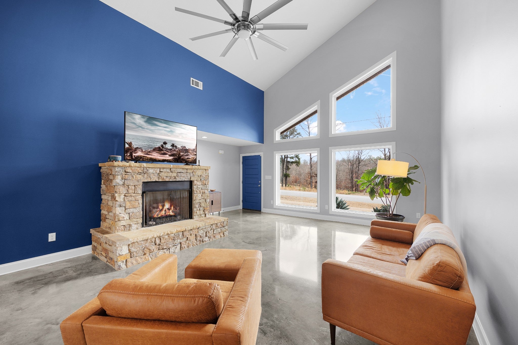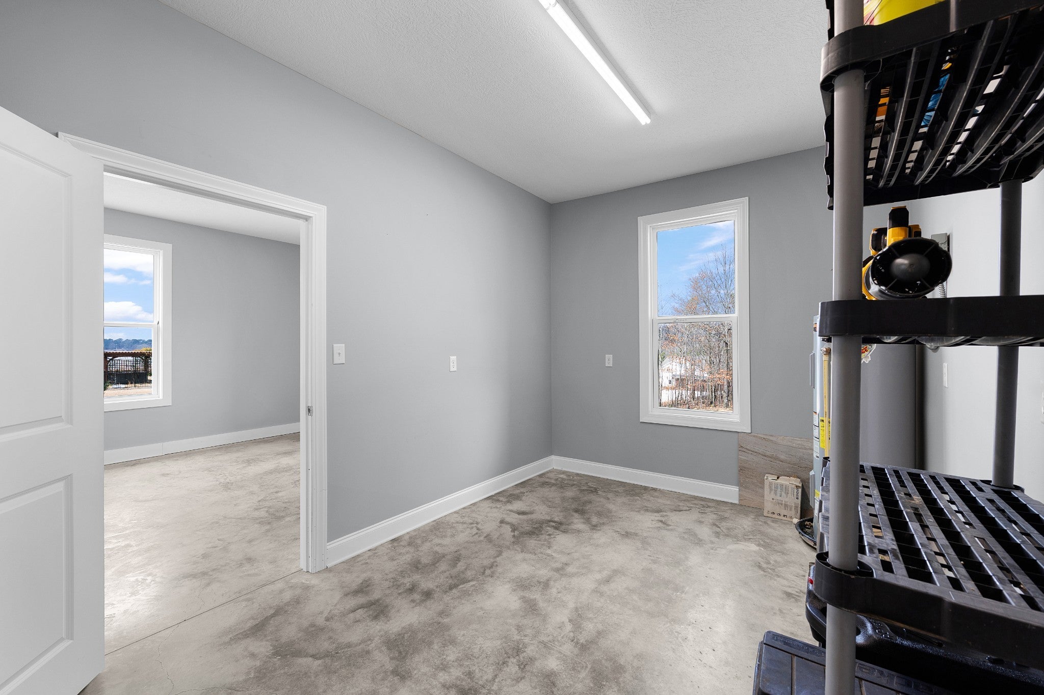 Soaring 22½-foot vaulted ceilings and a dramatic wall of windows create an unforgettable first impression in this modern home near Lake Halford, also known as Carroll County’s Thousand Acre Lake. Enjoy easy access to boating, fishing, and recreation along with thoughtfully designed living spaces inside and out. Built in 2019, this distinctive lake-area home offers 3 bedrooms, 2 baths, and 1,816 heated square feet with clean architectural lines and low-maintenance finishes. The main living area features polished concrete floors, spray foam insulation, and an open concept design connecting the living, dining, and kitchen spaces. The kitchen is designed for both everyday living and entertaining with granite countertops, custom cabinetry, and an island with bar seating, all overlooking the living room with a cozy gas log fireplace. A split bedroom floor plan provides privacy for the primary suite, which includes a spacious bath with an impressive 8' x 5.5' walk-in shower. Outdoor living continues with covered front and back porches offering views of the lake, along with an aggregate patio beside a pondless waterfall feature. A greenhouse provides additional space for gardening or starting plants. The 886 sq ft oversized garage easily accommodates multiple vehicles, boats, or recreational equipment and includes a Fain Storm Shelters steel safe room plus a workshop/utility area. Situated on 0.52 acres, the property is about a mile from the lake’s public boat ramp, fishing pier, and swimming beach. Lake Halford is recognized as a Bill Dance Signature Lake, known for excellent fishing along with boating, kayaking, and other recreational opportunities. A rare opportunity for a primary residence or weekend lake retreat with modern design and convenient lake access. The dramatic ceiling height and natural light truly need to be experienced in person to appreciate the design and scale of this unique lake-area home.