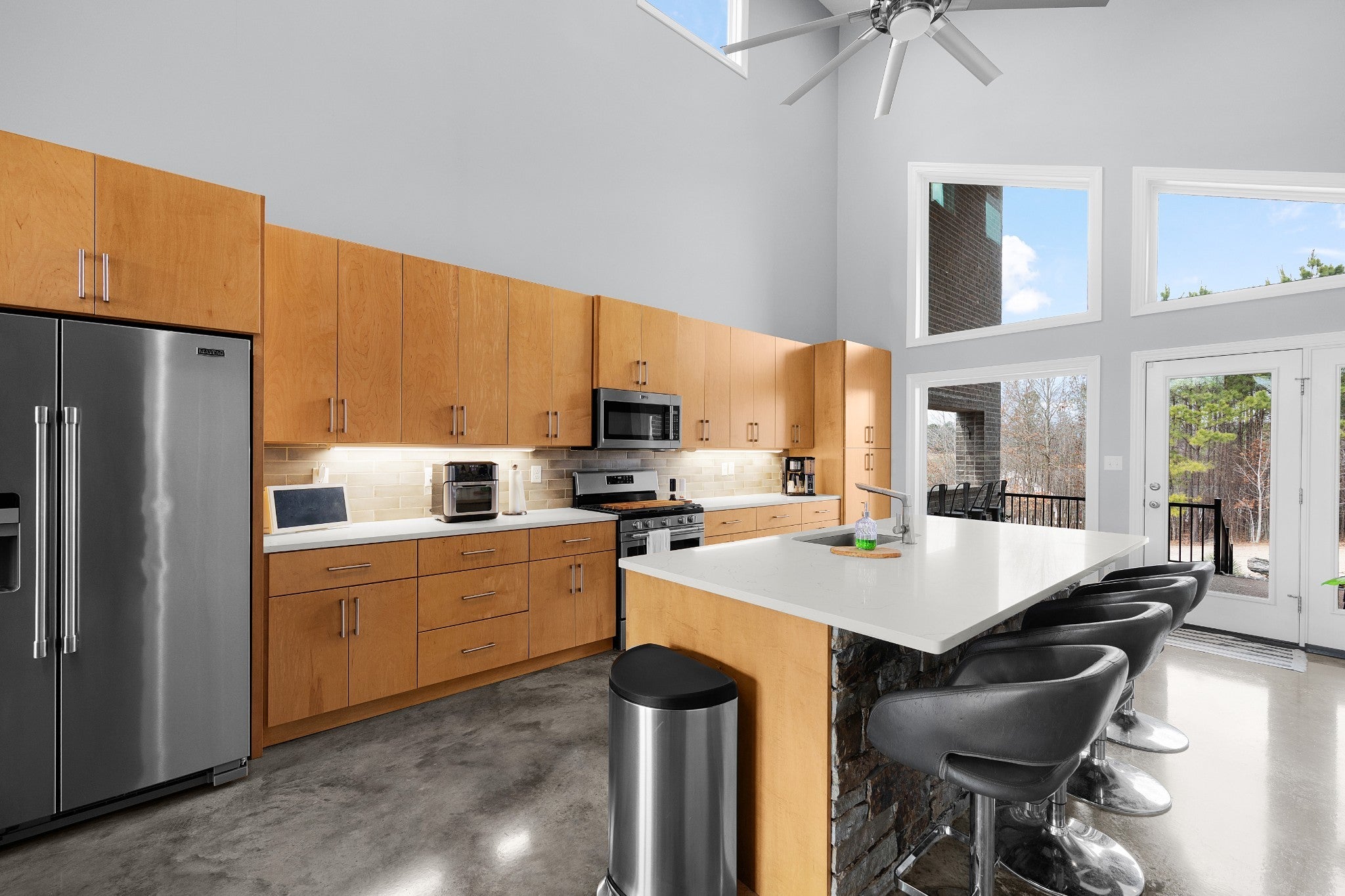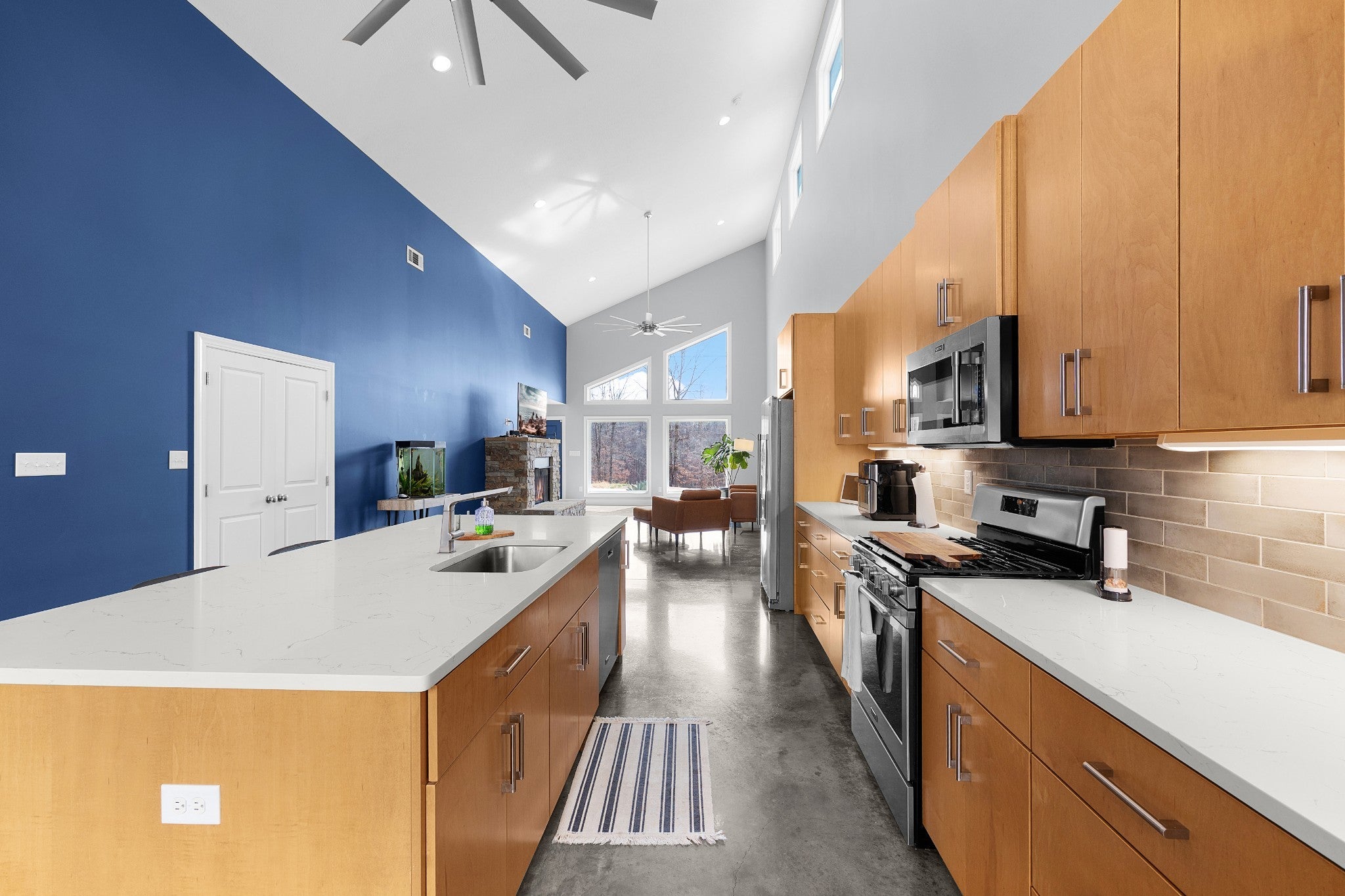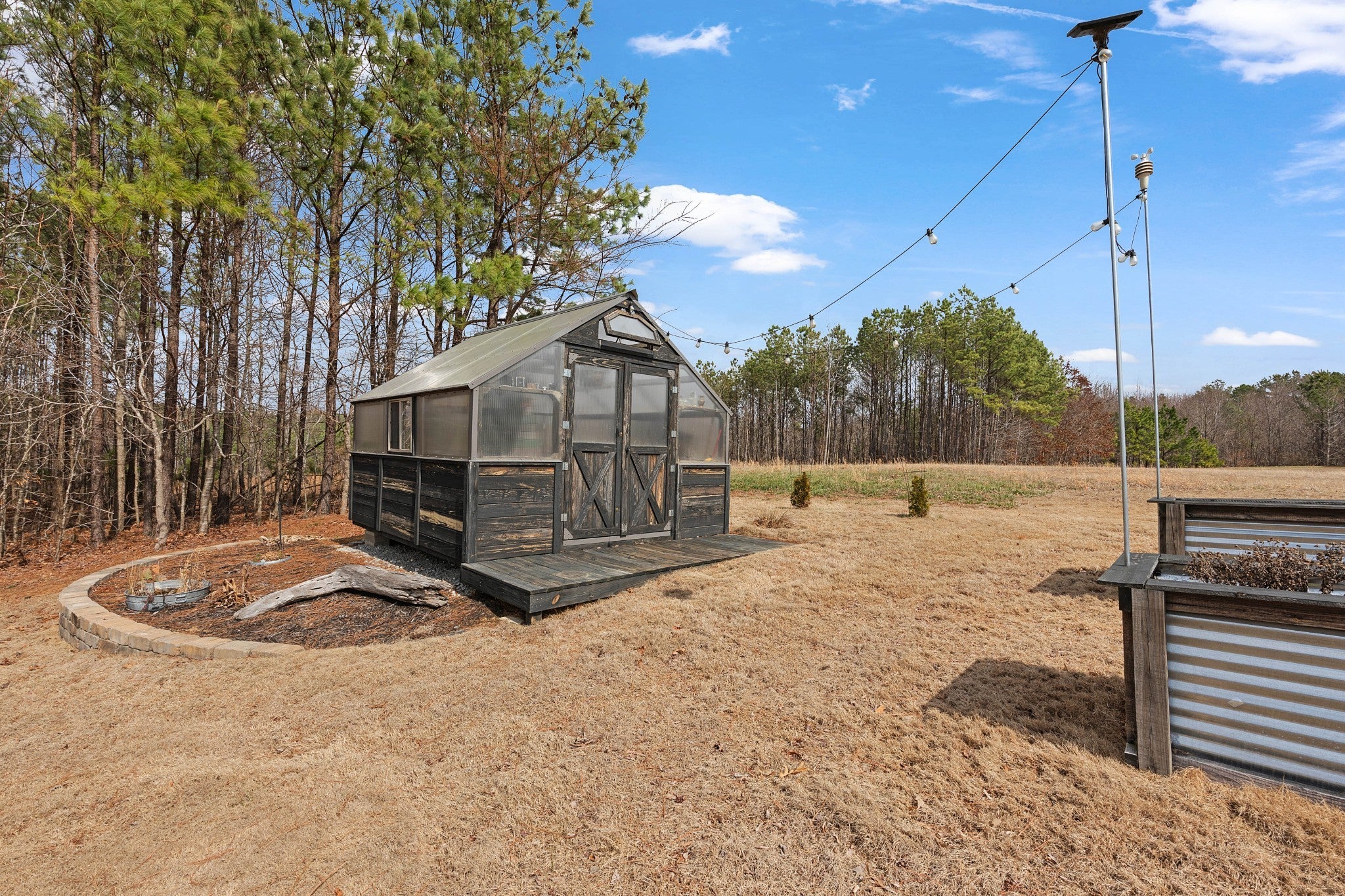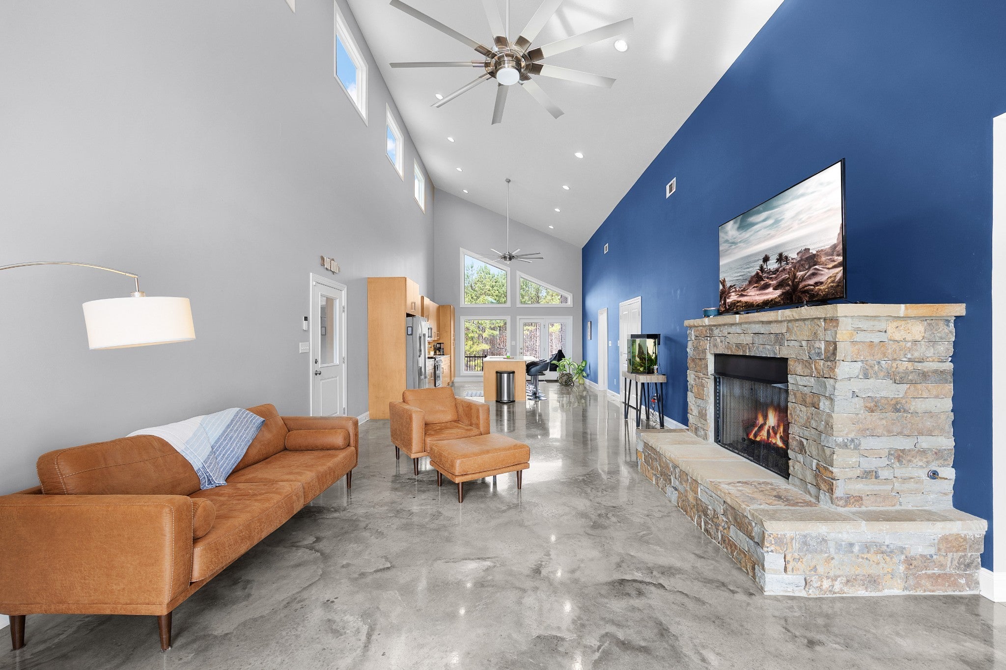 Soaring 22½-foot vaulted ceilings and a dramatic wall of windows create an unforgettable first impression in this modern home near Lake Halford, also known as Carroll County’s Thousand Acre Lake. Enjoy easy access to boating, fishing, and recreation along with thoughtfully designed living spaces inside and out. Built in 2019, this distinctive lake-area home offers 3 bedrooms, 2 baths, and 1,816 heated square feet with clean architectural lines and low-maintenance finishes. The main living area features polished concrete floors, spray foam insulation, and an open concept design connecting the living, dining, and kitchen spaces. The kitchen is designed for both everyday living and entertaining with granite countertops, custom cabinetry, and an island with bar seating, all overlooking the living room with a cozy gas log fireplace. A split bedroom floor plan provides privacy for the primary suite, which includes a spacious bath with an impressive 8' x 5.5' walk-in shower. Outdoor living continues with covered front and back porches offering views of the lake, along with an aggregate patio beside a pondless waterfall feature. A greenhouse provides additional space for gardening or starting plants. The 886 sq ft oversized garage easily accommodates multiple vehicles, boats, or recreational equipment and includes a Fain Storm Shelters steel safe room plus a workshop/utility area. Situated on 0.52 acres, the property is about a mile from the lake’s public boat ramp, fishing pier, and swimming beach. Lake Halford is recognized as a Bill Dance Signature Lake, known for excellent fishing along with boating, kayaking, and other recreational opportunities. A rare opportunity for a primary residence or weekend lake retreat with modern design and convenient lake access. The dramatic ceiling height and natural light truly need to be experienced in person to appreciate the design and scale of this unique lake-area home.