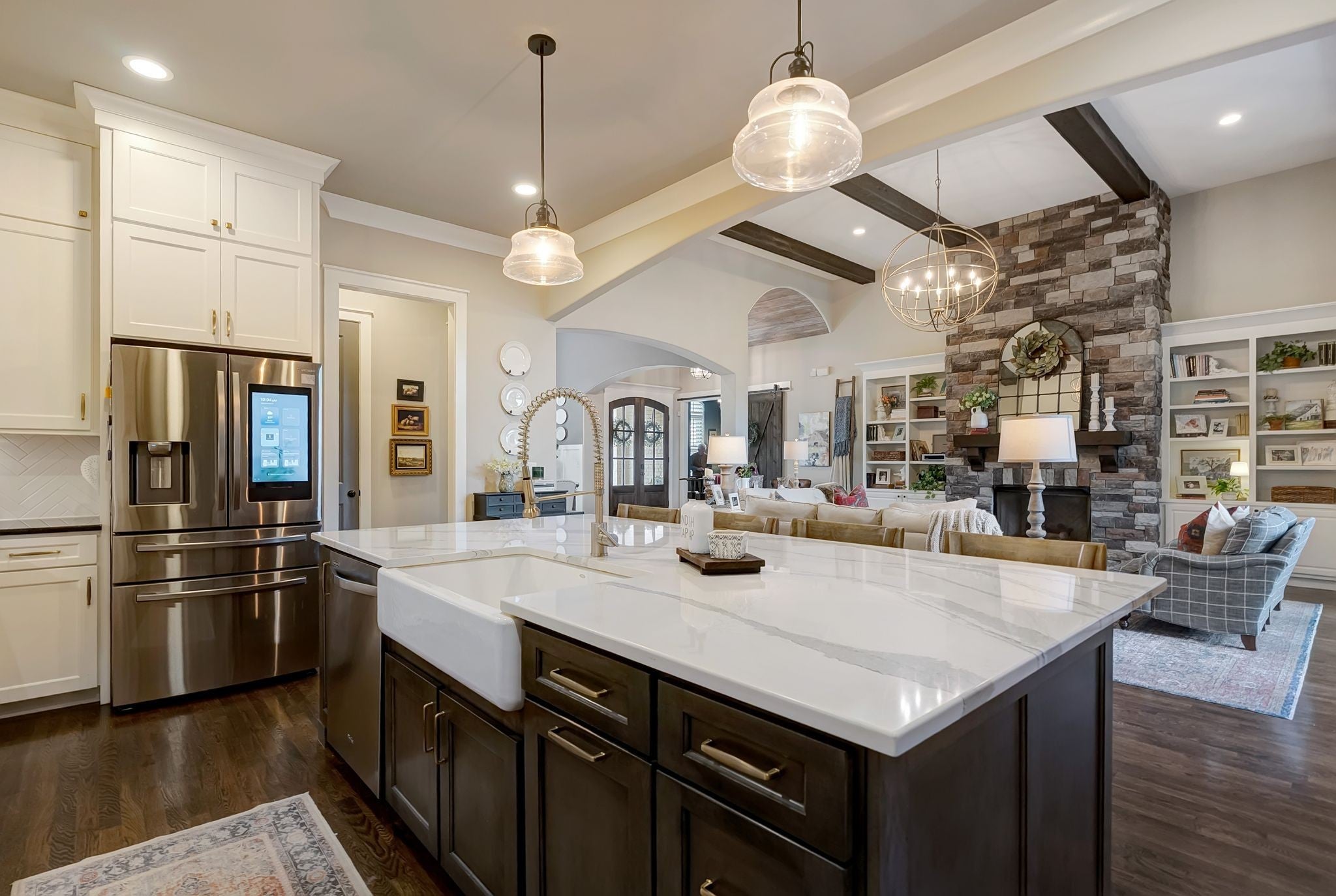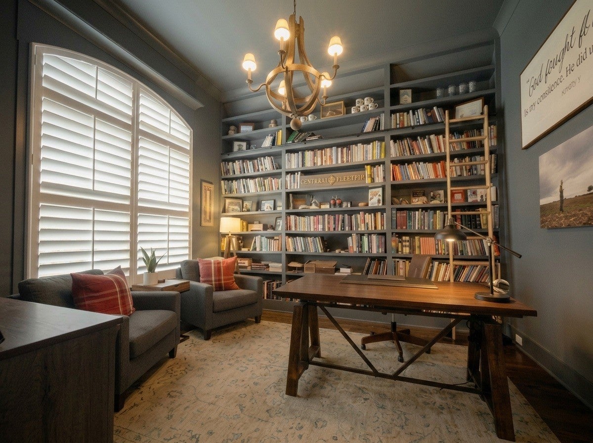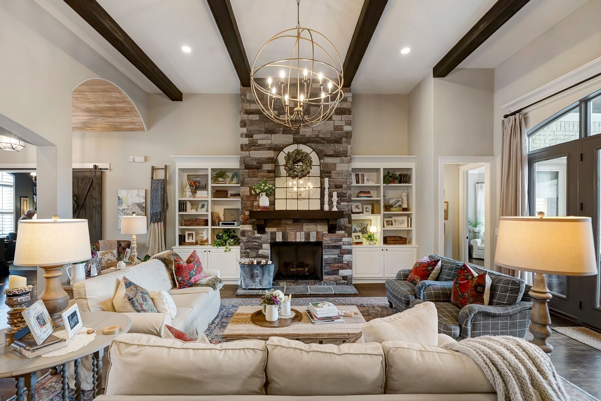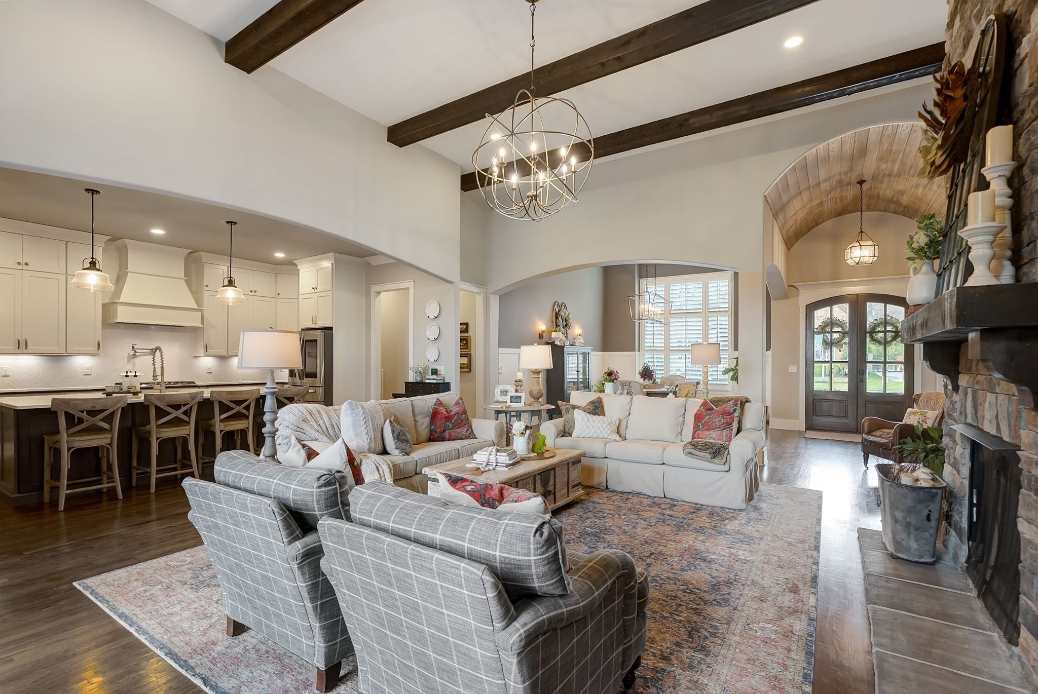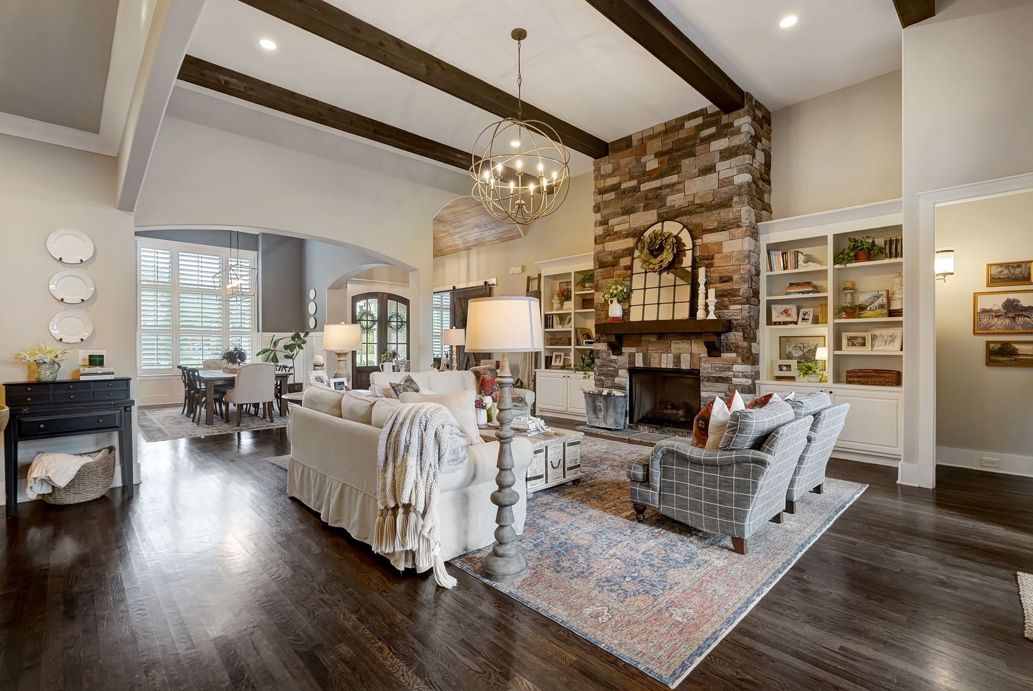 Welcome to timeless elegance in Bridgemore Village, where classic French country architecture meets beautifully curated interiors designed for both everyday living and elegant entertaining. Inside, the home feels serene, calm, and inviting, with gorgeous hardwood floors, custom trim work, designer lighting, and fresh paint and wallpaper throughout. Soaring ceilings, wood beam accents, and a stunning floor-to-ceiling fireplace in the living room create a space that feels both stately and comfortable. The heart of the home is the beautiful kitchen, featuring double ovens and an oversized island perfect for gathering, flowing effortlessly into the main living areas. One of the home’s most memorable spaces is the library-style office, complete with floor-to-ceiling built-in bookcases and a rolling ladder, offering a sophisticated and inspiring place to work or unwind. The thoughtfully designed floor plan includes five bedrooms, with four located on the main level and four en-suite, providing comfort and privacy for family and guests. The primary suite is a true retreat, featuring a peaceful sitting area and a luxurious bathroom with a large soaking tub designed for relaxation. Upstairs, a spacious bonus retreat offers the perfect flex space for a media room, playroom, or additional living area. Step outside to a vaulted screened-in porch featuring its own floor-to-ceiling fireplace, overlooking a backyard that feels like your own private secret garden, surrounded by mature trees that create rare privacy. Elegant yet comfortable, this is a home that feels as beautiful to live in as it is to see.