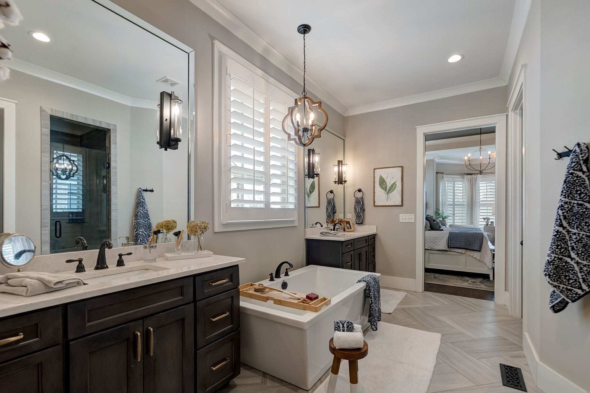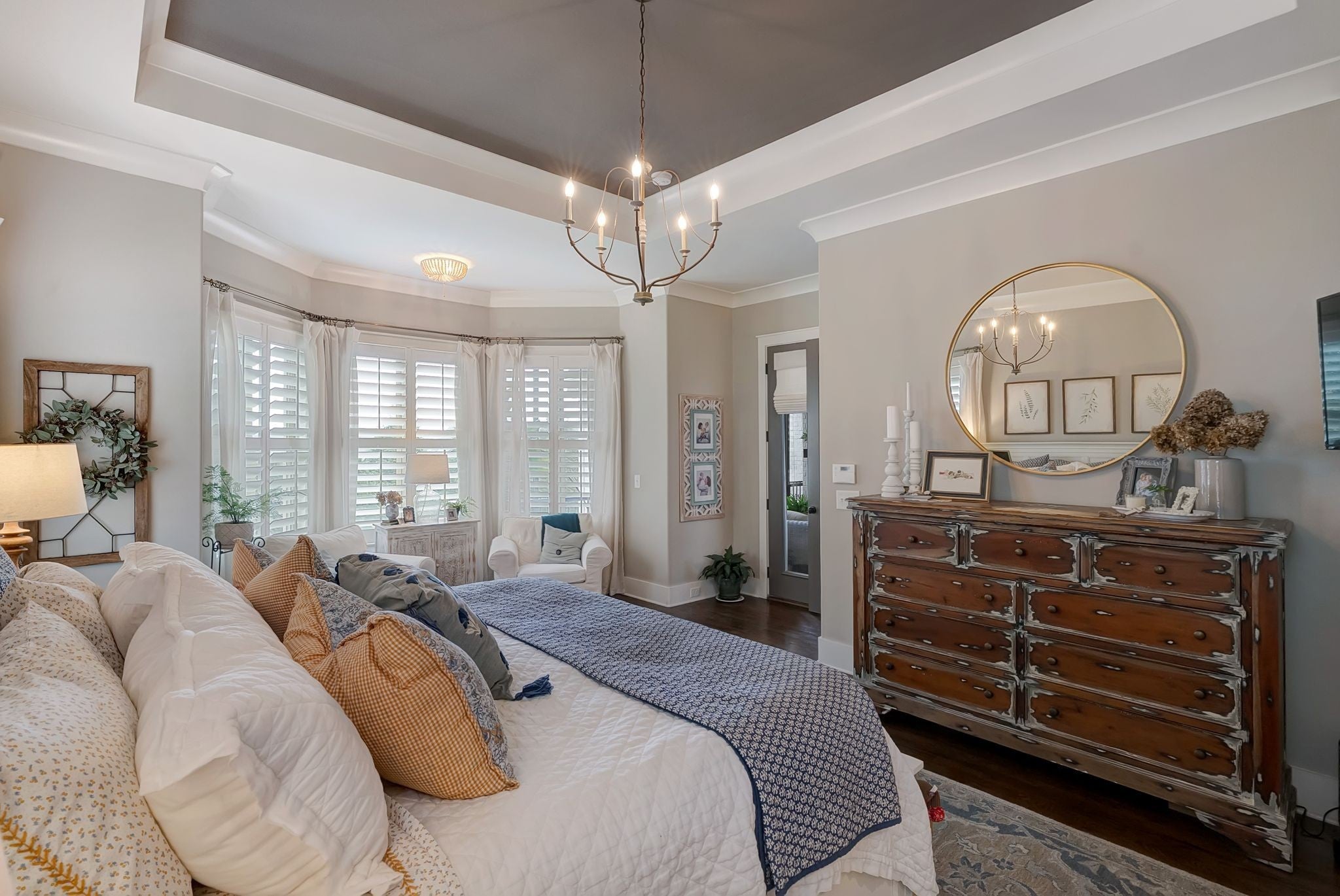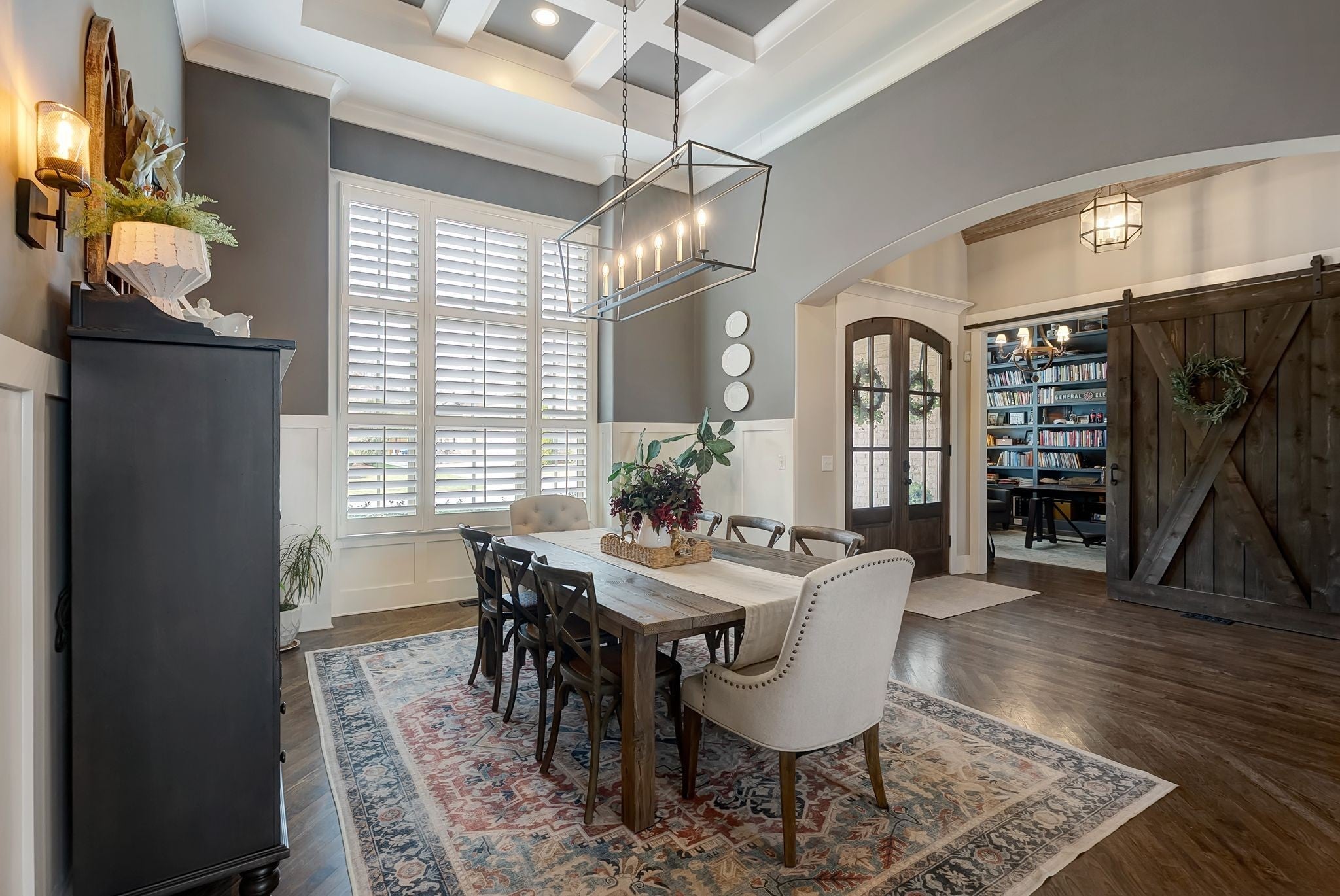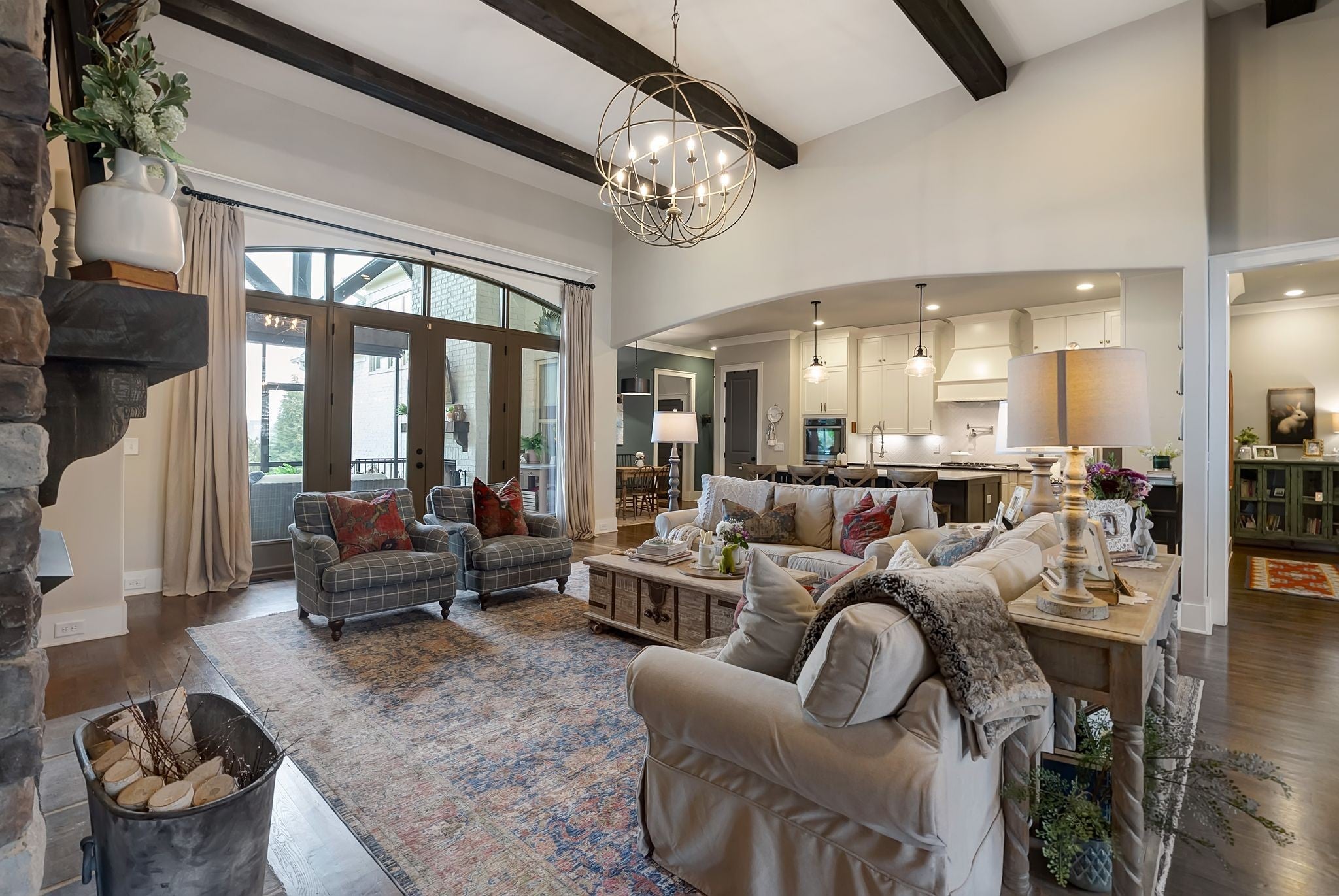 Welcome to timeless elegance in Bridgemore Village, where classic French country architecture meets beautifully curated interiors designed for both everyday living and elegant entertaining. Inside, the home feels serene, calm, and inviting, with gorgeous hardwood floors, custom trim work, designer lighting, and fresh paint and wallpaper throughout. Soaring ceilings, wood beam accents, and a stunning floor-to-ceiling fireplace in the living room create a space that feels both stately and comfortable. The heart of the home is the beautiful kitchen, featuring double ovens and an oversized island perfect for gathering, flowing effortlessly into the main living areas. One of the home’s most memorable spaces is the library-style office, complete with floor-to-ceiling built-in bookcases and a rolling ladder, offering a sophisticated and inspiring place to work or unwind. The thoughtfully designed floor plan includes five bedrooms, with four located on the main level and four en-suite, providing comfort and privacy for family and guests. The primary suite is a true retreat, featuring a peaceful sitting area and a luxurious bathroom with a large soaking tub designed for relaxation. Upstairs, a spacious bonus retreat offers the perfect flex space for a media room, playroom, or additional living area. Step outside to a vaulted screened-in porch featuring its own floor-to-ceiling fireplace, overlooking a backyard that feels like your own private secret garden, surrounded by mature trees that create rare privacy. Elegant yet comfortable, this is a home that feels as beautiful to live in as it is to see.