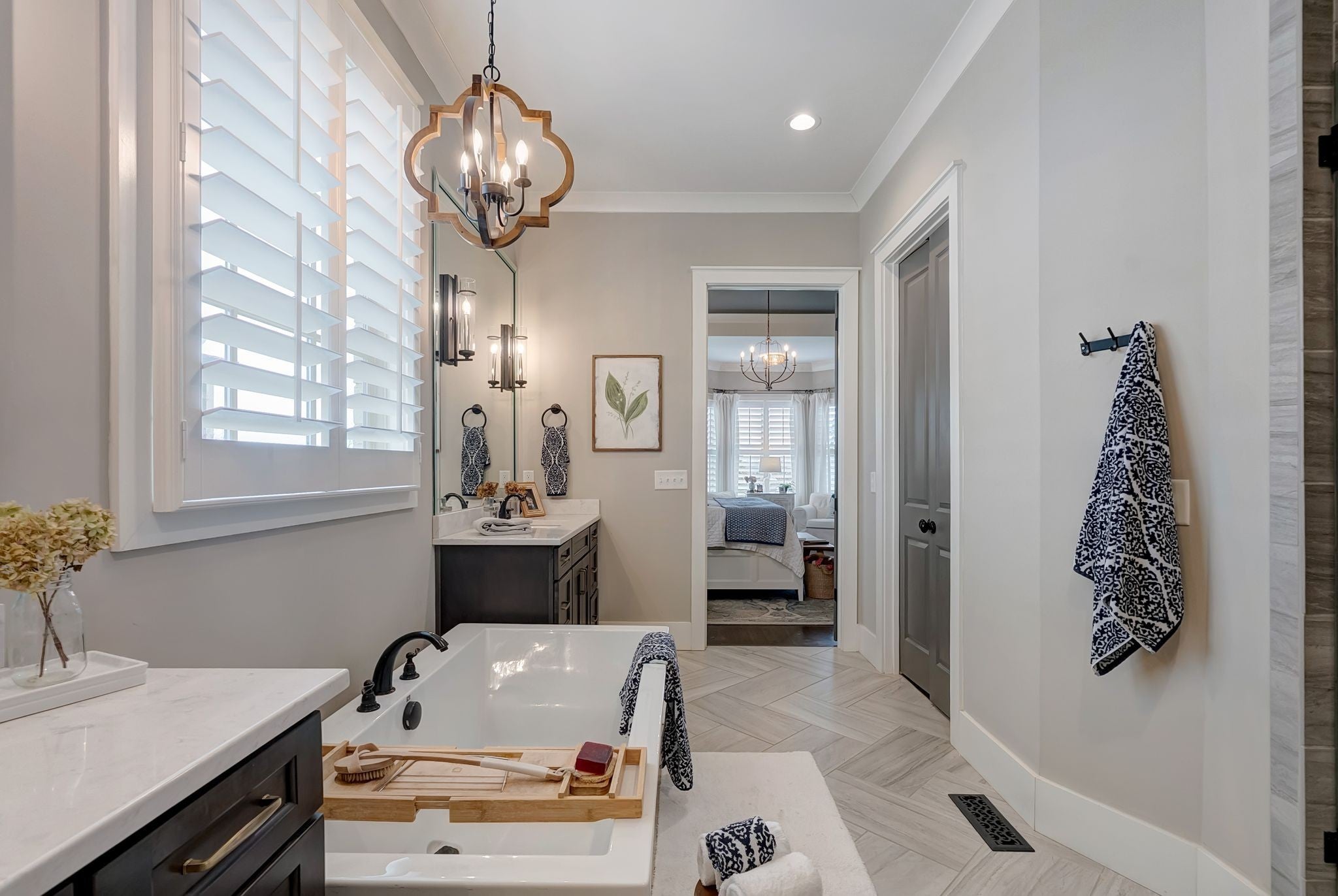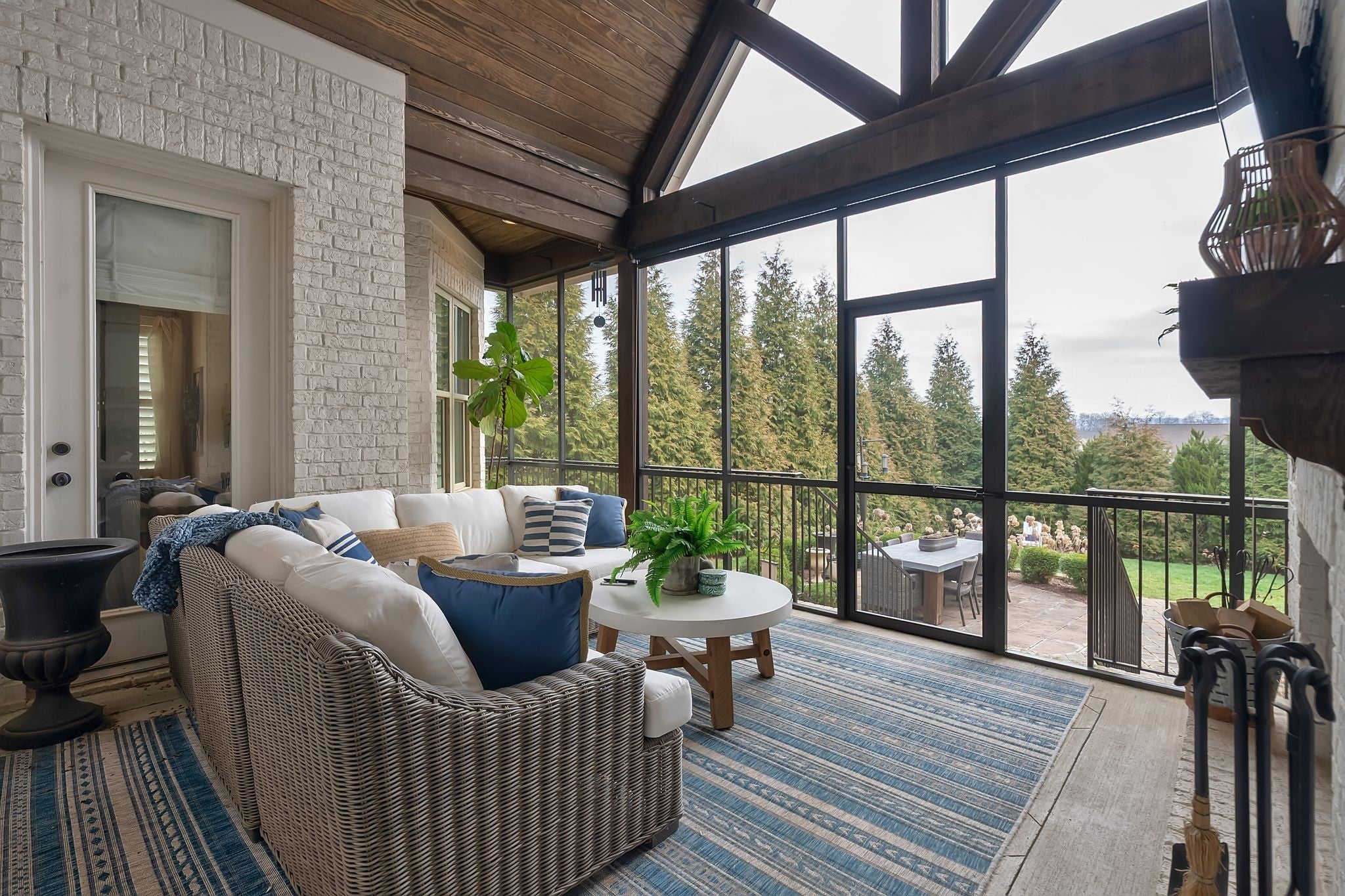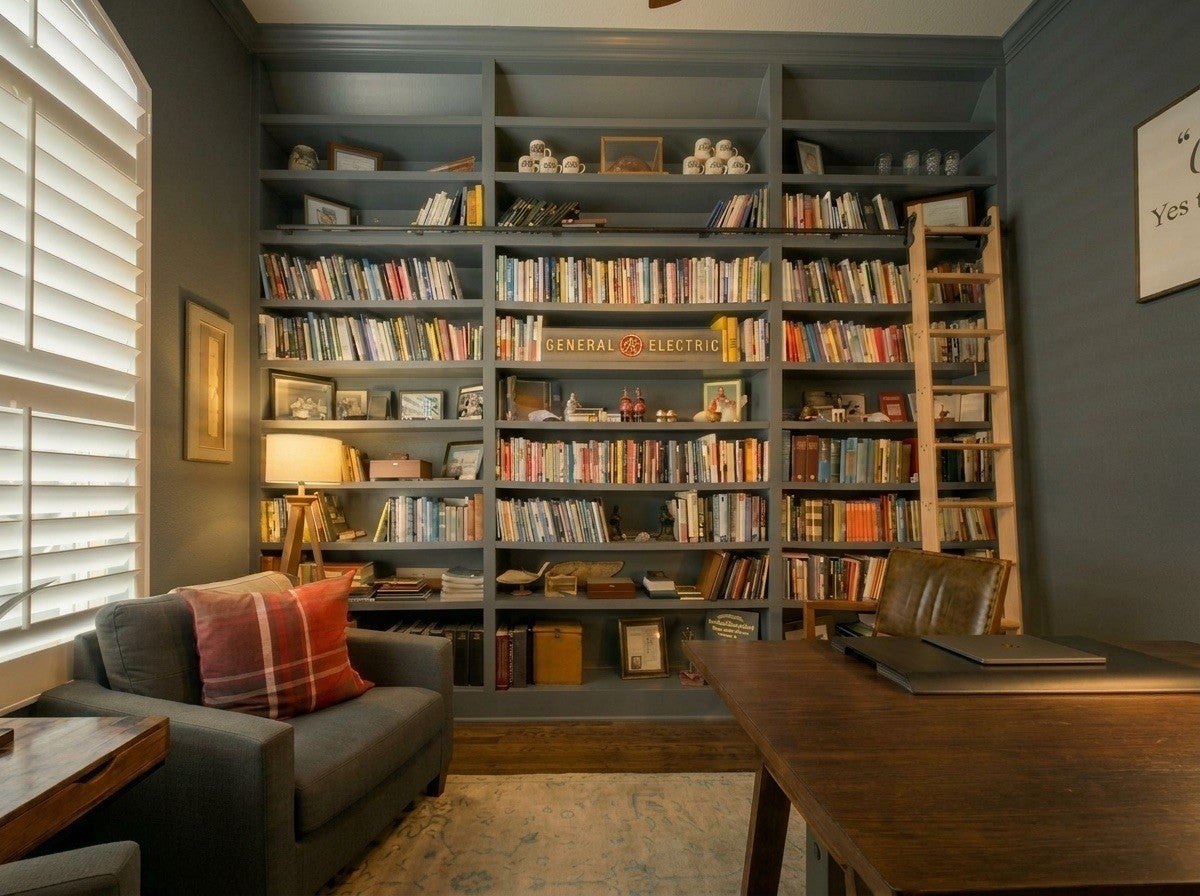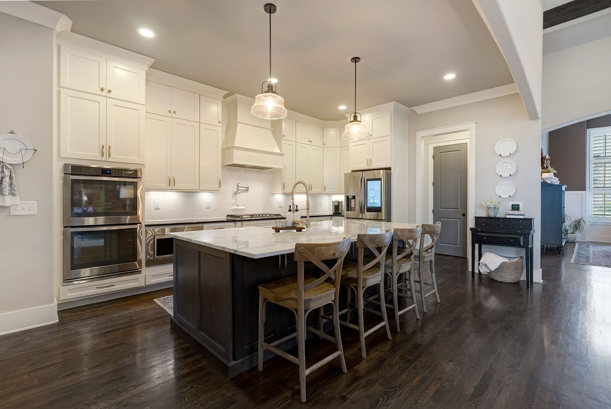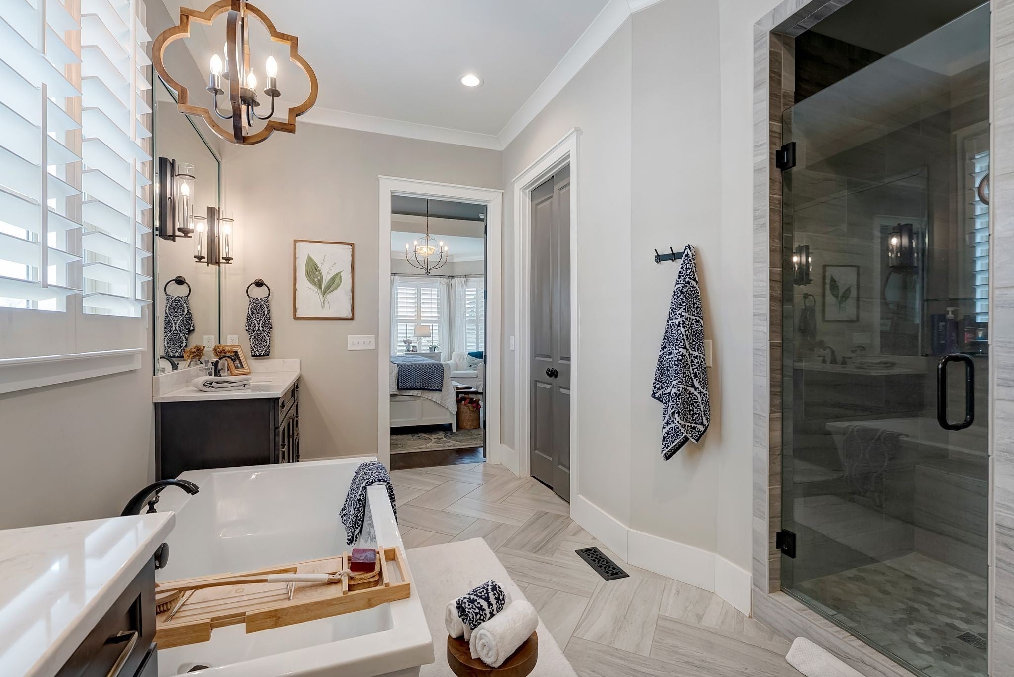 Welcome to timeless elegance in Bridgemore Village, where classic French country architecture meets beautifully curated interiors designed for both everyday living and elegant entertaining. Inside, the home feels serene, calm, and inviting, with gorgeous hardwood floors, custom trim work, designer lighting, and fresh paint and wallpaper throughout. Soaring ceilings, wood beam accents, and a stunning floor-to-ceiling fireplace in the living room create a space that feels both stately and comfortable. The heart of the home is the beautiful kitchen, featuring double ovens and an oversized island perfect for gathering, flowing effortlessly into the main living areas. One of the home’s most memorable spaces is the library-style office, complete with floor-to-ceiling built-in bookcases and a rolling ladder, offering a sophisticated and inspiring place to work or unwind. The thoughtfully designed floor plan includes five bedrooms, with four located on the main level and four en-suite, providing comfort and privacy for family and guests. The primary suite is a true retreat, featuring a peaceful sitting area and a luxurious bathroom with a large soaking tub designed for relaxation. Upstairs, a spacious bonus retreat offers the perfect flex space for a media room, playroom, or additional living area. Step outside to a vaulted screened-in porch featuring its own floor-to-ceiling fireplace, overlooking a backyard that feels like your own private secret garden, surrounded by mature trees that create rare privacy. Elegant yet comfortable, this is a home that feels as beautiful to live in as it is to see.