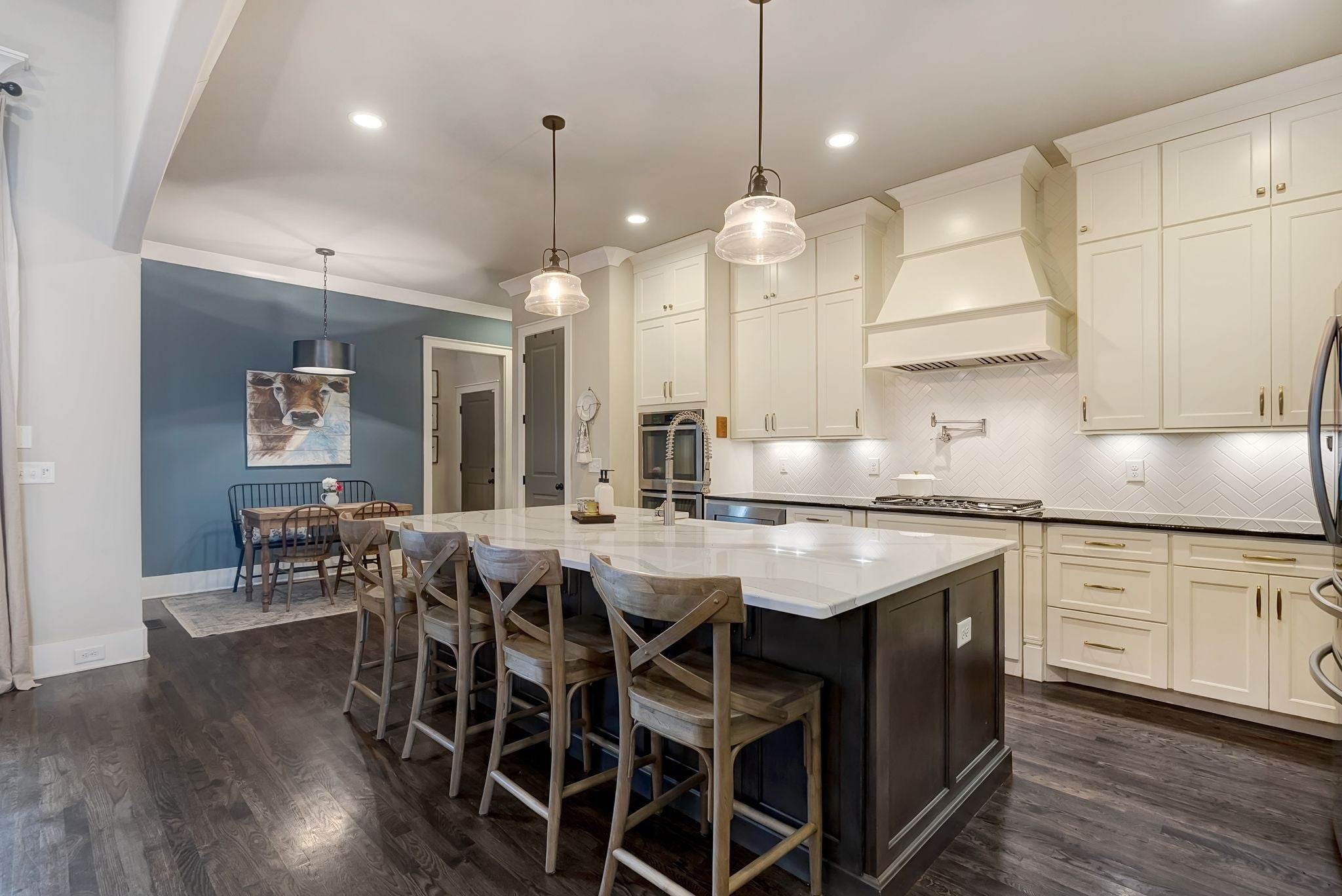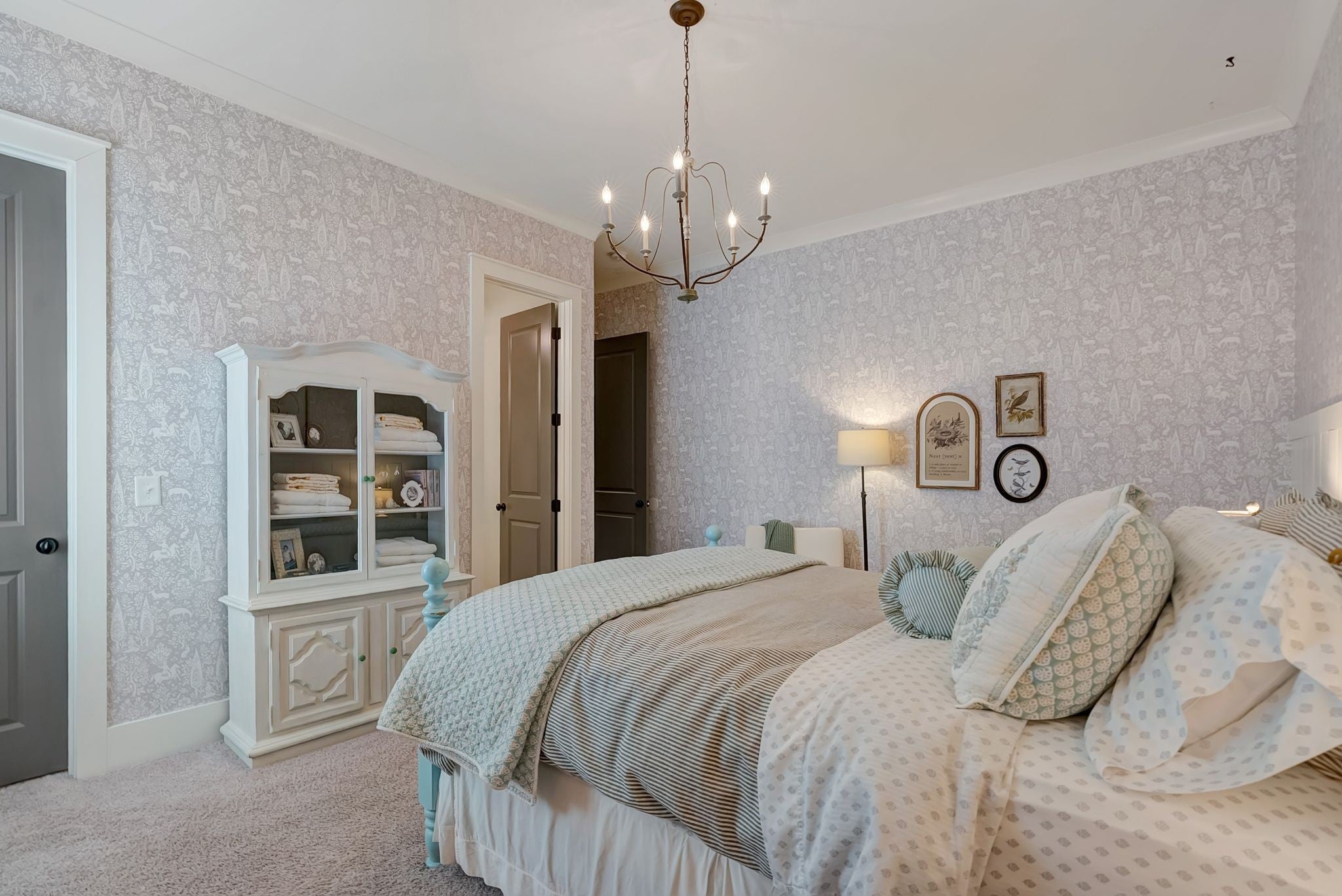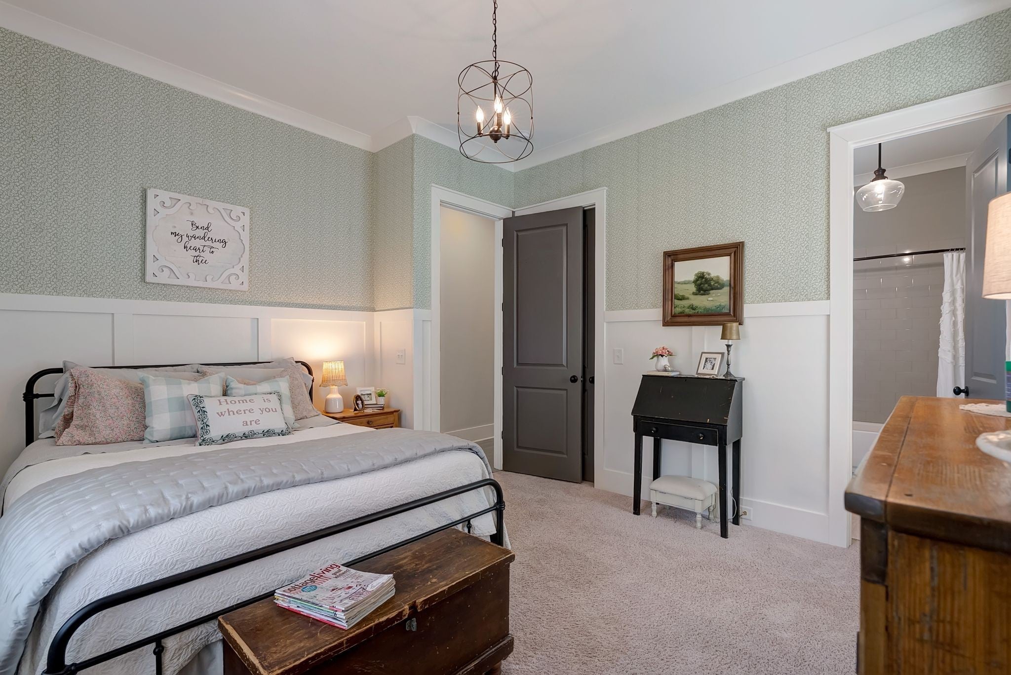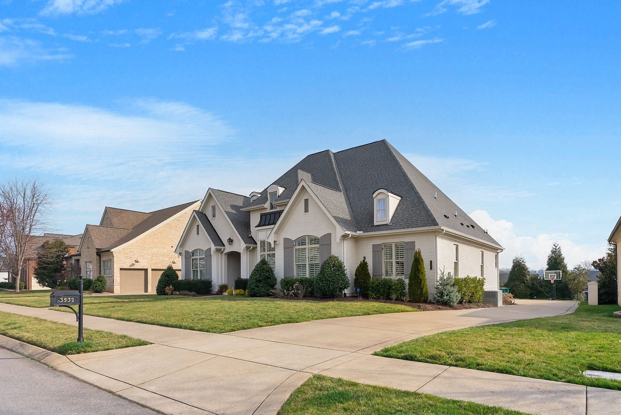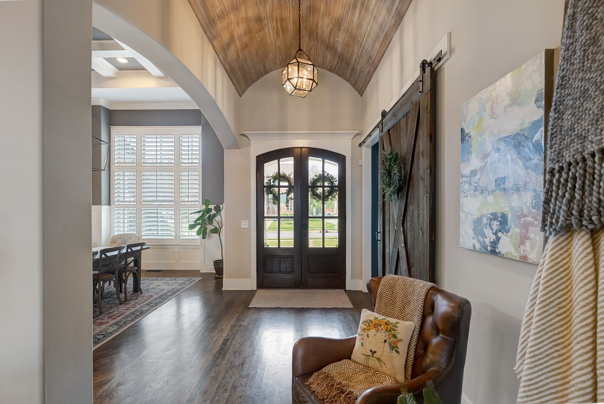 Welcome to timeless elegance in Bridgemore Village, where classic French country architecture meets beautifully curated interiors designed for both everyday living and elegant entertaining. Inside, the home feels serene, calm, and inviting, with gorgeous hardwood floors, custom trim work, designer lighting, and fresh paint and wallpaper throughout. Soaring ceilings, wood beam accents, and a stunning floor-to-ceiling fireplace in the living room create a space that feels both stately and comfortable. The heart of the home is the beautiful kitchen, featuring double ovens and an oversized island perfect for gathering, flowing effortlessly into the main living areas. One of the home’s most memorable spaces is the library-style office, complete with floor-to-ceiling built-in bookcases and a rolling ladder, offering a sophisticated and inspiring place to work or unwind. The thoughtfully designed floor plan includes five bedrooms, with four located on the main level and four en-suite, providing comfort and privacy for family and guests. The primary suite is a true retreat, featuring a peaceful sitting area and a luxurious bathroom with a large soaking tub designed for relaxation. Upstairs, a spacious bonus retreat offers the perfect flex space for a media room, playroom, or additional living area. Step outside to a vaulted screened-in porch featuring its own floor-to-ceiling fireplace, overlooking a backyard that feels like your own private secret garden, surrounded by mature trees that create rare privacy. Elegant yet comfortable, this is a home that feels as beautiful to live in as it is to see.