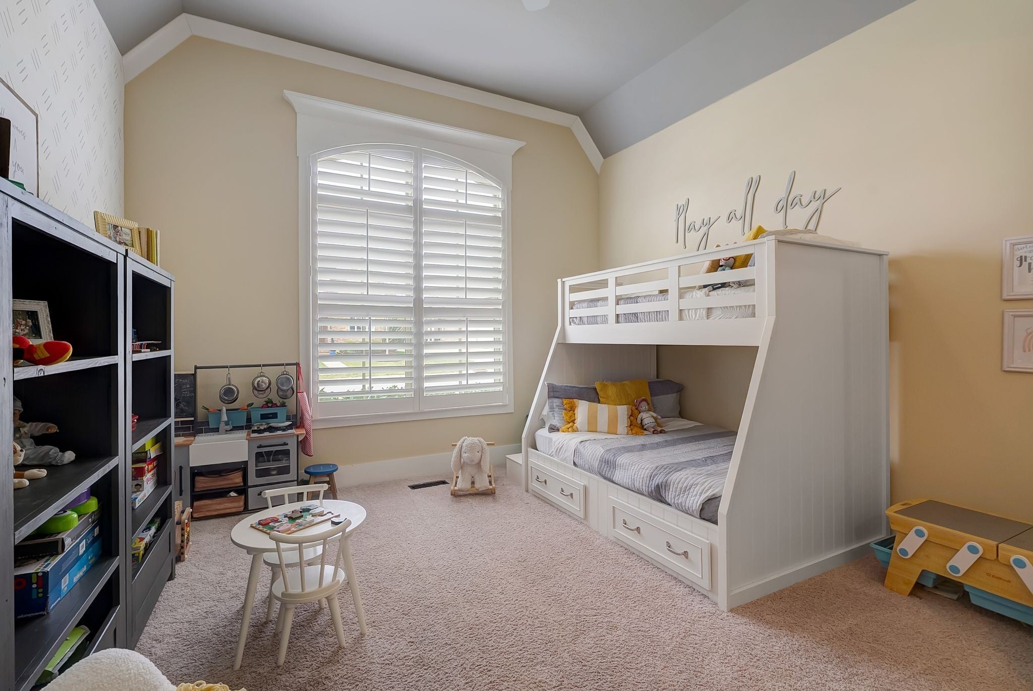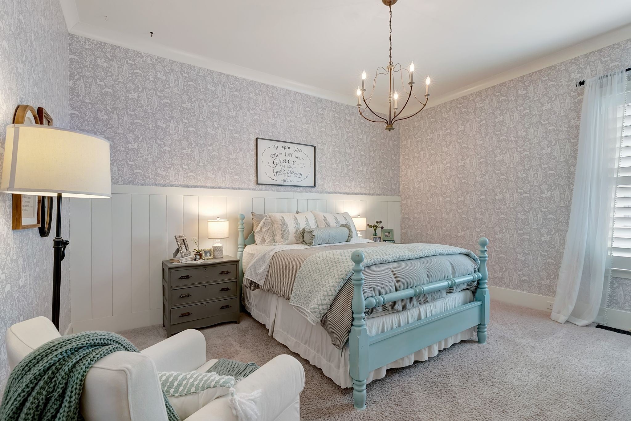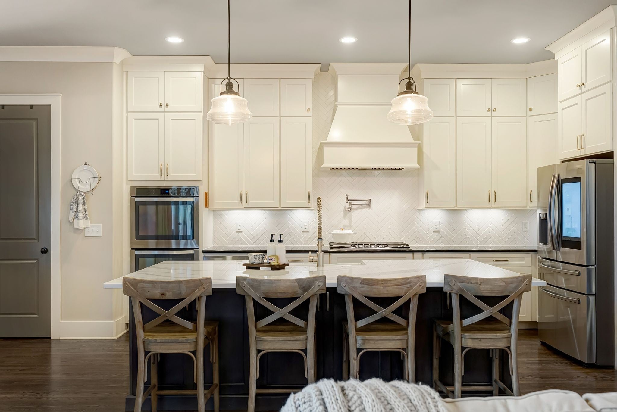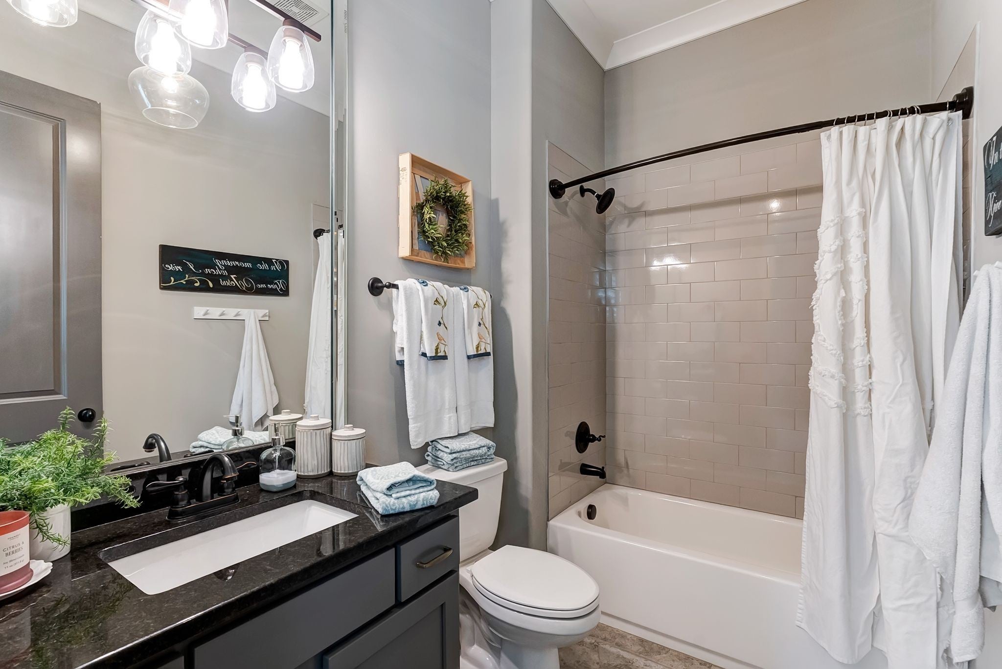 Welcome to timeless elegance in Bridgemore Village, where classic French country architecture meets beautifully curated interiors designed for both everyday living and elegant entertaining. Inside, the home feels serene, calm, and inviting, with gorgeous hardwood floors, custom trim work, designer lighting, and fresh paint and wallpaper throughout. Soaring ceilings, wood beam accents, and a stunning floor-to-ceiling fireplace in the living room create a space that feels both stately and comfortable. The heart of the home is the beautiful kitchen, featuring double ovens and an oversized island perfect for gathering, flowing effortlessly into the main living areas. One of the home’s most memorable spaces is the library-style office, complete with floor-to-ceiling built-in bookcases and a rolling ladder, offering a sophisticated and inspiring place to work or unwind. The thoughtfully designed floor plan includes five bedrooms, with four located on the main level and four en-suite, providing comfort and privacy for family and guests. The primary suite is a true retreat, featuring a peaceful sitting area and a luxurious bathroom with a large soaking tub designed for relaxation. Upstairs, a spacious bonus retreat offers the perfect flex space for a media room, playroom, or additional living area. Step outside to a vaulted screened-in porch featuring its own floor-to-ceiling fireplace, overlooking a backyard that feels like your own private secret garden, surrounded by mature trees that create rare privacy. Elegant yet comfortable, this is a home that feels as beautiful to live in as it is to see.