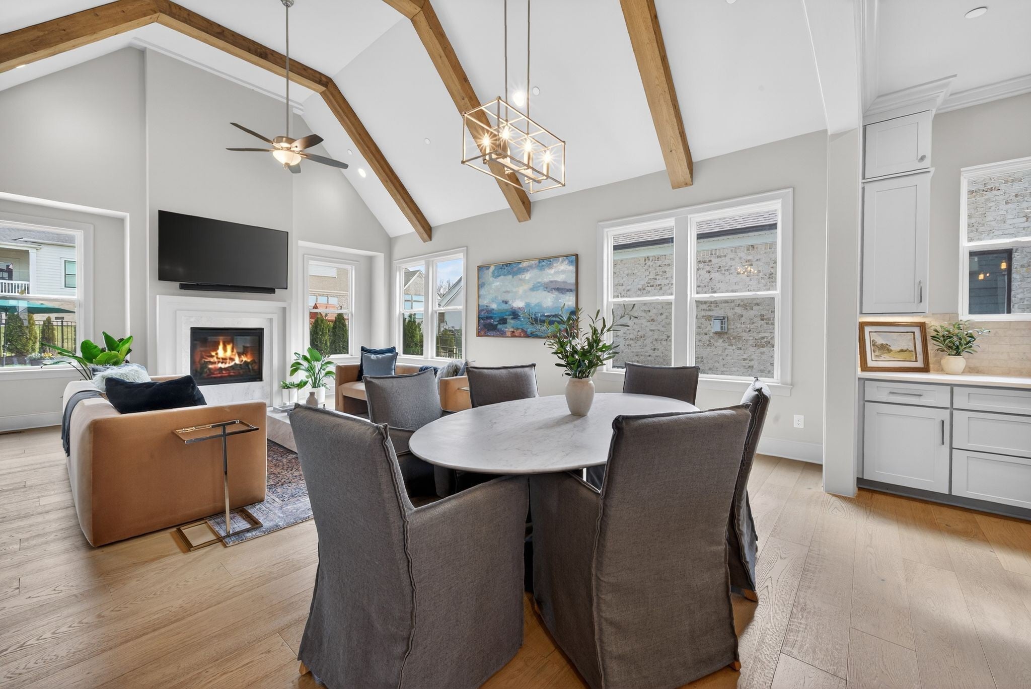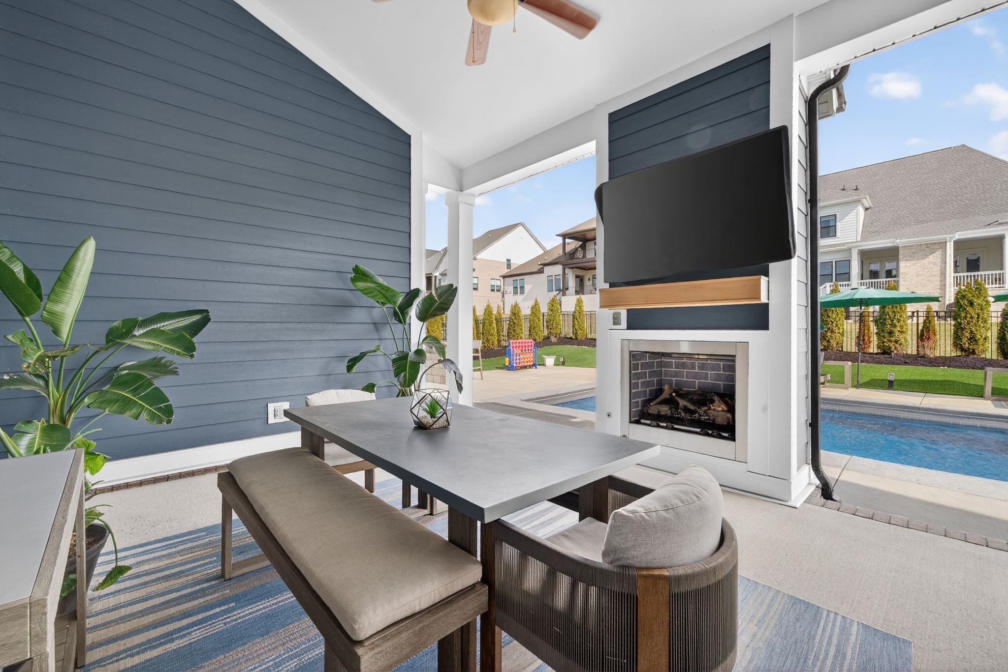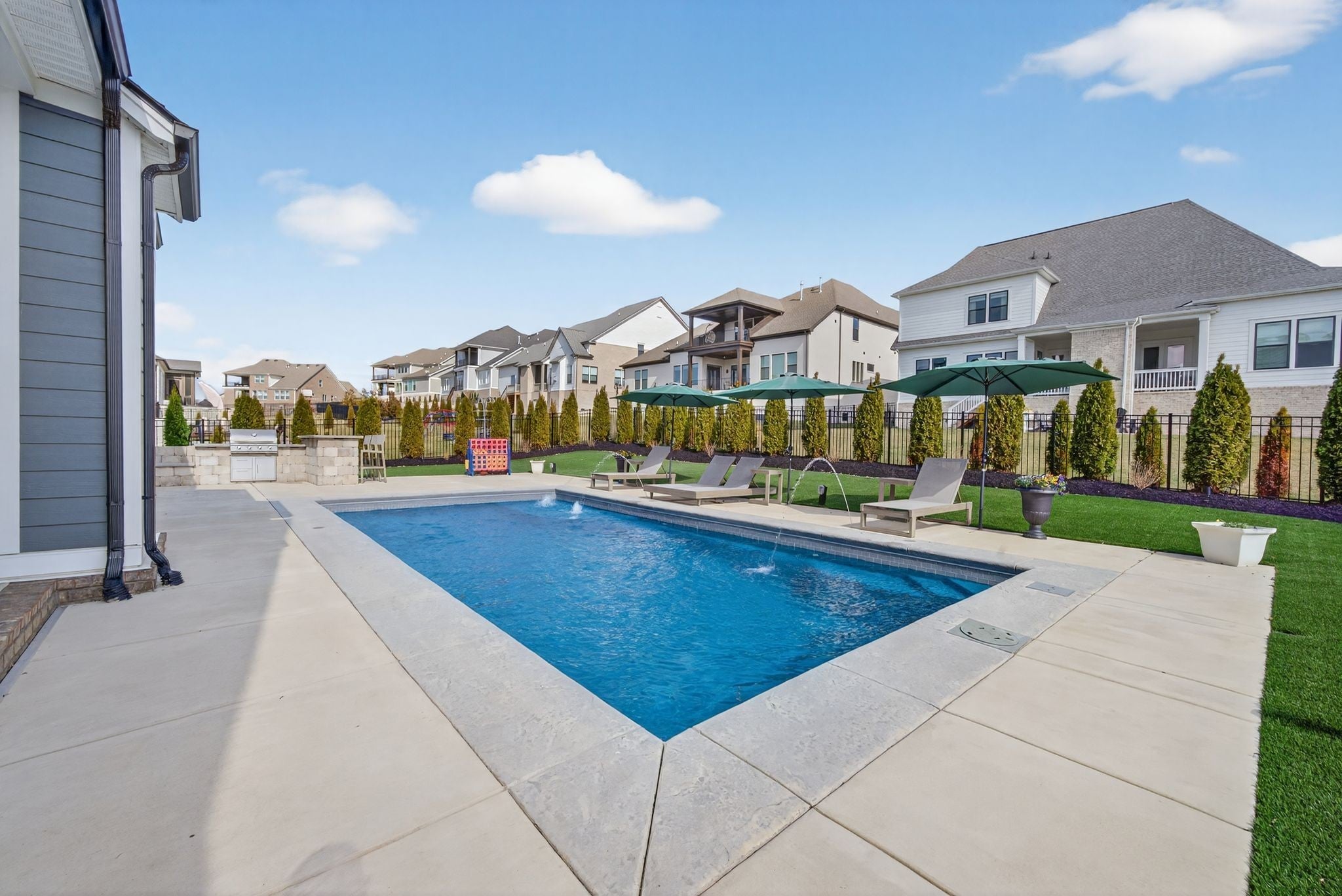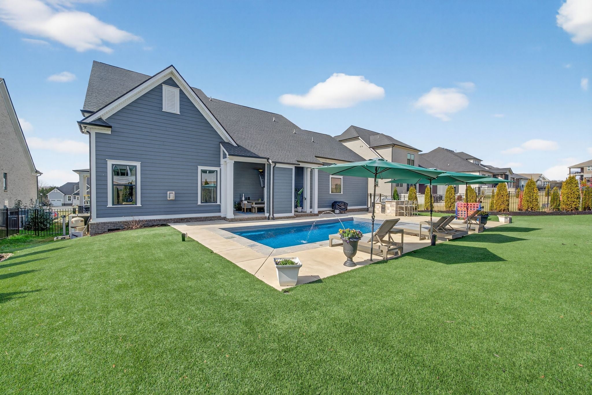 Welcome to this exceptional home in the highly sought-after Annecy community of Nolensville, where thoughtful design meets resort-style living. The main level offers a warm and inviting living room accented by beautiful wood beams and a cozy fireplace, seamlessly flowing into the dinnnig room and kitchen complete with a large island, gas cooktop, walk-in pantry with custom cabinetry, and a stylish bar area with additional cabinets. The private primary suite features dual walk-in closets, a large walk in shower and soaking tub. A main-level guest suite with its own walk-in closet and full bath offers comfort and convenience for visitors. Upstairs, you’ll find a versatile loft bonus room, three generously sized bedrooms—each with access to a bathroom—a dedicated home office, and a separate exercise room, giving everyone space to live, work, and play. Step outside to your own backyard retreat. The covered patio with fireplace overlooks a stunning saltwater pool, artificial turf, extended patio space, and an outdoor kitchen/ bar area. Privacy trees and a fenced yard create a serene, secluded setting perfect for year-round enjoyment. A whole-home water softener adds an extra touch of comfort and quality. Located in a vibrant community with frequent neighborhood events and fantastic amenities including neighborhood lawn space just steps from your driveway, a walking trail that connects to miles of scenic trails, a community pool, and a playground. All zoned for top-rated Williamson County Schools.