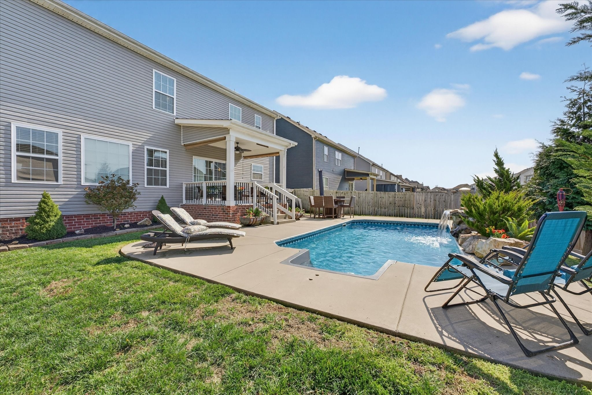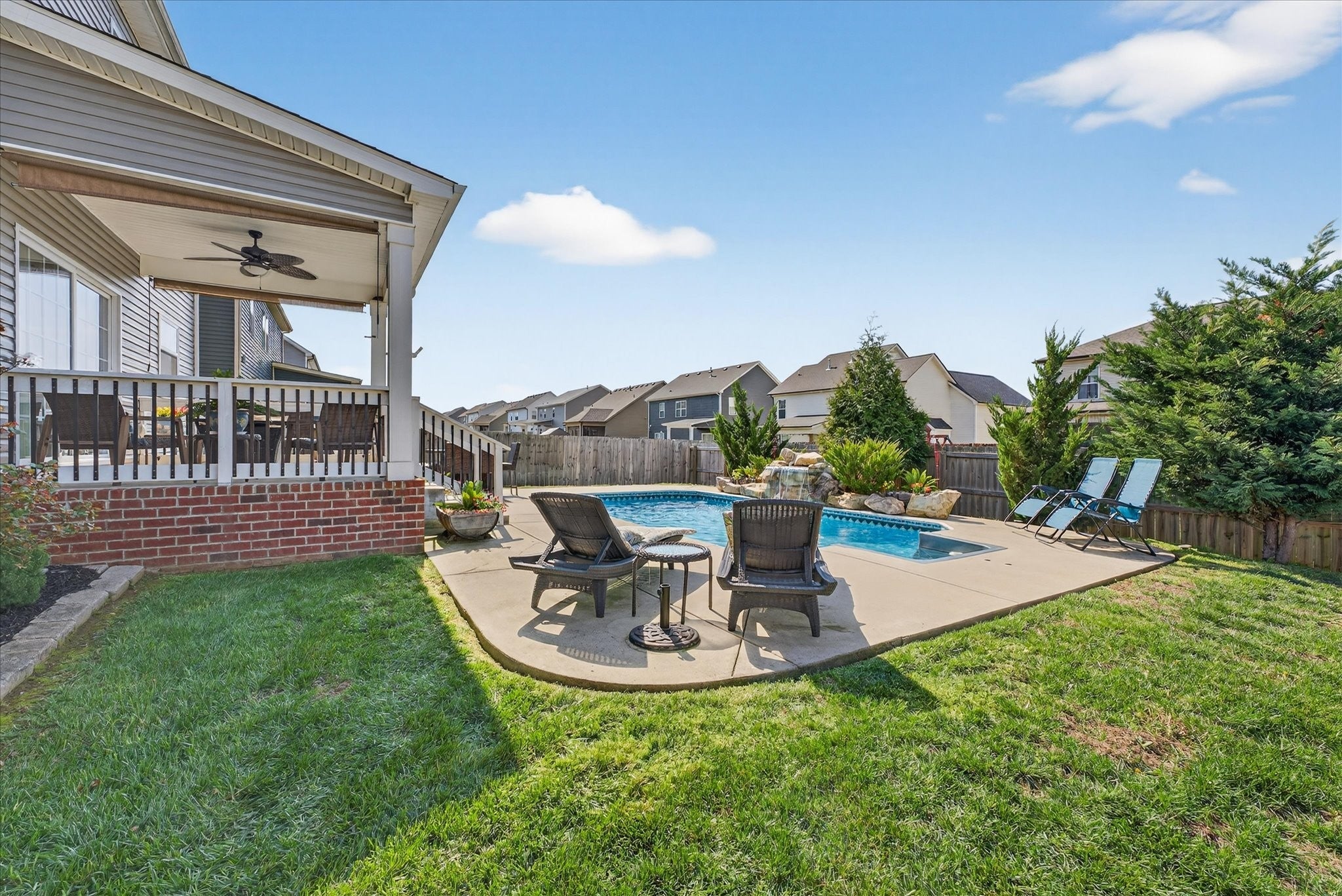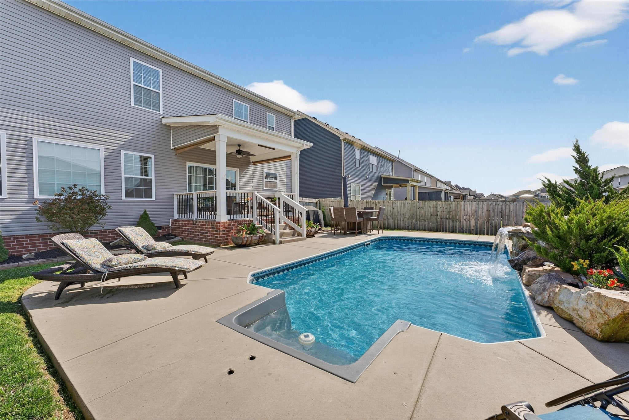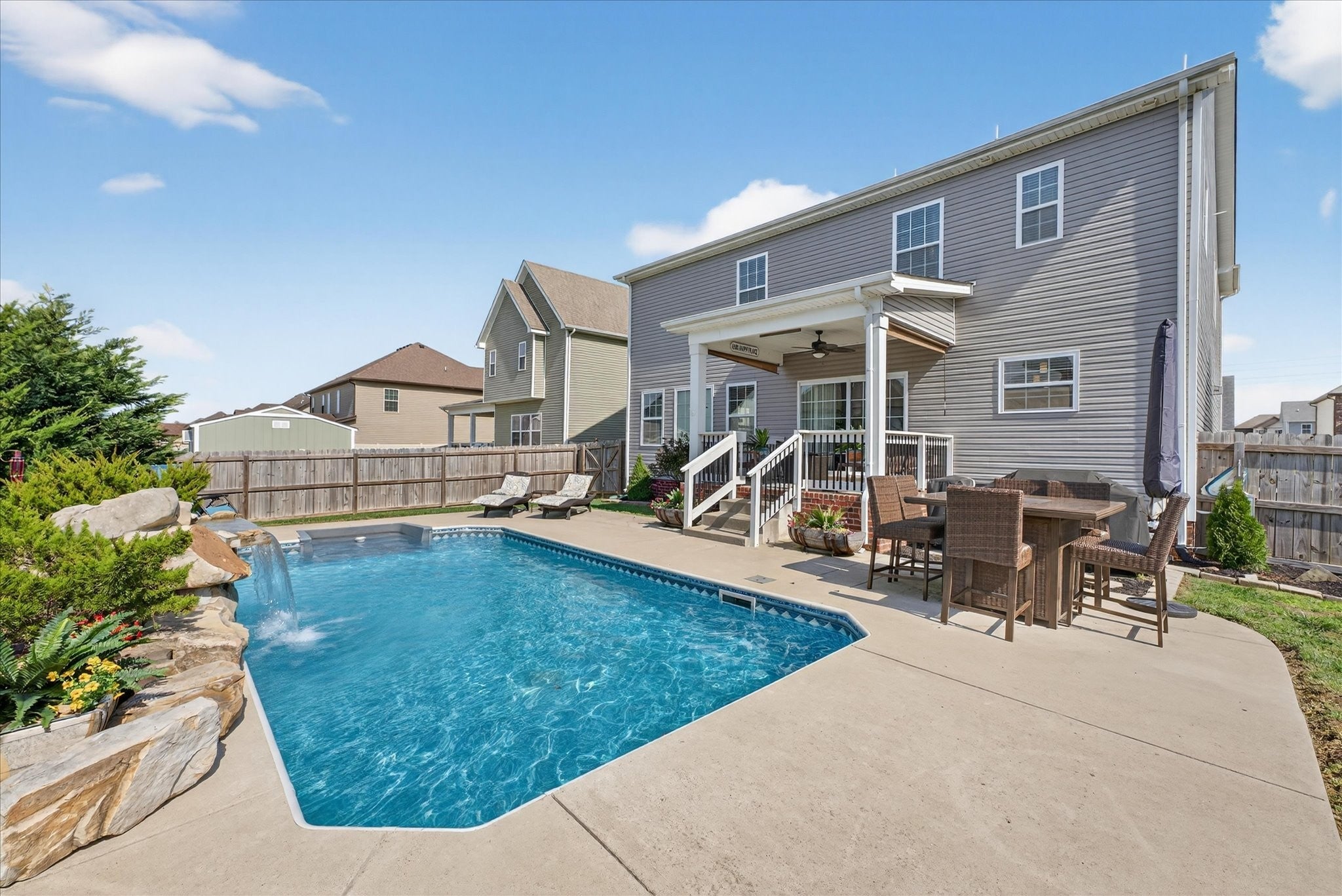 An immaculate 4-bedroom, 2.5-bath home that has been meticulously maintained and thoughtfully styled throughout. The open-concept layout offers comfortable everyday living and effortless entertaining. The kitchen features granite countertops, ample cabinetry, and a pantry, flowing seamlessly into the main living space. A versatile flex room on the main level provides the perfect setting for a formal dining room, home office, or additional sitting area, along with a mud room and walk-in utility room for added convenience. Upstairs, you’ll find a spacious bonus area and generously sized bedrooms—each with walk-in closets. The primary suite offers a peaceful retreat with dual walk-in closets, double vanities, and a separate tiled shower and soaking tub. Custom blinds throughout the home carry a lifetime warranty. Step outside to a covered patio overlooking a privacy-fenced backyard with an in-ground pool and custom-built waterfall feature—perfect for relaxing or entertaining. Located just minutes from Interstate 24, shopping, entertainment and other amenities. VA to VA assumable at 2.75% interest rate. Home warranty included and will transfer to the new homeowner at closing.