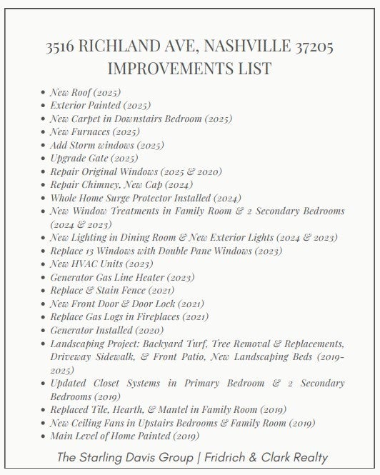 Charming, 4-bed Tudor cottage strategically located in Nashville’s established Richland West End neighborhood seamlessly blends historic architecture and modern functionality. Located at 3516 Richland Ave, this expanded 1920 residence offers 4,231 sqft, 3.5 baths, flexible living spaces, and convenient access to downtown businesses, area universities, and two major medical centers. Hardwood floors and generous natural light define the main living areas. The redesigned kitchen features marble surfaces, stainless steel appliances, and double ovens, ideal for hosting small gatherings or quiet evenings in. The primary suite offers a well-appointed bath, double closets, and comfortable separation from secondary bedrooms. The finished lower level includes a private bedroom and full bath. A dedicated office, workshop, and multiple storage and flex rooms support remote work. Numerous updates include energy efficient windows, a standby generator, new furnace/HVAC units, whole home surge protection, and the absence of overhanging trees offer peace of mind for the next owner. Outdoors, enjoy a fenced partially-turf backyard, back patio, and a motorized alley gate lead to the driveway and one car garage. Front driveway offers 3-space off-street parking and minimal level transitions from sidewalk to home enhance day-to-day ease. See attached features sheet for additional updates and upgrades!