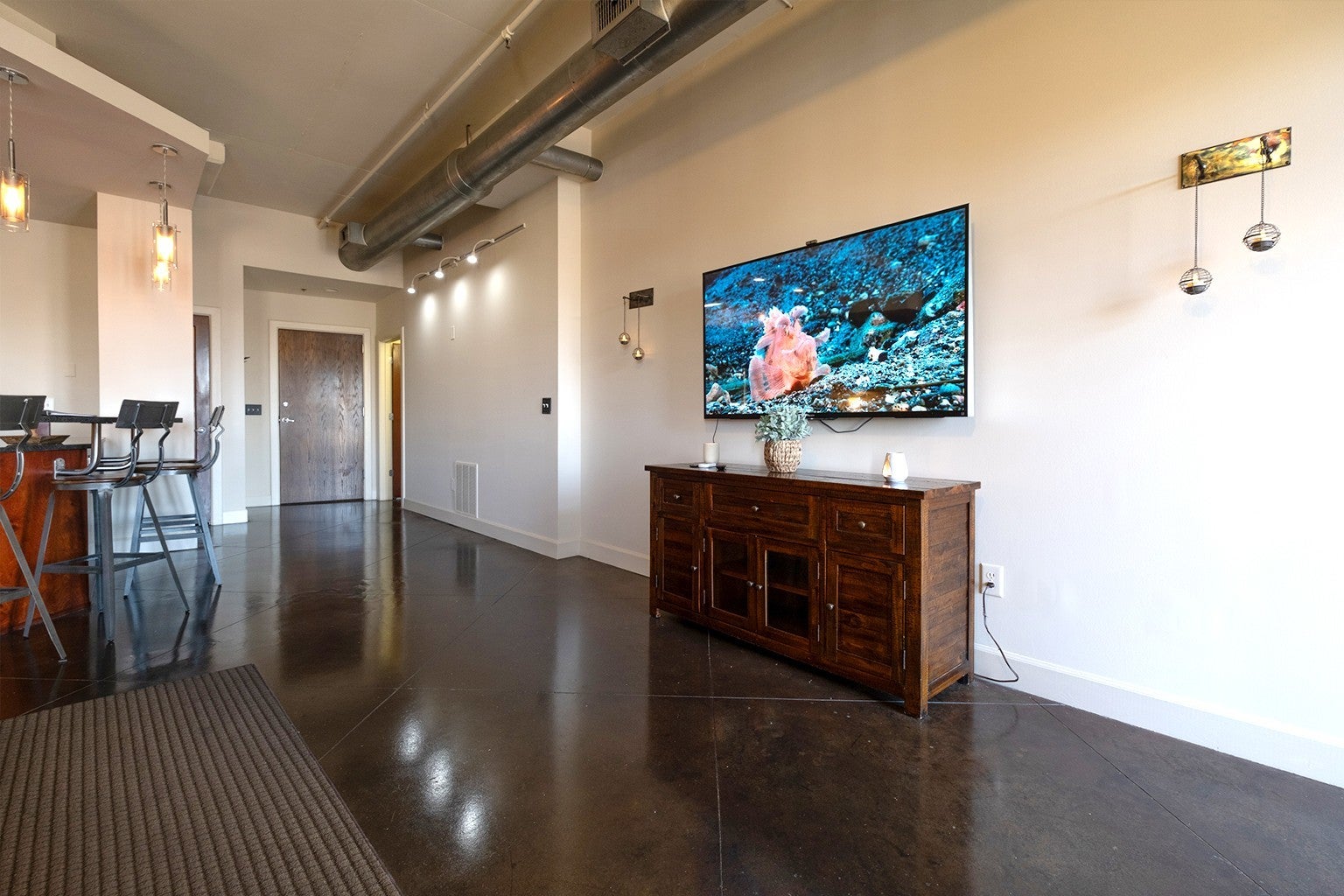 Warm and stylish loft with 10.5’ ceilings, tall windows, and contemporary lighting. Features polished concrete floors, fresh paint, and an open kitchen with entertainment bar. Most all furniture remains! Washer, dryer, and refrigerator remain! Enjoy a private balcony (wonderful downtown view in winter) and widened, inclined parking space with ADA access. Newer appliances, HVAC and water heater. Urban charm just minutes from Vanderbilt!