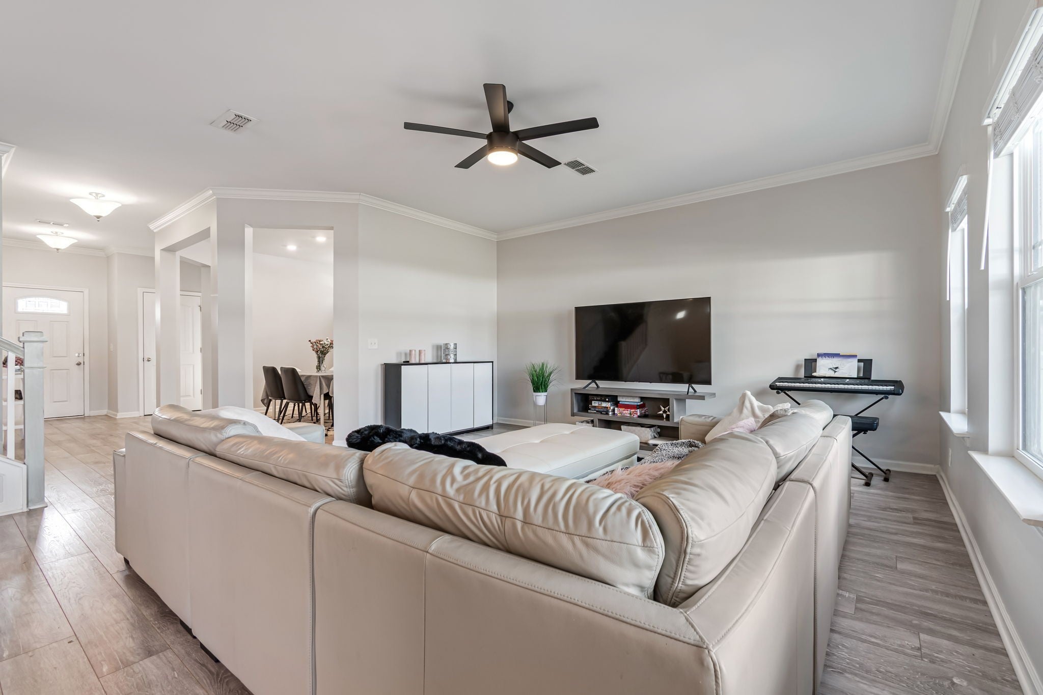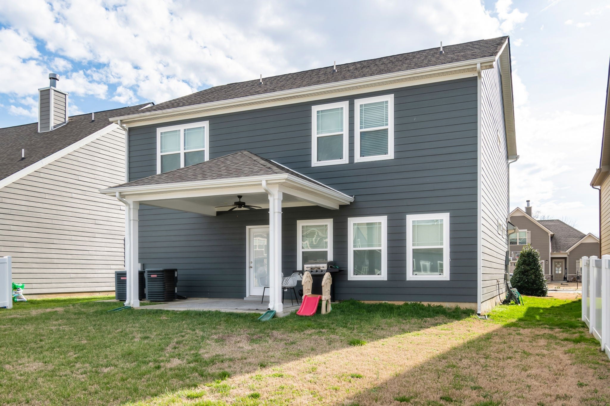 Built in 2019, this well-kept 5-bedroom home offers space, comfort, and a great location in Murfreesboro’s Enclave at Berkshire community. The main level features an open floor plan with low-maintenance laminate flooring and plenty of natural light. The kitchen includes stone countertops, stainless appliances, a pantry, and a center island with sink and bar seating, creating an easy flow for everyday living or entertaining. Upstairs you’ll find all five bedrooms along with a conveniently located laundry room. The primary suite offers a spacious layout with a walk-in closet and a private bath featuring both a soaking tub and separate shower. The large bonus room above the garage (14x17) includes a closet and window, offering flexibility as a fifth bedroom, home office, or media room. Step outside to the covered back patio with ceiling fan, overlooking the green common area behind the home that adds extra breathing room and a pleasant view of trees. Additional features include fresh interior paint, wood window blinds throughout, a covered front porch, two-car garage, and concrete driveway. Residents of The Enclave at Berkshire enjoy sidewalks throughout the neighborhood along with a pool, clubhouse, park, playground, and regular community events. Convenient access to I-840 makes it easy to reach the greater Murfreesboro area and beyond. **Siding replaced above garage, new pictures coming soon**