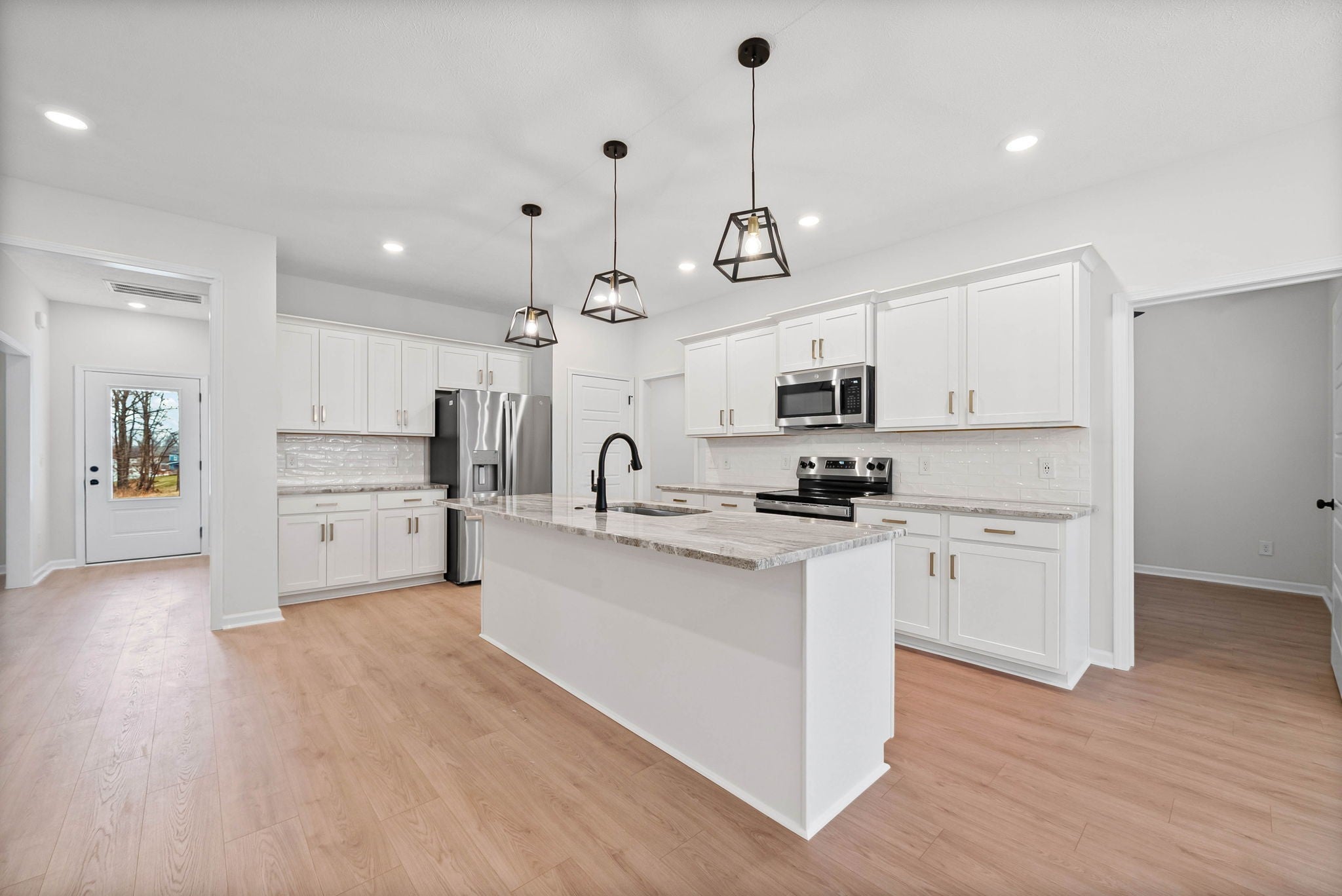 Brand new five-bedroom home with a dedicated office and a spacious three-car garage, perfectly situated on a massive wooded lot in beautiful Clarksville, TN. Designed with modern lifestyles in mind, the open-concept layout features a chef-inspired island kitchen with gleaming natural stone countertops, shiny stainless steel appliances, a pantry, and seating at the oversized island—ideal for both casual dining and entertaining. A separate dining area is perfect for larger gatherings. On the main level, you’ll find a private office for work-from-home days, a spacious bedroom with a full bath and a family drop zone off the garage for daily convenience. Upstairs, four more generously sized bedrooms surround a full bathroom and an actual laundry room—not just a closet. The luxurious owner’s suite is a true retreat, featuring double vanities, a tiled walk-in shower with glass surround, and ample space to relax. Step outside to enjoy the tranquility of your covered back patio overlooking mature trees and a private wooded backyard—an increasingly rare find in Clarksville. This exceptional five-bedroom home for sale in Clarksville TN offers the perfect blend of space, function, and style, making it a must-see for any serious buyer searching for new construction in a peaceful, nature-filled setting. Don’t miss your chance to own this rare gem near to shopping, dining and easy access to Fort Campbell!