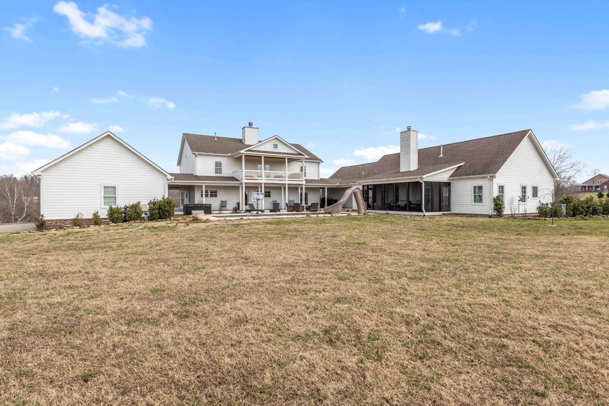 Own a 36-acre private farm in Bethpage featuring a custom estate home, SEPARATE. guest home, rolling pasture, & a large spring-fed pond ideal for horses or cattle. Surrounded by woods & creeks, the property offers exceptional privacy while still being convenient to town. The custom-built main home offers 5 bedrooms, 4 full baths, with a spacious open floor plan. Very large bedrooms all connected to bathrooms. The chef’s kitchen is built for entertaining with a KitchenAid 60-inch six-burner range w/ double ovens & griddle, extensive custom cabinetry, quartz countertops, & a huge island overlooking the great room. A double-sided fireplace connects the kitchen & living area. The oversized primary suite is on the main level, & the home features beautiful custom woodwork, shiplap walls, hardwood floors, & tile throughout. Step outside to enjoy the inground fiberglass pool with slide, large deck, & covered porch overlooking the pool. A separate entrance leads directly to the mudroom with laundry & bath, making pool days easy. The property also includes a second custom-built home with 2 bedrooms & 2 baths, an open floor plan, large island kitchen overlooking the great room w/fireplace, screened porch, & 2-car garage—perfect for extended family, guests, or potential rental income. Farm features include rolling pasture, large spring-fed pond, equipment barn, & a custom chicken coop designed to match the main home. The main home includes a 3-car garage, bringing total garage space to 5 cars. Additional upgrades include a whole-house Generac generator that activates within seconds of a power outage, a 1,000-gallon buried propane tank supplying gas to the kitchen and generator. Conveniently located 15 minutes from Gallatin with easy access to Publix, Kroger, Super Walmart, restaurants, parks, and multiple boat ramps on Old Hickory Lake. Also less than an hour to Nashville International Airport and Vanderbilt Medical Center.
