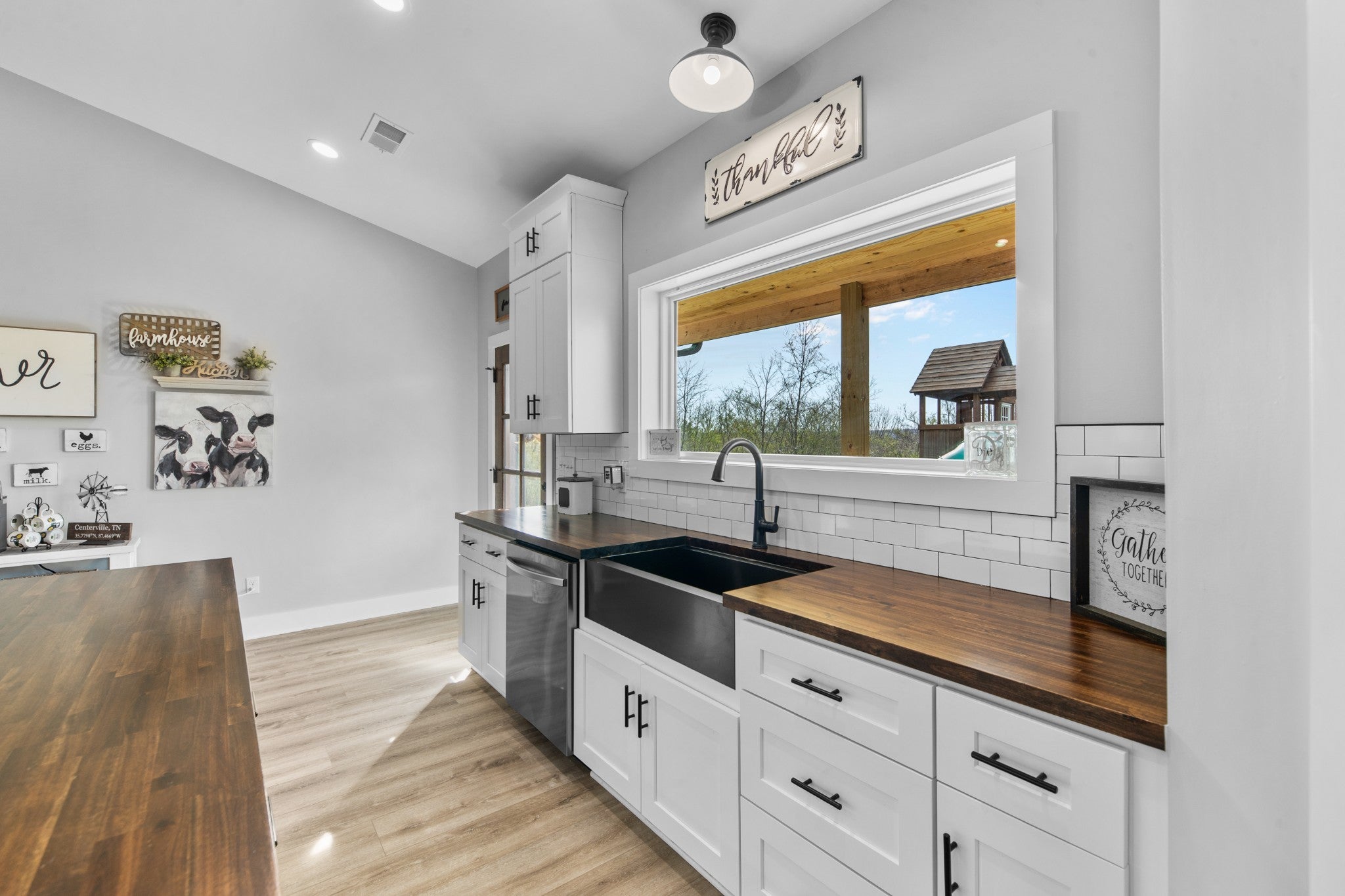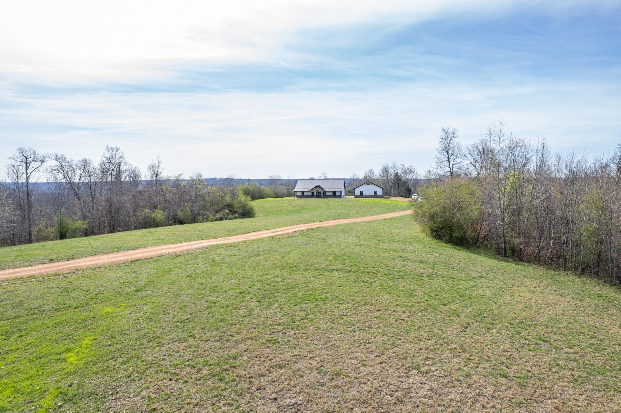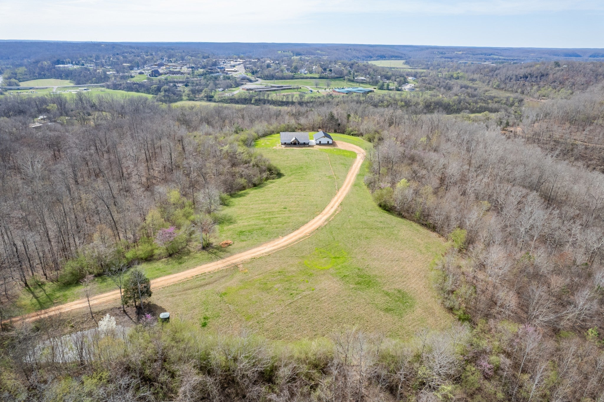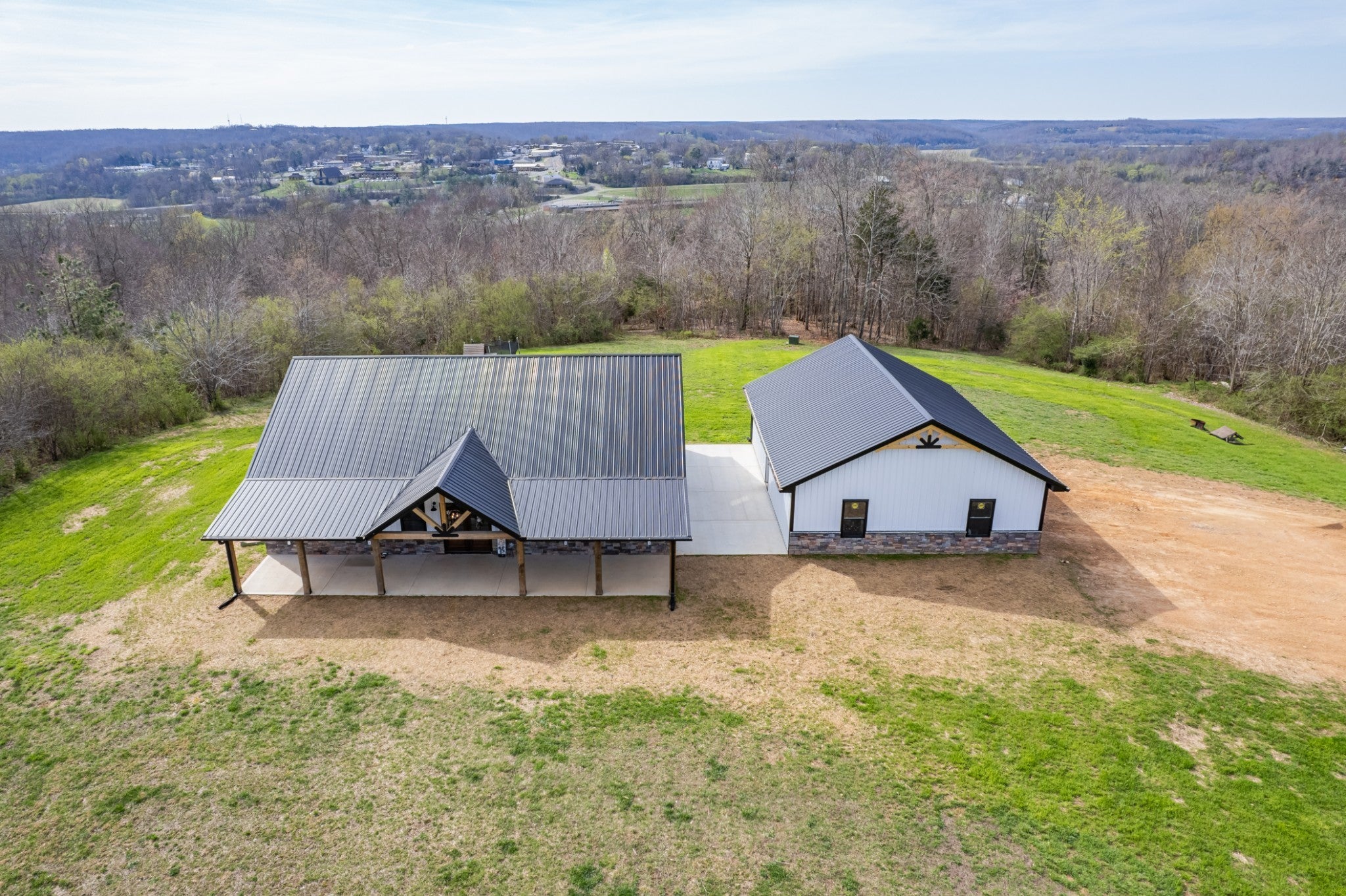 Scenic & Secluded Sanctuary overlooking Centerville! Welcome Home to this beautifully built 2,000 sq ft Farmhouse style 3bdrm/2bath BARNDO on 45.23 Acres w/Detached Garage. This home blends rustic charm with laid-back country living. Perched high above the scenic Duck River and overlooking the timeless Town of Centerville, TN. This tract offers Plenty of Open Field for Farming or Furbabies, yet surrounded by Heavily Wooded Rolling Terrain. Imagine winding past the pond, and down the driveway to your Perfect Getaway called “HOME”! Step into the open great room with vaulted ceilings and a stunning shiplap and stone fireplace wrapped in a heavy beam mantle. The kitchen is straight out of a farmhouse dream with shaker-style white cabinetry, butcher block countertops, subway tile backsplash, Stainless Steel Appliances, a bold black built-in range hood, and a shiplap-accented island. A walk-in pantry with a stained pine door adds warmth and character. The spacious primary suite offers a walk-in closet and a beautifully tiled shower with subway tile walls and glass door. Granite countertops, shaker cabinetry, and durable LVP flooring throughout the home keep things both stylish and practical. Outside is where this one really shines…Enjoy a 500 sq ft covered front porch with tongue-and-groove ceiling, gorgeous stone accents, a spacious covered back porch, and a wide-open concrete patio breezeway connecting to the 1,200 sq ft detached 2-car garage. This property allows you room to spread out and enjoy true country living.