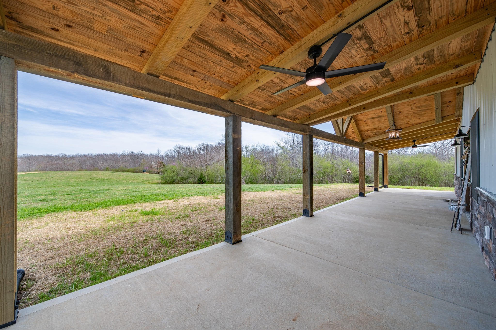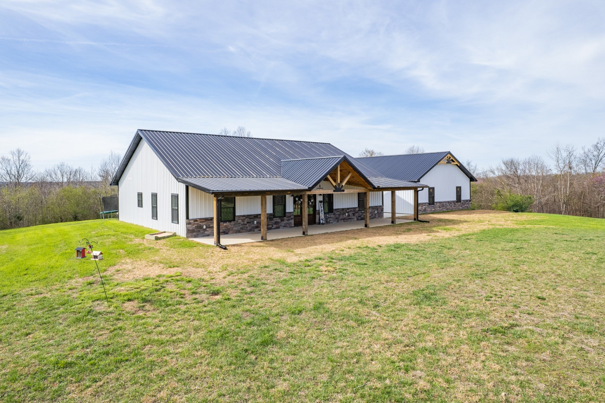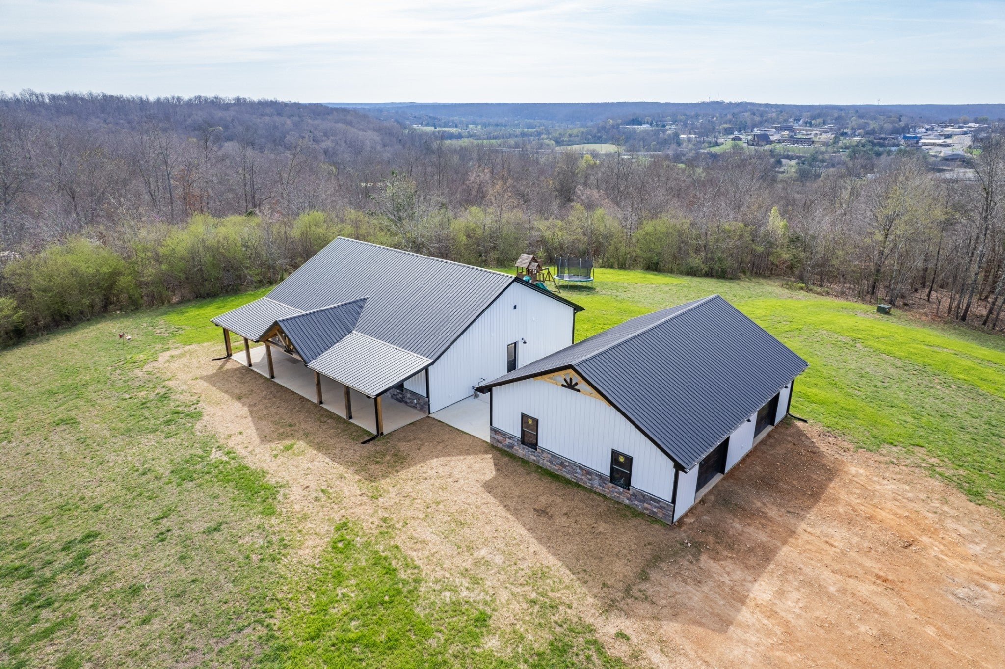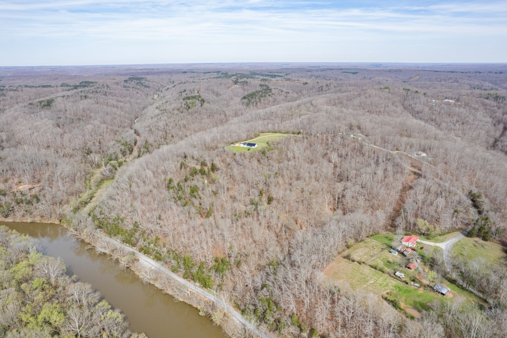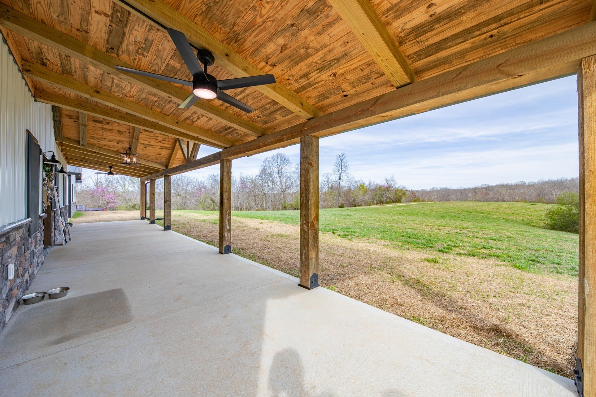 Scenic & Secluded Sanctuary overlooking Centerville! Welcome Home to this beautifully built 2,000 sq ft Farmhouse style 3bdrm/2bath BARNDO on 45.23 Acres w/Detached Garage. This home blends rustic charm with laid-back country living. Perched high above the scenic Duck River and overlooking the timeless Town of Centerville, TN. This tract offers Plenty of Open Field for Farming or Furbabies, yet surrounded by Heavily Wooded Rolling Terrain. Imagine winding past the pond, and down the driveway to your Perfect Getaway called “HOME”! Step into the open great room with vaulted ceilings and a stunning shiplap and stone fireplace wrapped in a heavy beam mantle. The kitchen is straight out of a farmhouse dream with shaker-style white cabinetry, butcher block countertops, subway tile backsplash, Stainless Steel Appliances, a bold black built-in range hood, and a shiplap-accented island. A walk-in pantry with a stained pine door adds warmth and character. The spacious primary suite offers a walk-in closet and a beautifully tiled shower with subway tile walls and glass door. Granite countertops, shaker cabinetry, and durable LVP flooring throughout the home keep things both stylish and practical. Outside is where this one really shines…Enjoy a 500 sq ft covered front porch with tongue-and-groove ceiling, gorgeous stone accents, a spacious covered back porch, and a wide-open concrete patio breezeway connecting to the 1,200 sq ft detached 2-car garage. This property allows you room to spread out and enjoy true country living.