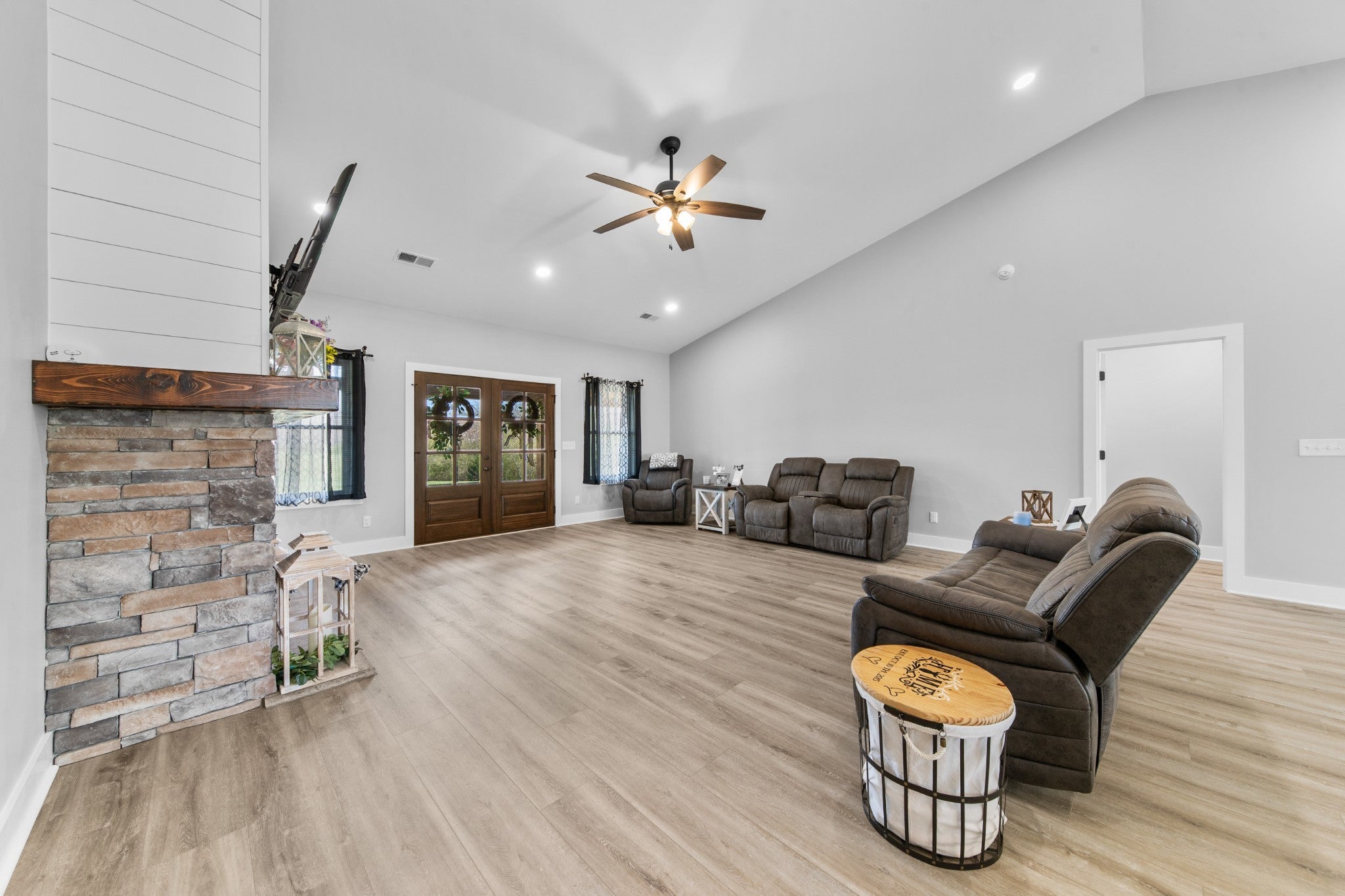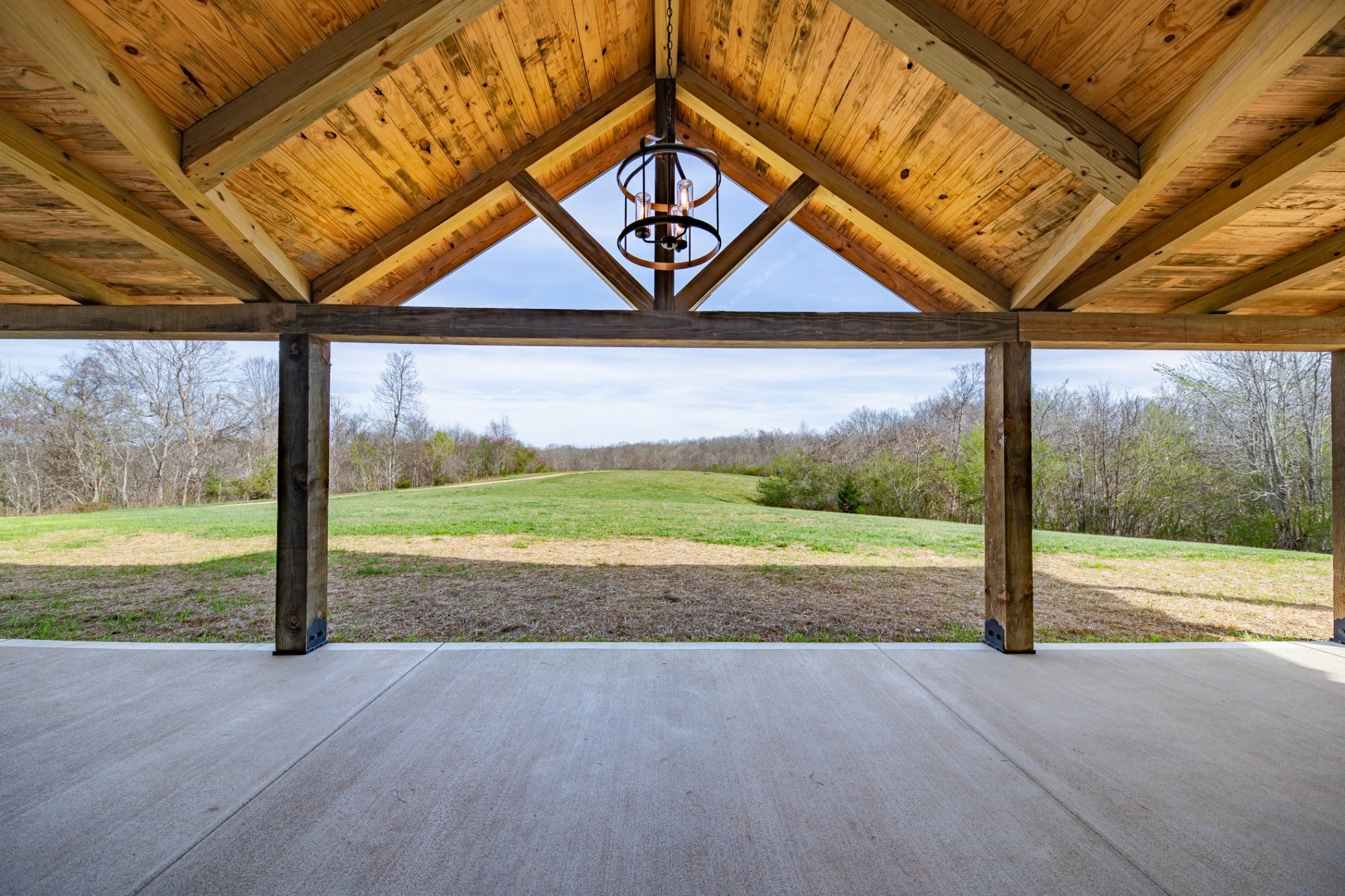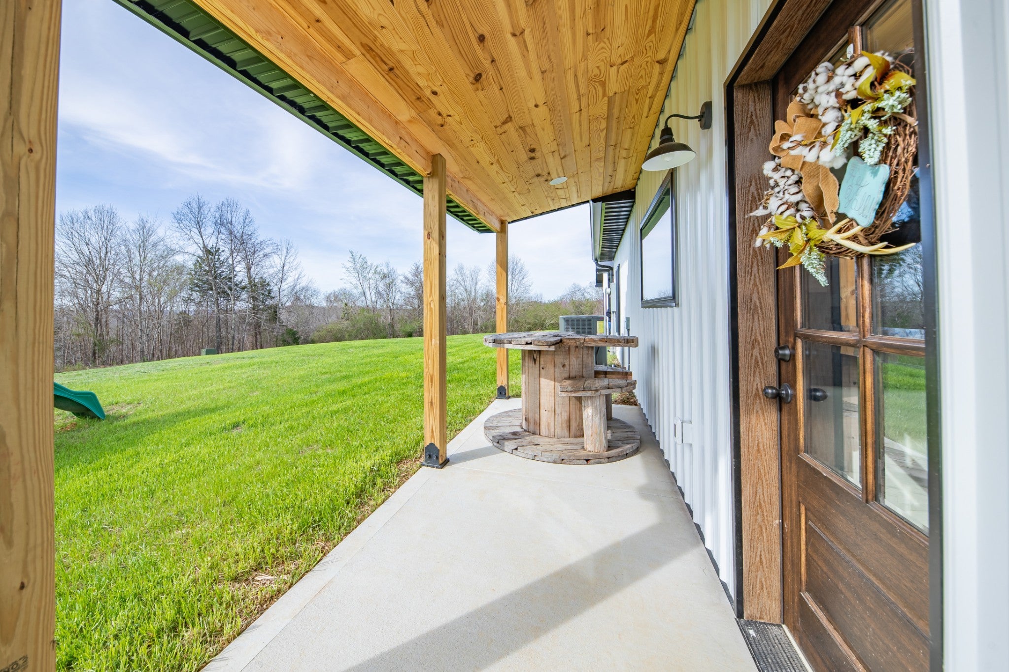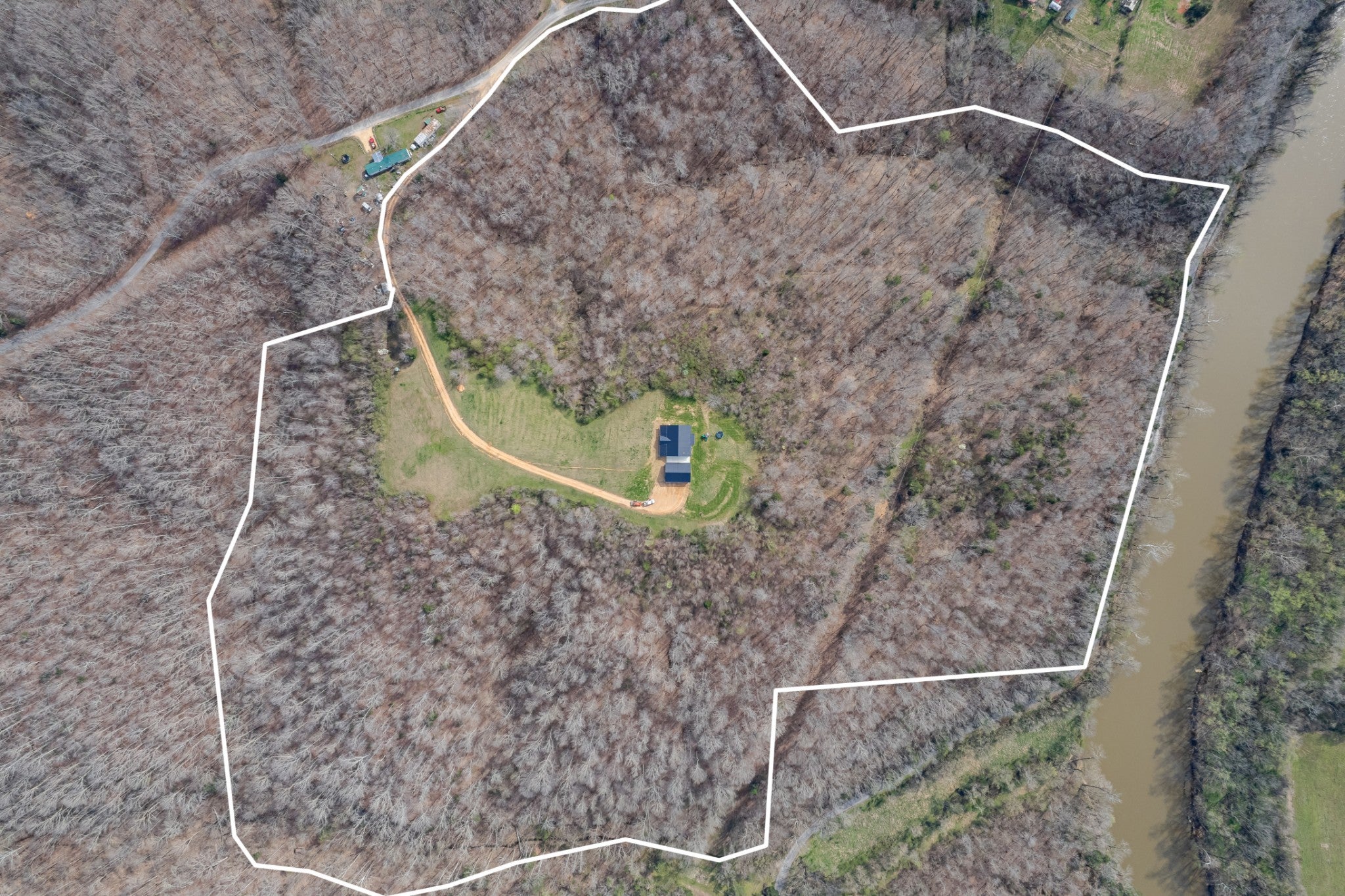 Scenic & Secluded Sanctuary overlooking Centerville! Welcome Home to this beautifully built 2,000 sq ft Farmhouse style 3bdrm/2bath BARNDO on 45.23 Acres w/Detached Garage. This home blends rustic charm with laid-back country living. Perched high above the scenic Duck River and overlooking the timeless Town of Centerville, TN. This tract offers Plenty of Open Field for Farming or Furbabies, yet surrounded by Heavily Wooded Rolling Terrain. Imagine winding past the pond, and down the driveway to your Perfect Getaway called “HOME”! Step into the open great room with vaulted ceilings and a stunning shiplap and stone fireplace wrapped in a heavy beam mantle. The kitchen is straight out of a farmhouse dream with shaker-style white cabinetry, butcher block countertops, subway tile backsplash, Stainless Steel Appliances, a bold black built-in range hood, and a shiplap-accented island. A walk-in pantry with a stained pine door adds warmth and character. The spacious primary suite offers a walk-in closet and a beautifully tiled shower with subway tile walls and glass door. Granite countertops, shaker cabinetry, and durable LVP flooring throughout the home keep things both stylish and practical. Outside is where this one really shines…Enjoy a 500 sq ft covered front porch with tongue-and-groove ceiling, gorgeous stone accents, a spacious covered back porch, and a wide-open concrete patio breezeway connecting to the 1,200 sq ft detached 2-car garage. This property allows you room to spread out and enjoy true country living.