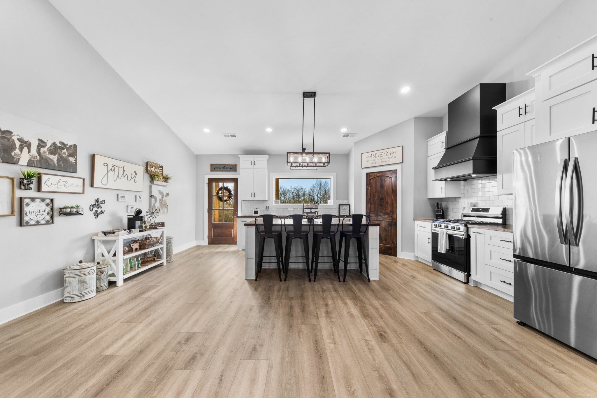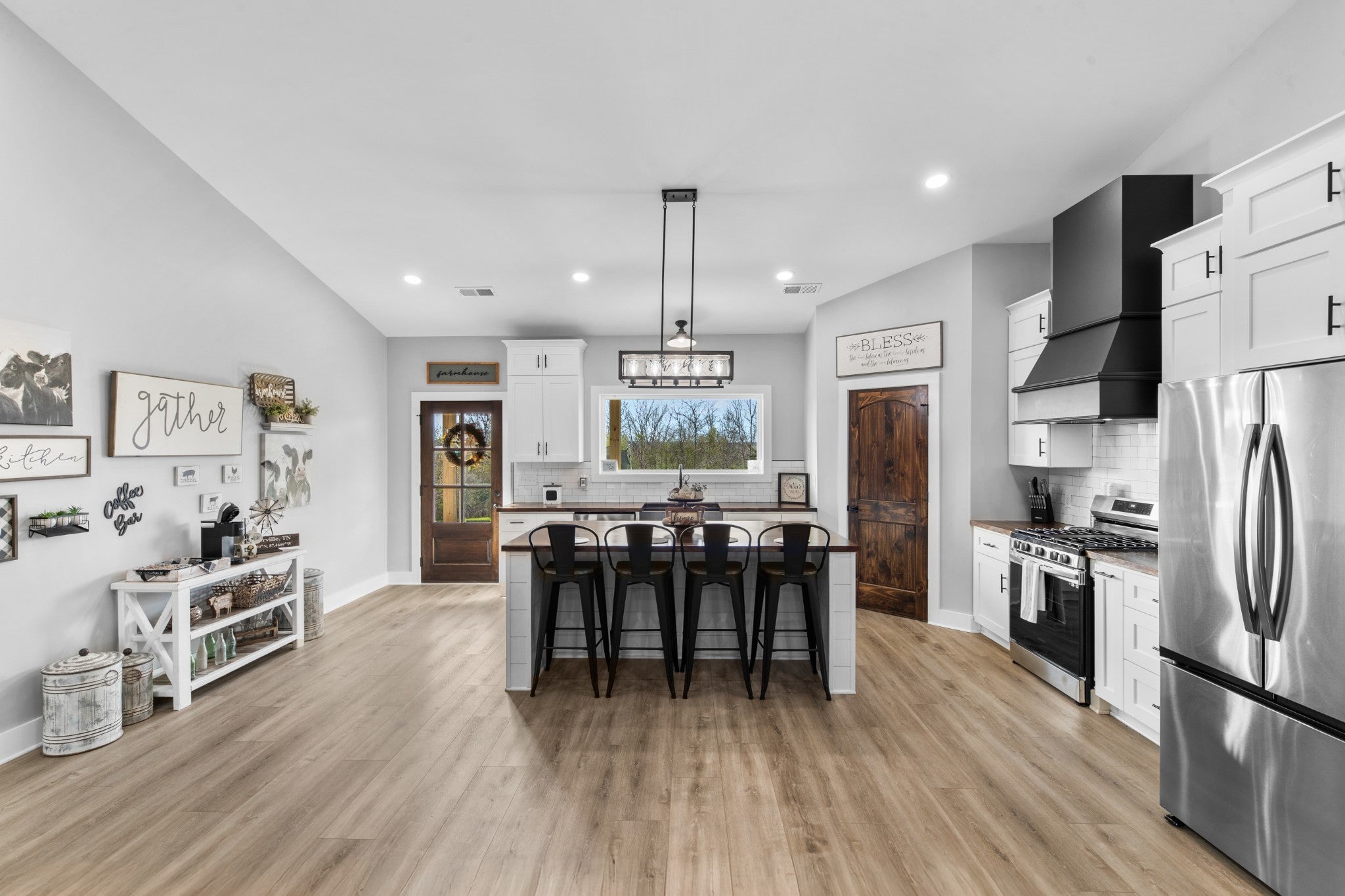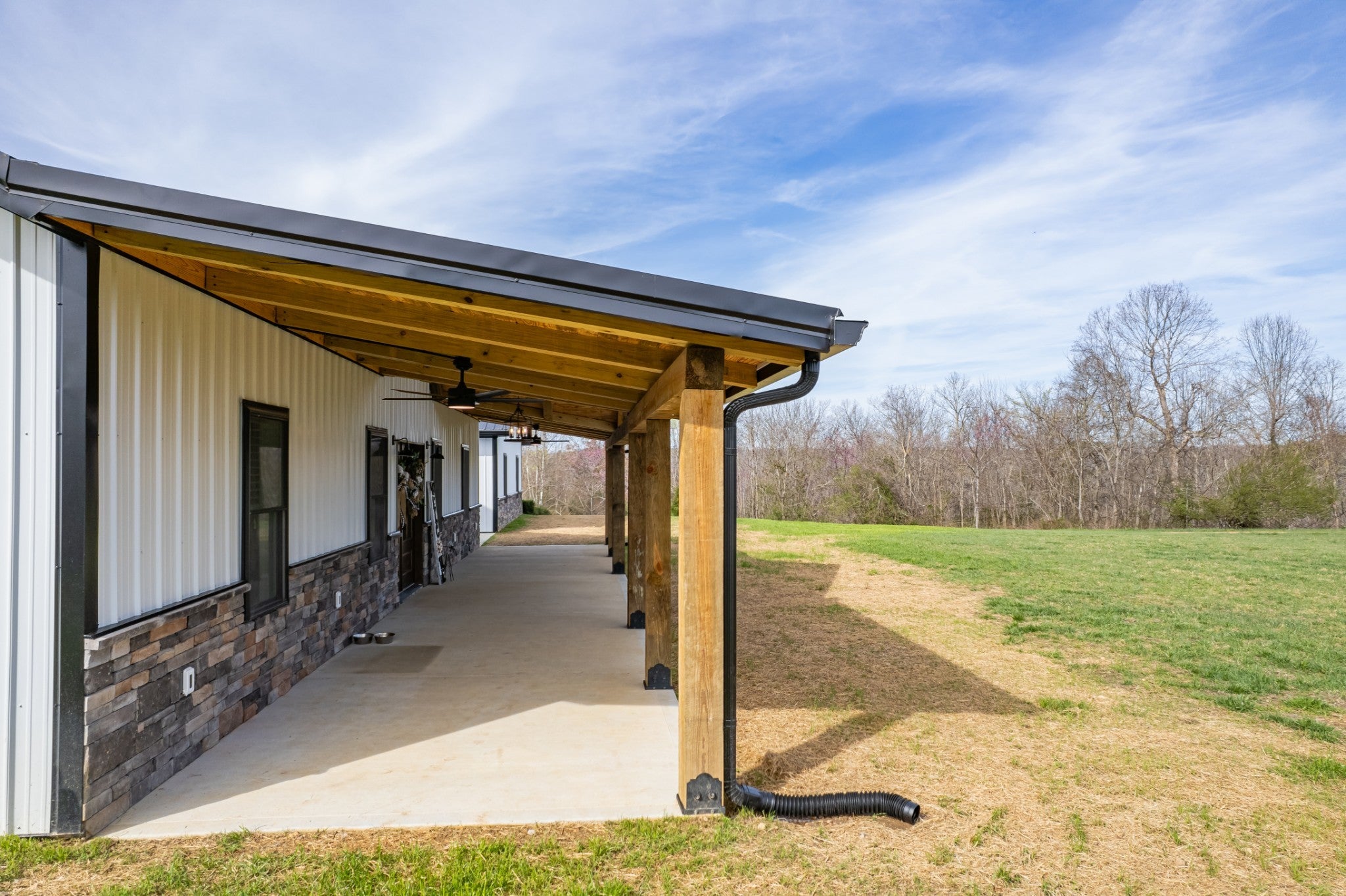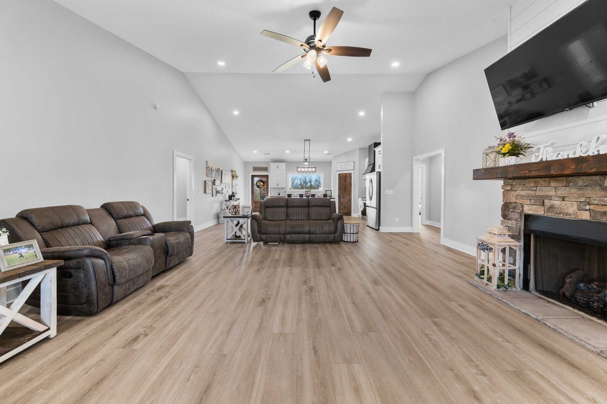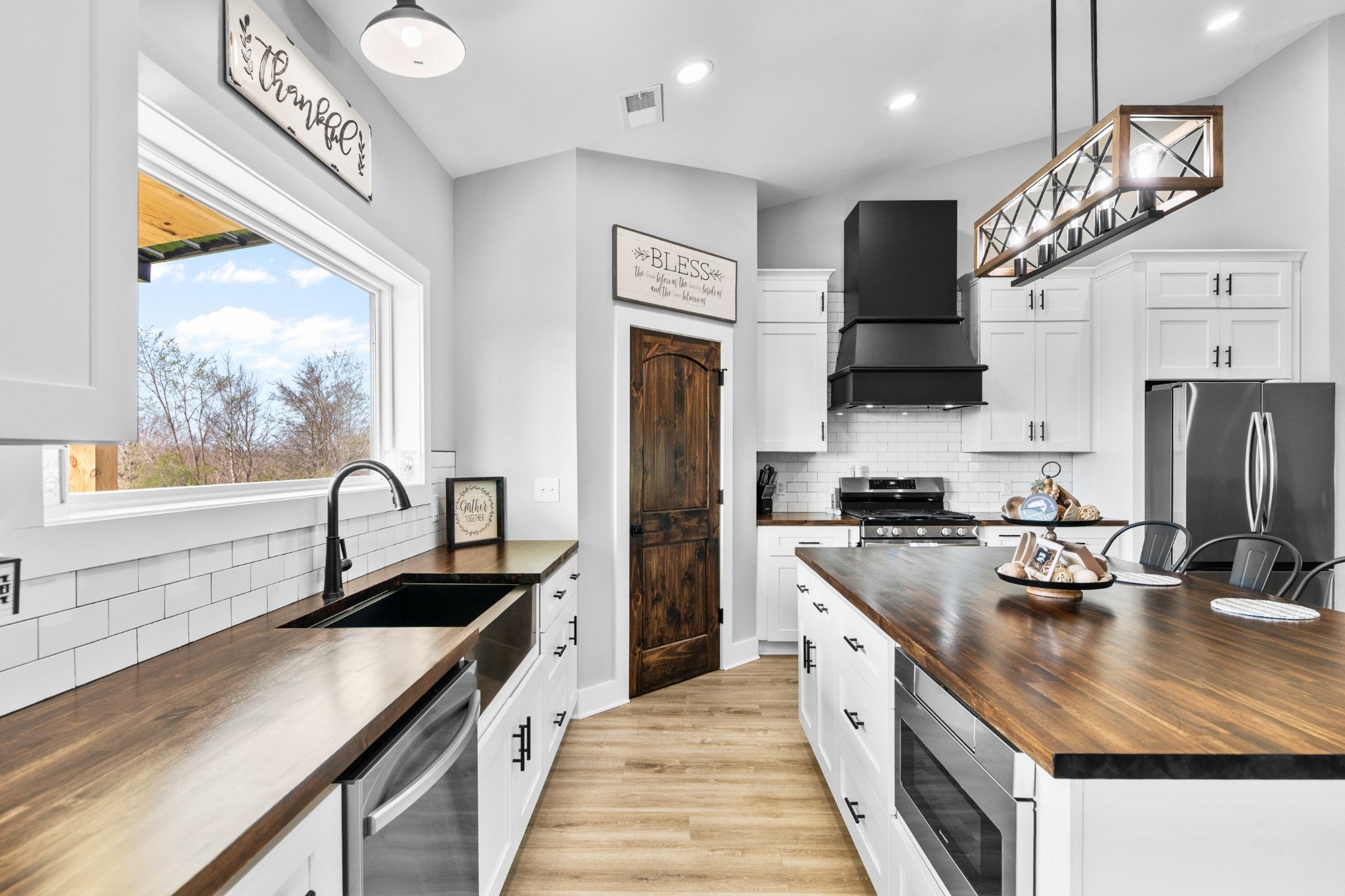Scenic & Secluded Sanctuary overlooking Centerville! Welcome Home to this beautifully built 2,000 sq ft Farmhouse style 3bdrm/2bath BARNDO on 45.23 Acres w/Detached Garage. This home blends rustic charm with laid-back country living. Perched high above the scenic Duck River and overlooking the timeless Town of Centerville, TN. This tract offers Plenty of Open Field for Farming or Furbabies, yet surrounded by Heavily Wooded Rolling Terrain. Imagine winding past the pond, and down the driveway to your Perfect Getaway called “HOME”! Step into the open great room with vaulted ceilings and a stunning shiplap and stone fireplace wrapped in a heavy beam mantle. The kitchen is straight out of a farmhouse dream with shaker-style white cabinetry, butcher block countertops, subway tile backsplash, Stainless Steel Appliances, a bold black built-in range hood, and a shiplap-accented island. A walk-in pantry with a stained pine door adds warmth and character. The spacious primary suite offers a walk-in closet and a beautifully tiled shower with subway tile walls and glass door. Granite countertops, shaker cabinetry, and durable LVP flooring throughout the home keep things both stylish and practical. Outside is where this one really shines…Enjoy a 500 sq ft covered front porch with tongue-and-groove ceiling, gorgeous stone accents, a spacious covered back porch, and a wide-open concrete patio breezeway connecting to the 1,200 sq ft detached 2-car garage. This property allows you room to spread out and enjoy true country living.