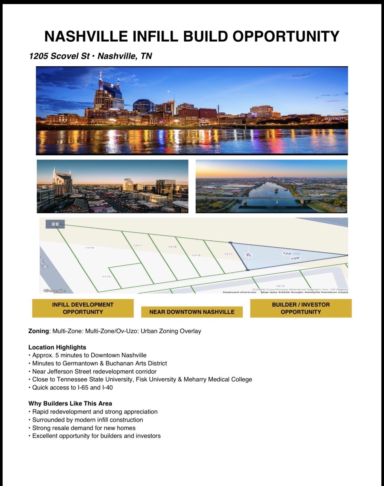 Prime North Nashville infill development opportunity just minutes from Downtown and the Jefferson Street corridor. Zoned Multi-Zone / Urban Zoning Overlay and surrounded by new construction in a rapidly redeveloping area. Convenient to Germantown, Buchanan Arts District, TSU, Fisk University, Meharry Medical College, and interstates I-65 and I-40. Additional nearby lot available – see MLS for neighboring parcel.