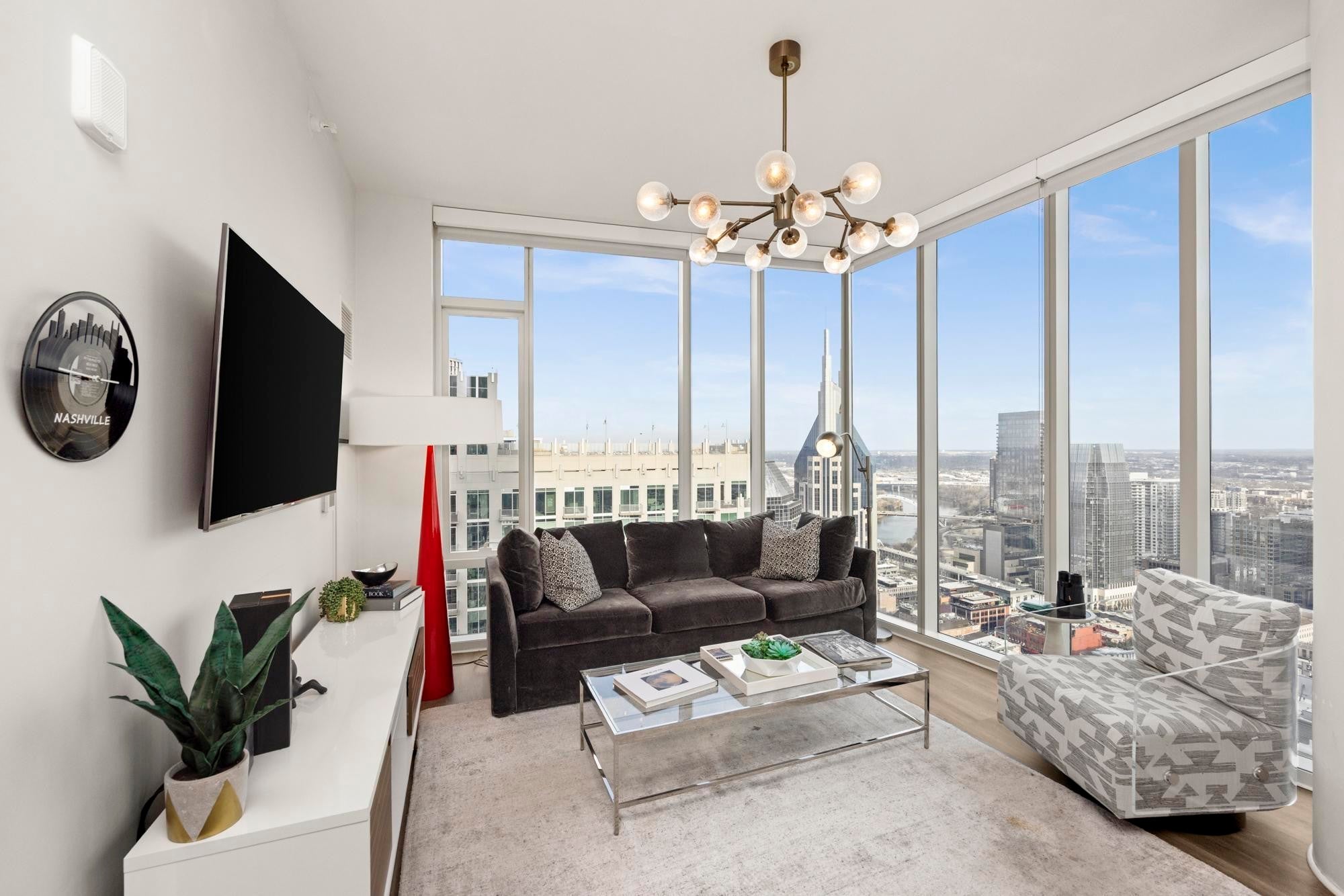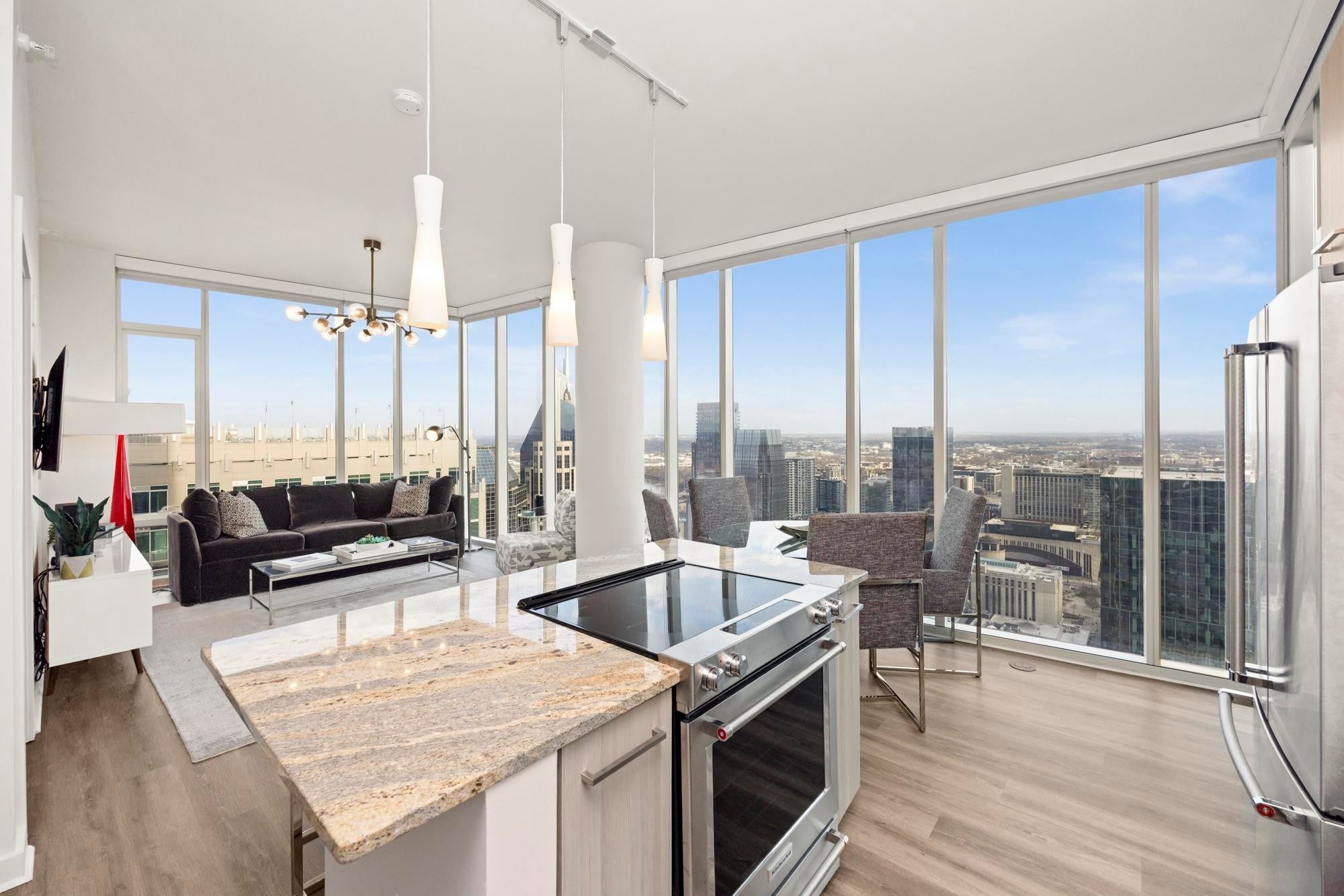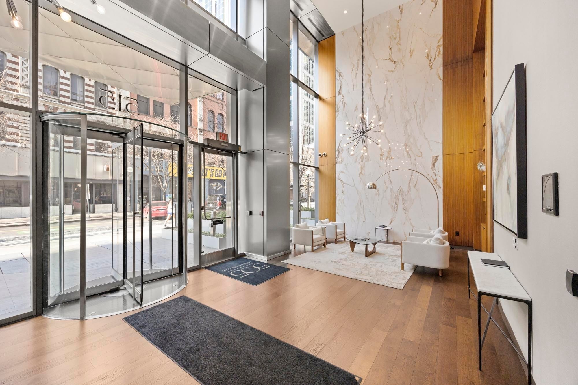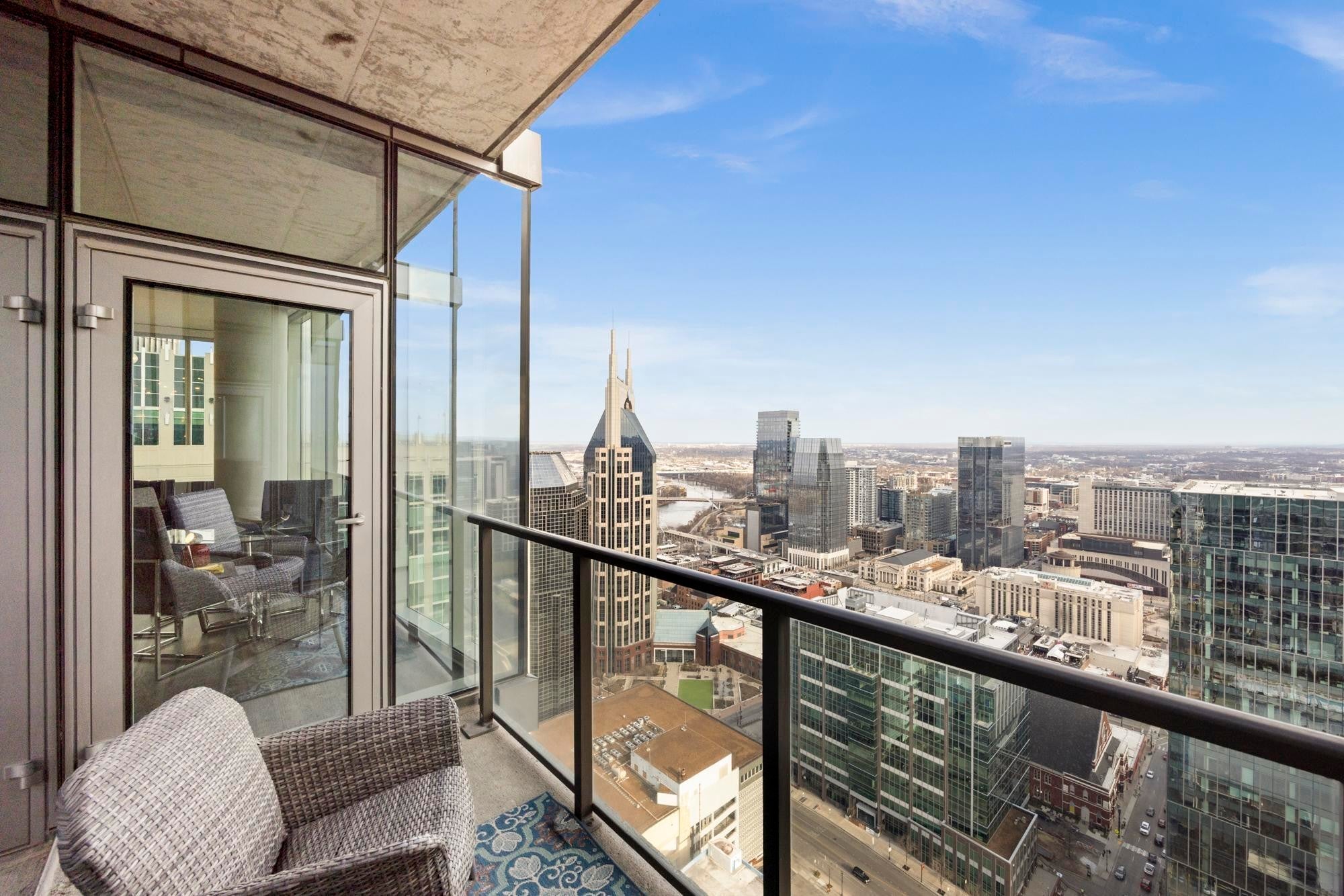 CORNER UNIT WITH BALCONY!! Rare offering on the coveted Southeast corner of the 505 Tower with floor to ceiling windows providing spectacular views of downtown Nashville and a front row seat to the city's many firework displays. This condo will convey furnished with Mitchell Gold designs. In addition, the condo has brand new flooring in the entry, kitchen, and living area. Both bedrooms are ensuite with large walk in closets. Private parking area is located on B1, with easy access to the elevator. The 505 Tower is perfectly situated with direct access to all things Nashville--Ryman Auditorium, Bridgestone Arena, Nissan Stadium, 5th and Broad/Assembly Hall, Broadway, the newly renovated Arcade, and Nashville Yards. Exterior amenities include a resort style pool with cabanas, tennis court, pickleball court, and dog park. Interior amenities include a private owners’ lounge, state-of-the-art fitness center, private training center, massage room, private Italian-inspired wine/dining room, 24 hour coffee bar, and a catering kitchen/dining room.