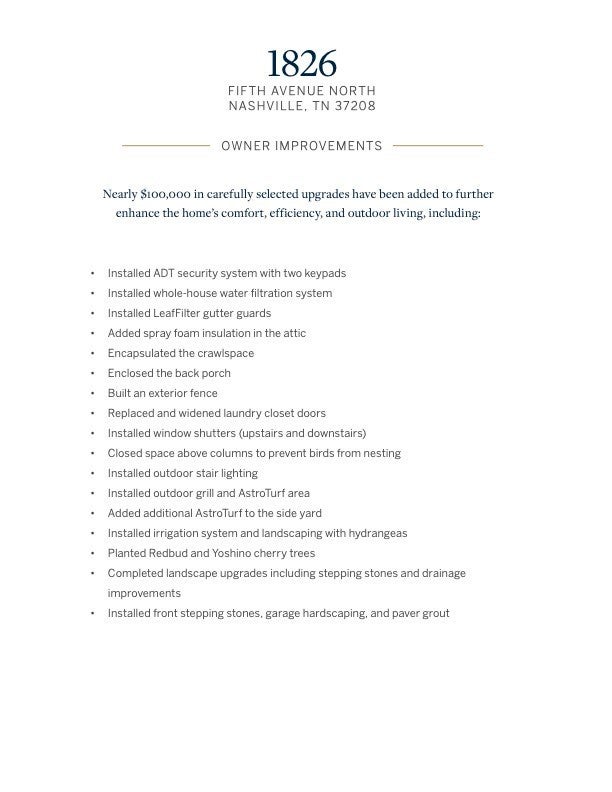 Welcome to 1826 5th Ave N, where historic Salemtown charm meets modern living. A turn-of-the-century brick front porch offers timeless curb appeal, while the screened-in back porch with heaters, wet bar, and beverage center provides year-round entertaining. The home seamlessly blends indoor and outdoor living with a heated and cooled garage offering 350 additional square feet, featuring glass doors that open to a private terrace. The chef’s kitchen showcases a dramatic textured tile backsplash, expansive quartz island, and custom cabinetry extending through the pantry and mudroom with integrated wine storage. A main-level bedroom suite offers flexibility for guests or a private office. Upstairs, the primary suite features a vaulted ceiling, three closets, private terrace, and spa-like bath with designer tile, Brizo fixtures, and rain shower. An additional second-level suite enjoys beautiful city views. Located in the heart of walkable Salemtown and Germantown, just blocks from neighborhood favorites including Cultivar Bar and the new grocer Basket Case. Additional upgrades include professionally designed landscaping, irrigation, hydrangeas, redbud and Yoshino cherry trees, custom fencing, outdoor lighting, drainage improvements, whole-house water filtration, spray foam attic insulation, encapsulated crawlspace, LeafFilter gutter guards, and ADT security system.