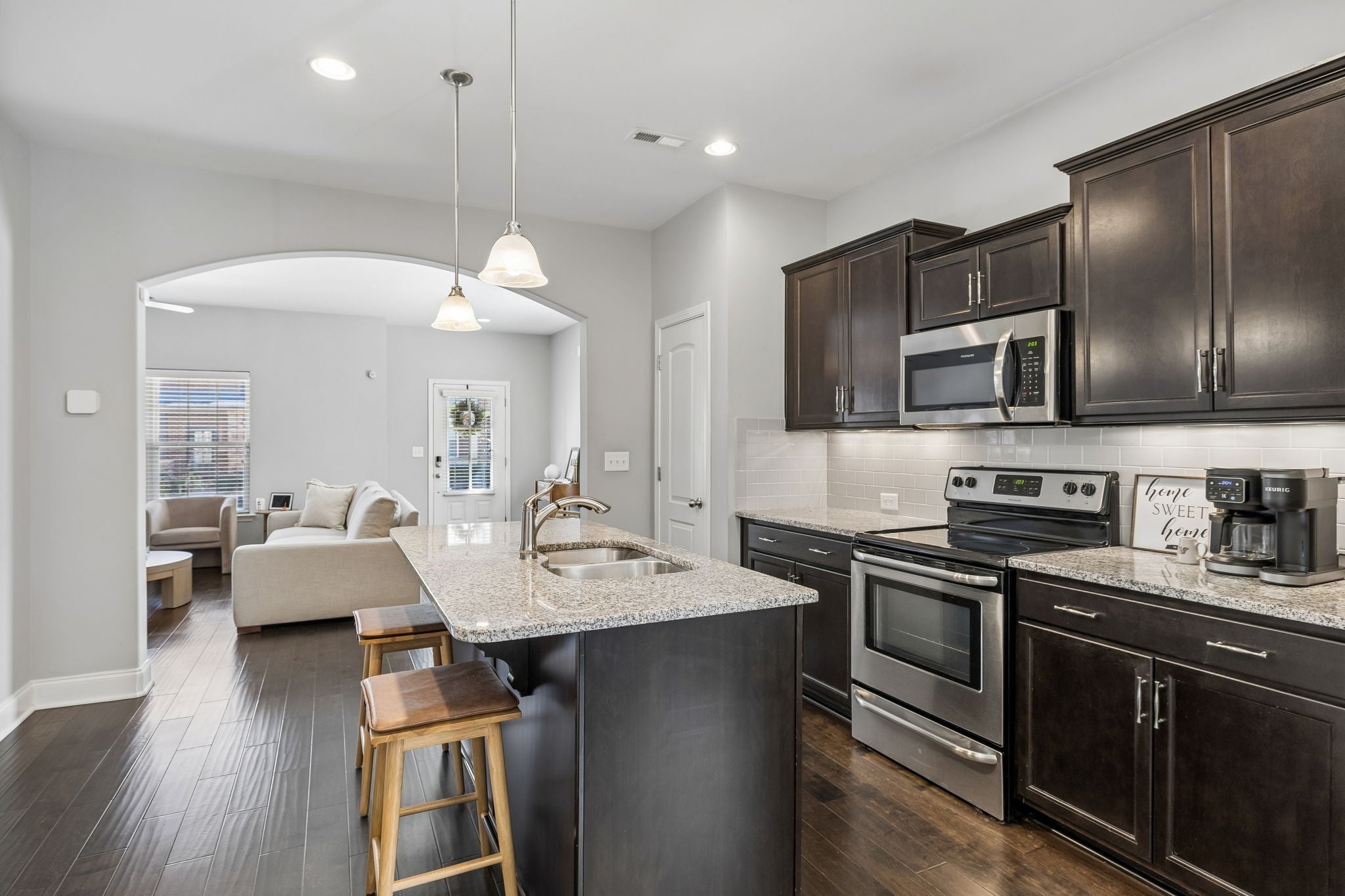Move-in ready end-unit townhome with a brand-new roof, extra privacy, and just minutes from charming Downtown Franklin. Located in the highly desirable Shadow Green community, this end-unit townhome features a welcoming front porch, additional windows that fill the home with natural light, and a garage with rear parking—all set within a charming, sidewalk-lined neighborhood known for its friendly, welcoming atmosphere. Inside you'll find hardwood floors on the main level and stairs, upgraded soft-close cabinetry with under-cabinet lighting, granite bathroom countertops, matching laundry room cabinets, and custom window treatments. The spacious primary suite features a tray ceiling and a beautifully tiled shower with bench and frameless glass door. Enjoy resort-style amenities including a clubhouse, pool, walking paths, outdoor fireplace, grilling stations, and putting green. HOA includes high-speed internet and DIRECTV streaming. Conveniently located near grocery stores, coffee shops, and great restaurants, and just a short drive to the charm, shopping, and dining of historic Downtown Franklin. This is your opportunity to enjoy the lifestyle, location, and amenities that make Shadow Green one of Franklin’s most desirable communities.