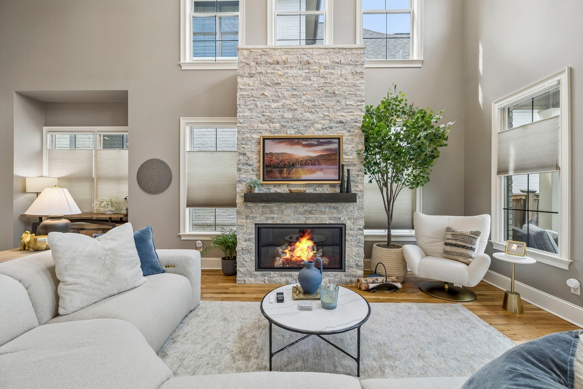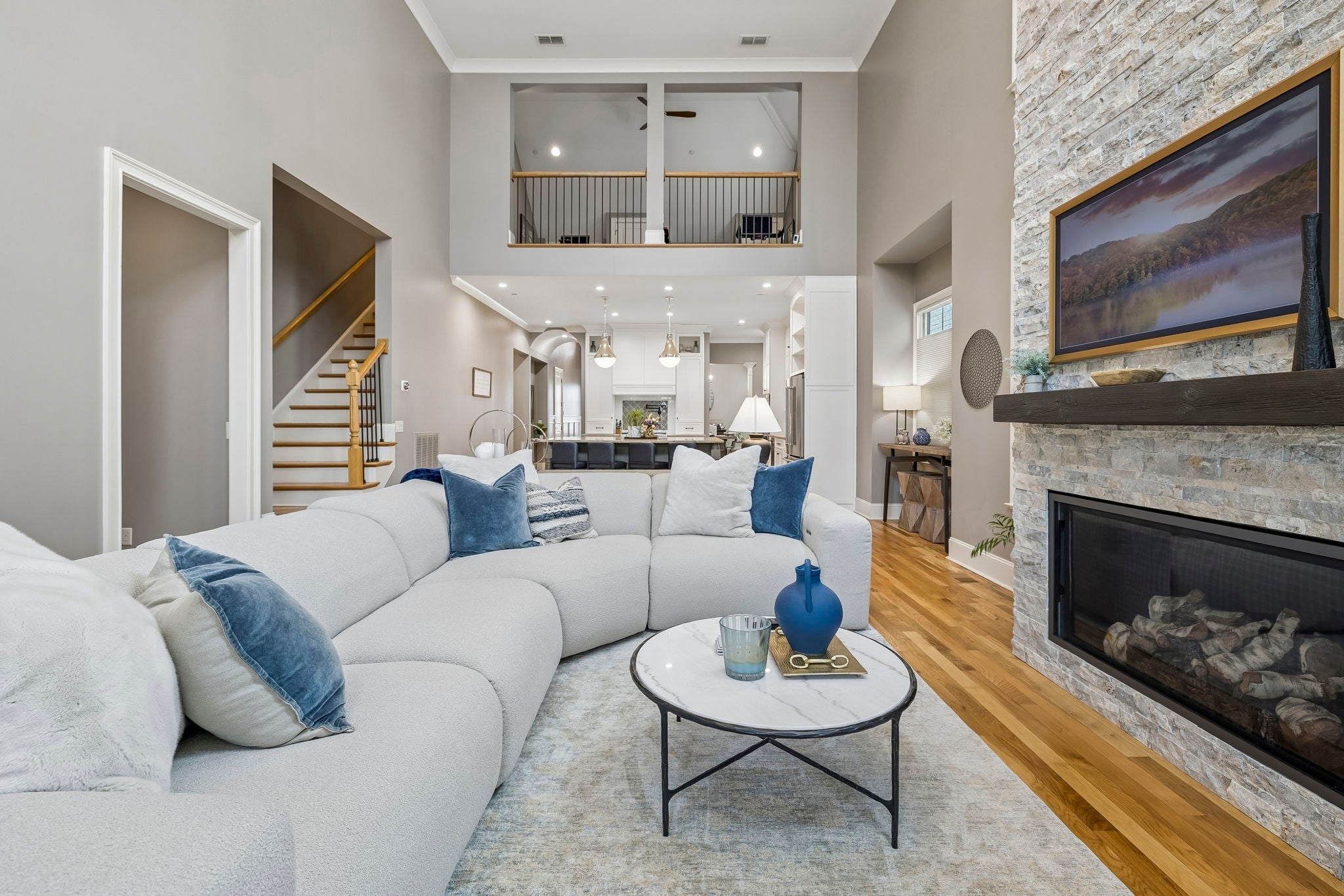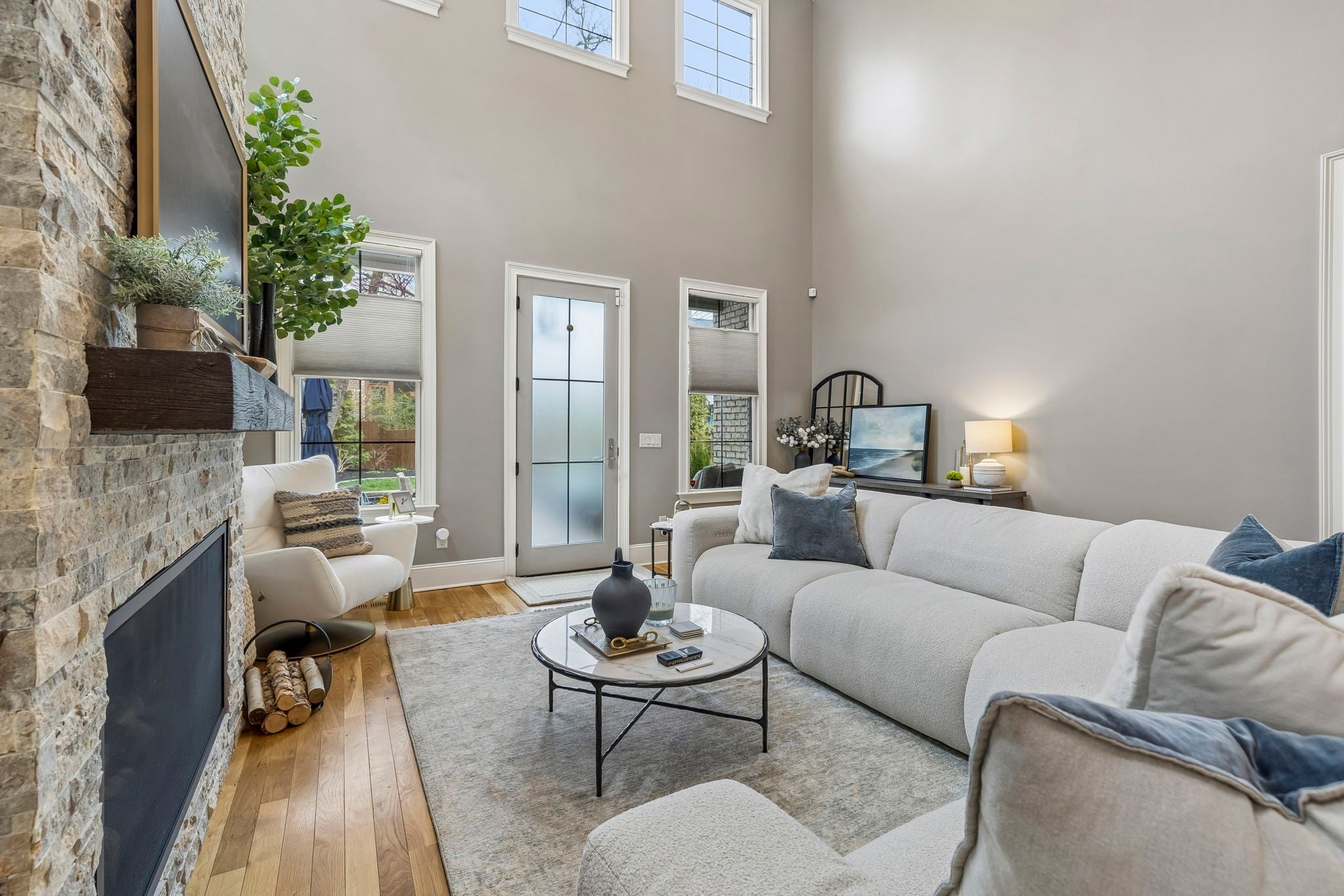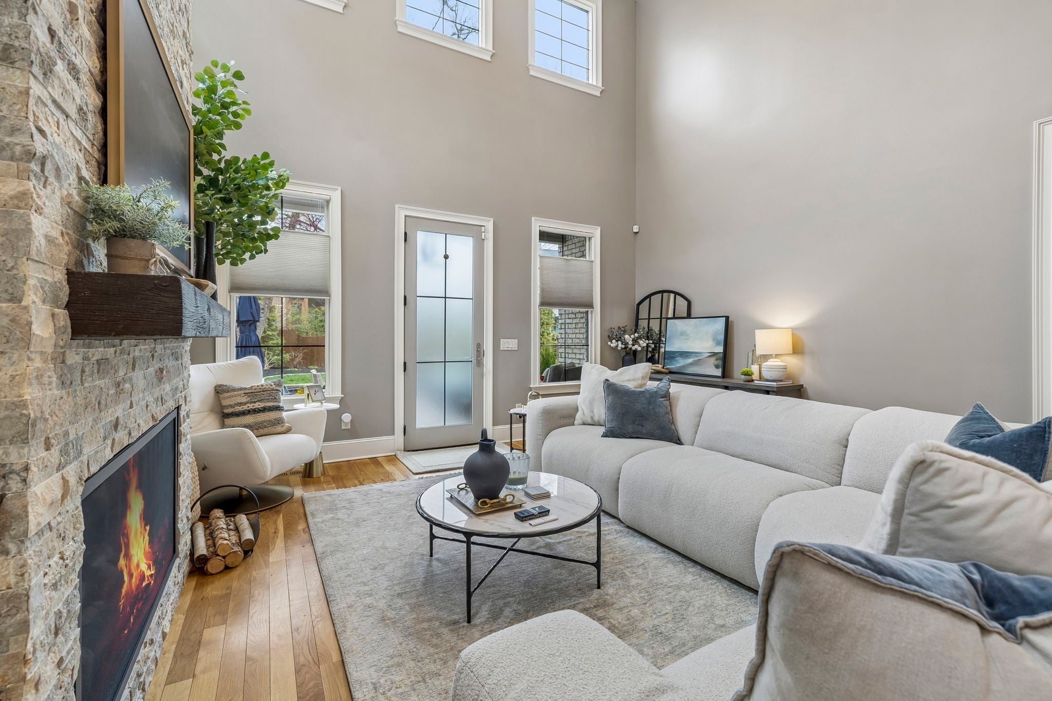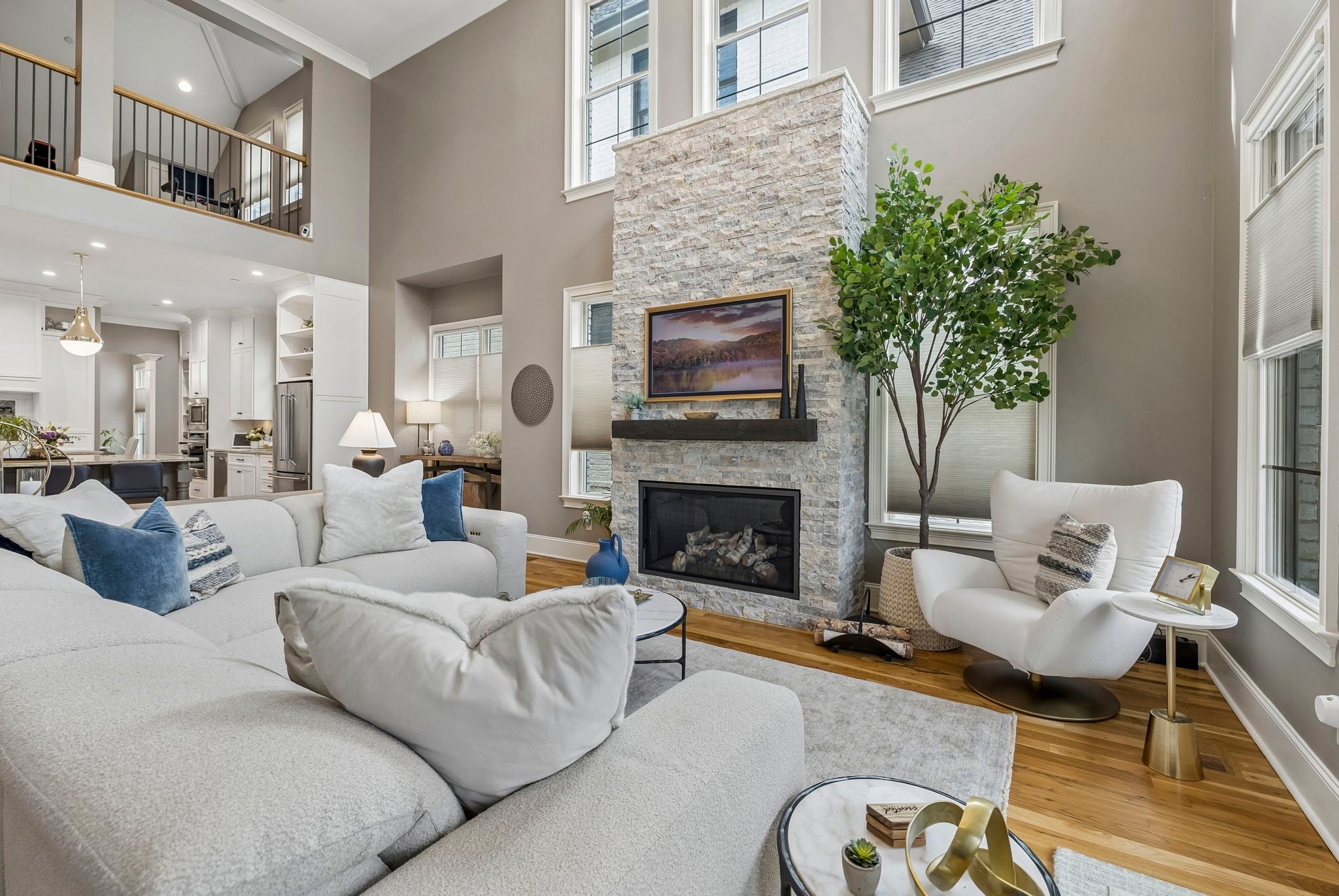 Beautifully crafted with recent upgrades custom brick & stone home with exceptional curb appeal and a professionally landscaped yard. This thoughtfully designed home features tall ceilings, extensive trim work, neutral designer finishes, and an incredible open floor plan ideal for both everyday living and entertaining. The main level offers a gorgeous front office or flexible living space, a formal dining room, and a butler’s pantry leading to a spacious walk-in pantry. The chef’s kitchen is the heart of the home with a massive kitchen island, and abundant workspace, all flowing seamlessly into the impressive two-story great room featuring a stunning new fireplace with gas logs. The secluded primary suite with updated bath and walk-in closet is conveniently located on the main level along with two additional bedrooms. Upstairs offers a versatile flex space perfect for a rec room, exercise room, or media area, along with an additional bedroom, large walk-in closet and full bath. Step outside to a manicured backyard with extended stone patio, covered porch, smokeless "Breeo" insert in stone firepit, and fenced backyard. Seller recently upgraded all the lighting, hardware, painted, redid the primary bathroom, and added Vivint Security system to keep an eye on the pups. With 4 bedrooms, 3.5 baths, and flexible living spaces throughout, this custom home offers both comfort and sophistication in a beautifully maintained setting.