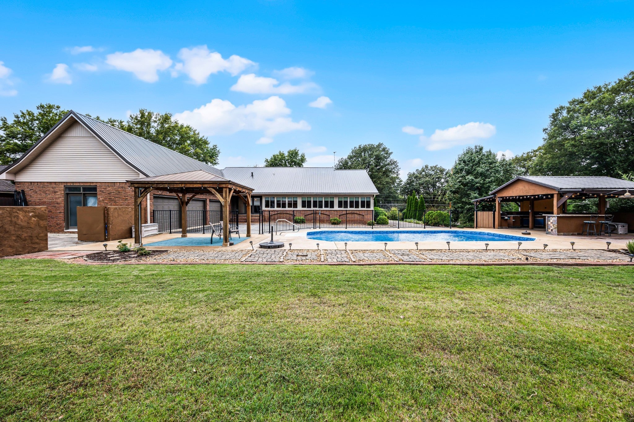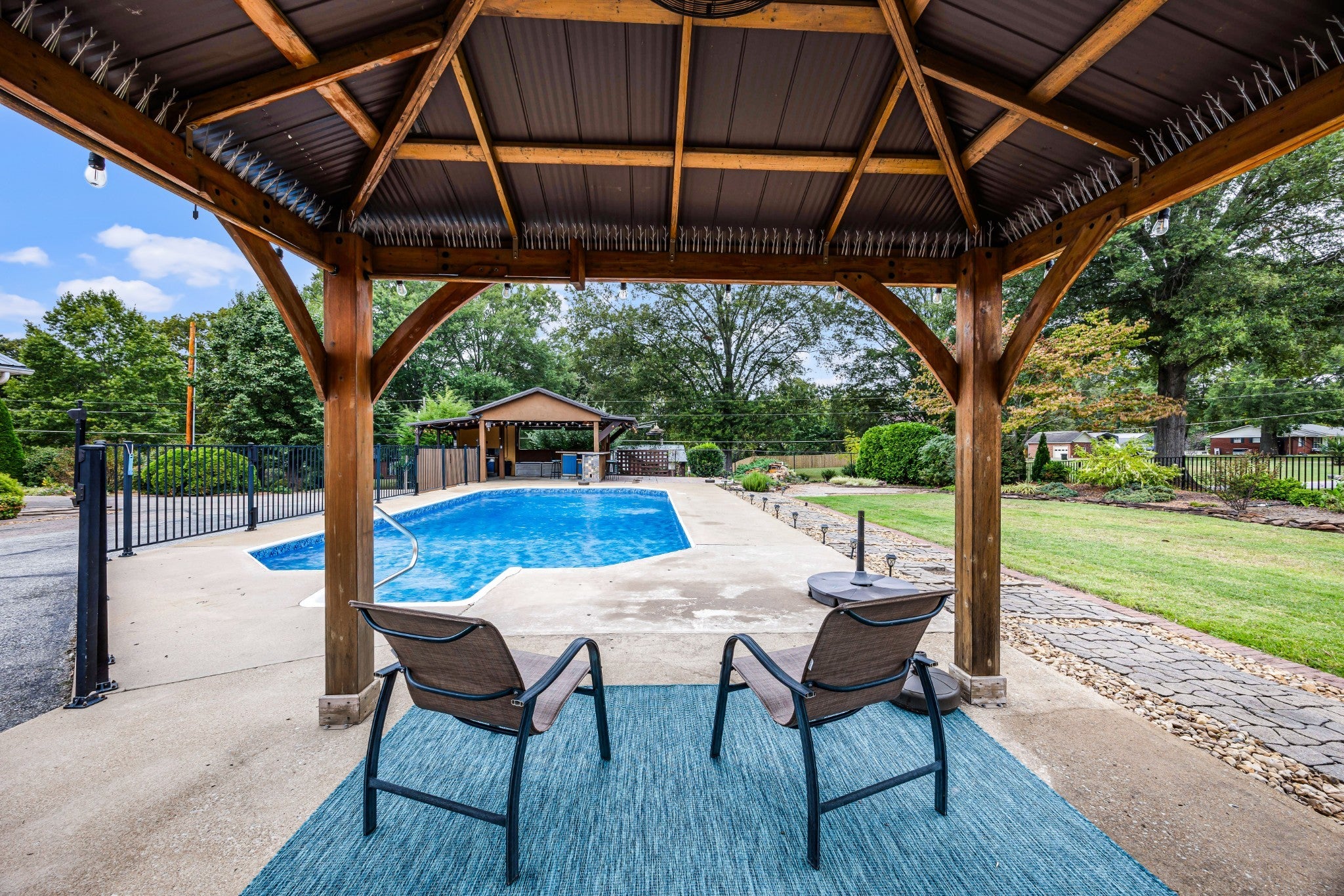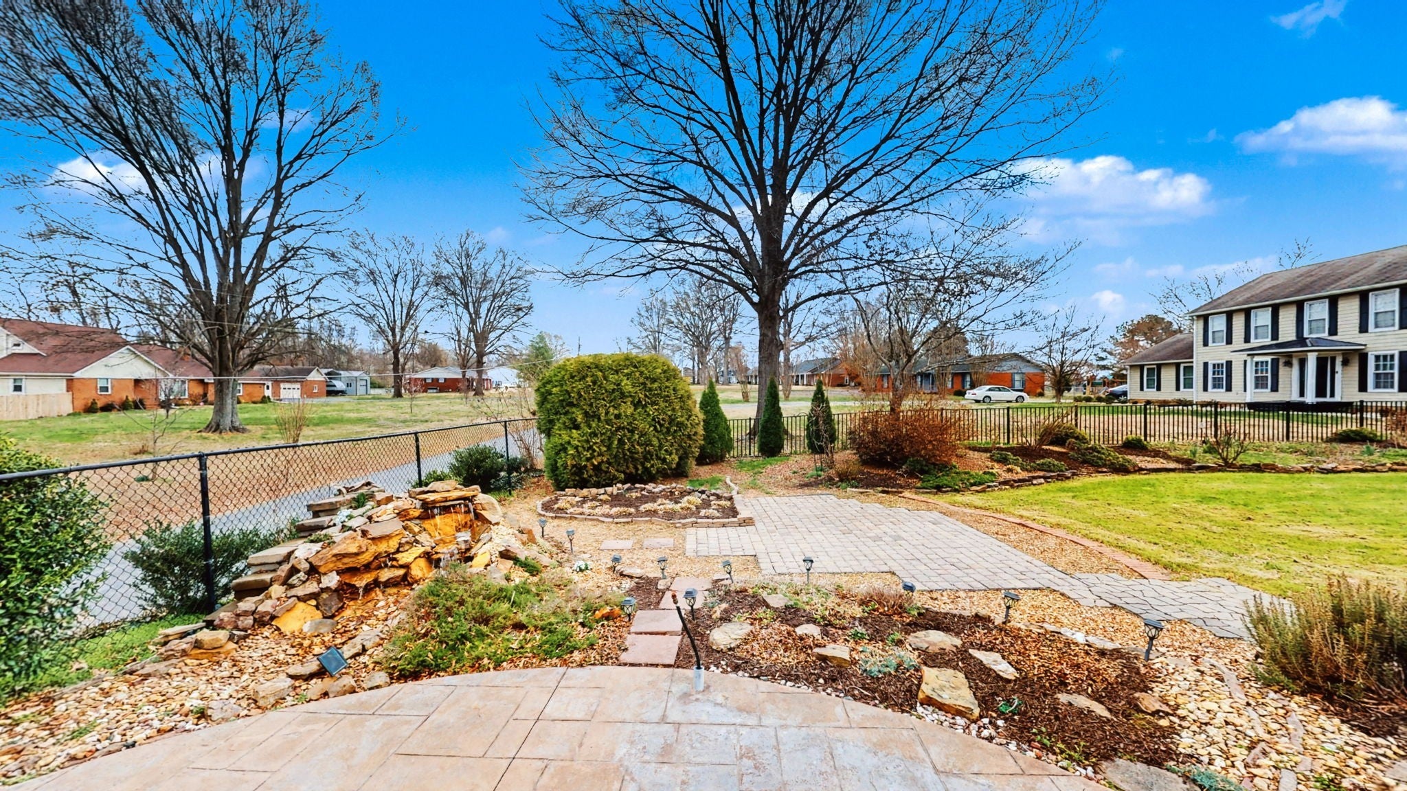 Welcome to 15 Chesapeake Drive! A meticulously maintained one-story brick home offering exceptional indoor & outdoor living. This home features a beautifully designed open floor plan, with oak hardwood floors flowing throughout. Thoughtful upgrades like crown molding, built-ins, Bali shades, ceiling fans, and a vent-free fireplace (installed 2022) gives this home warmth & character! The kitchen offers granite countertops, tile backsplash, & custom cabinetry. The spacious primary suite features a tray ceiling & double doors leading to the sunroom. The en-suite bath includes a large walk-in shower, dual vanities & a walk-in closet. Two additional bedrooms and another full bath featuring a tiled tub/shower combo with double vanity can be found on the other side of the home (split layout!). There is also a convenient half bath located near the rear entry. The enclosed sunroom (windows added 2005) includes solar and blackout shades, insulation, flooring, cabinetry, and its own gas fireplace (2015 installation upgrades). From there, step out into your backyard oasis, complete with an outdoor kitchen w/ natural gas supply and new fixtures (2025), a stunning waterfall feature (2020) stamped concrete (2021) and an 18x36 in-ground pool (w/ copper/silver ozone purification), new electrodes (2024), new solar cover (2024), and new liner (2025). Major system updates include: • Metal roof (2016) • Dual electric water heaters (2018) • Carrier 4-ton packaged HVAC unit (2020) • Crawlspace fully encapsulated in 2024 with dehumidifier, sump pump, French drain system, and transferable warranty. • Wood privacy fence (2024) • Three new windows (2026) Private well and septic system with recent well system improvements, plus annual termite contract in place! This home offers space, storage, upgrades, and resort-style outdoor living, all in one complete package. Come see it for yourself while you still can!