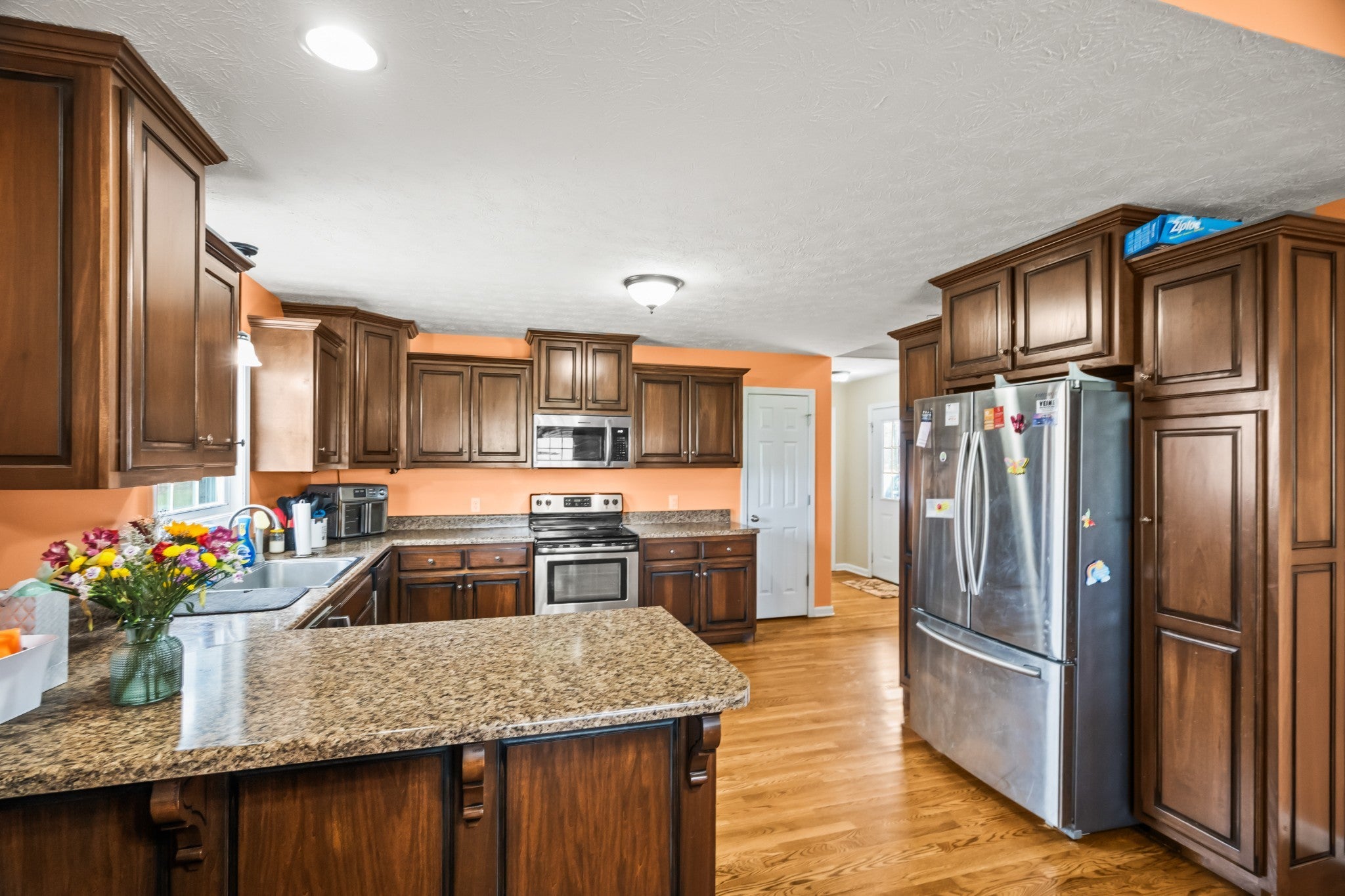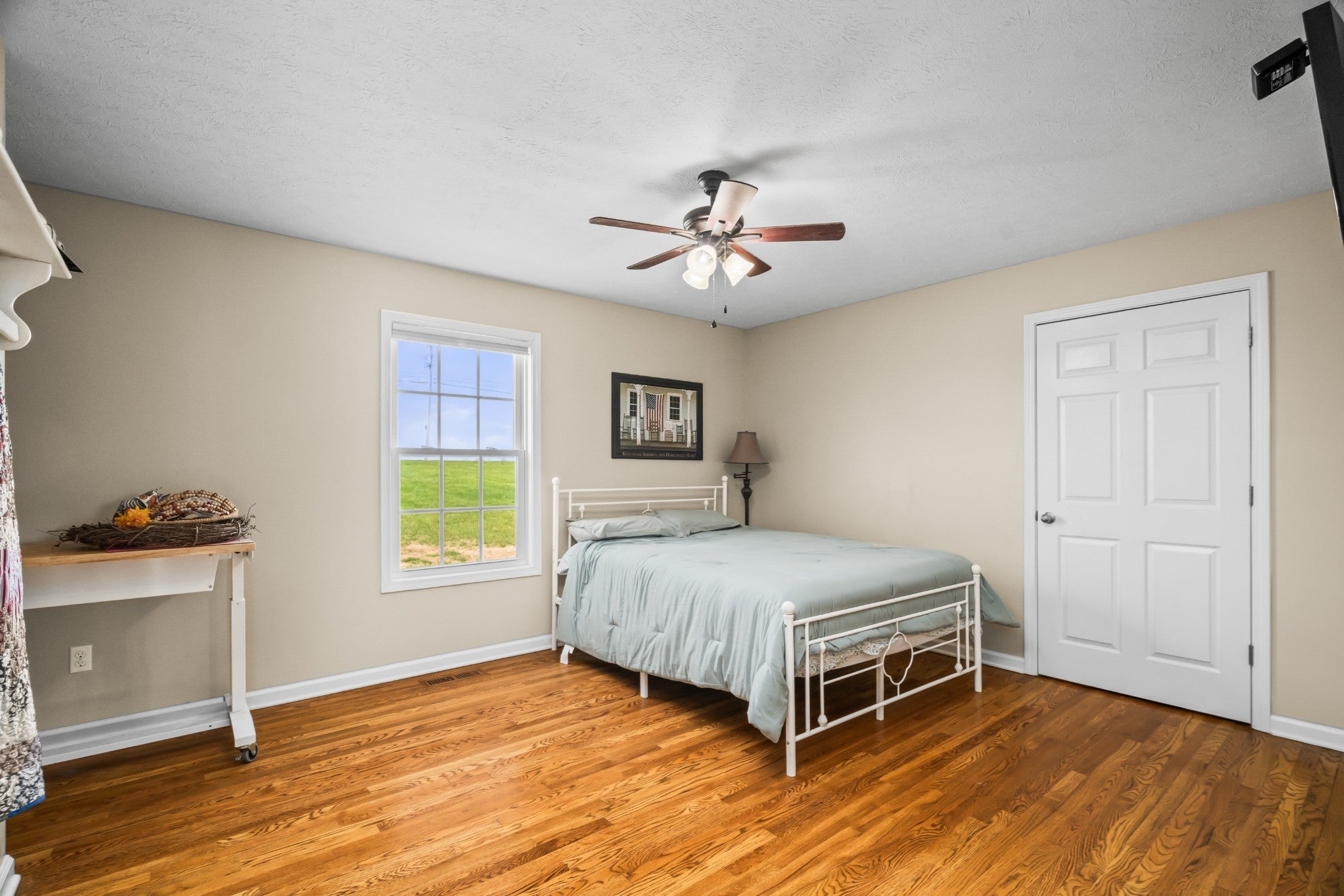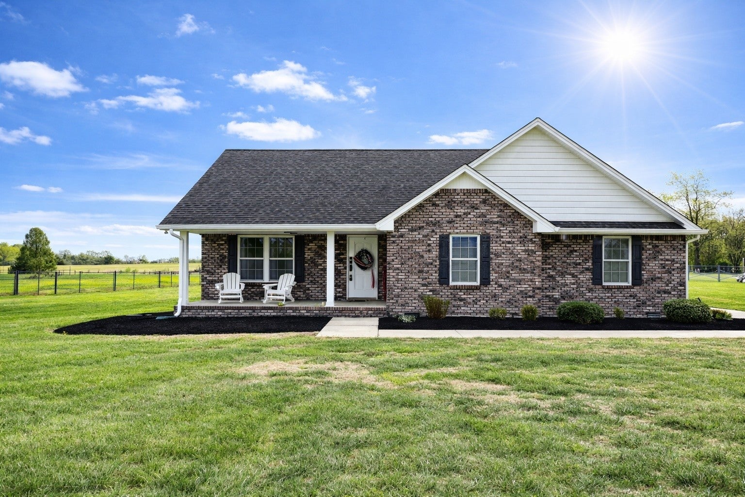 This spacious "ONE LEVEL, BRICK" home sits on 1.12 acres and is located just 10 minutes from I-65, offering privacy while remaining close to everyday amenities. Freshly landscaped and who house pressure washed, this beauty shines like a new penny. Inside, you'll find large rooms throughout and a welcoming great room with a vaulted ceiling, creating an open and inviting living space. The well-appointed kitchen features a bar for casual dining, custom-built cabinetry, and a pantry with pull-out drawers for exceptional storage and organization. Beautiful sanded and finished on-site hardwood floors run throughout the home, complemented by tile baths and no carpet for easy maintenance. The large primary suite offers a relaxing retreat with a separate shower, soaking tub, and double vanities. Wide doorframes and an open layout provide excellent accessibility and offer potential for handicap accessibility modifications if desired. Step outside to enjoy the covered back porch overlooking a peaceful pond and surrounding farmland, the perfect place to relax and take in the views. Additional features include a concrete driveway and an oversized two-car garage. This beautiful home combines country charm, spacious living, and convenient location, a must see.