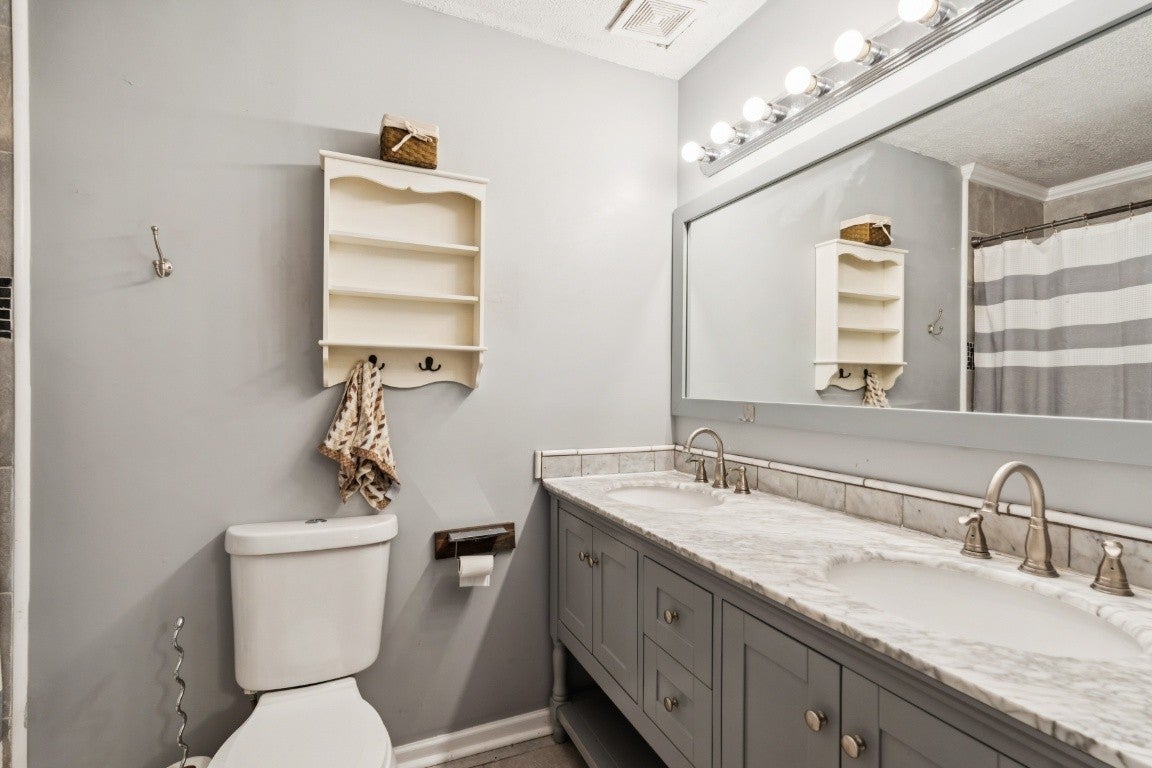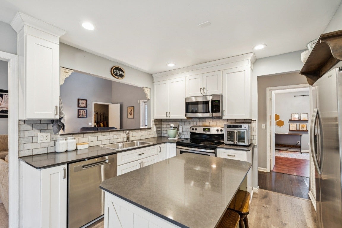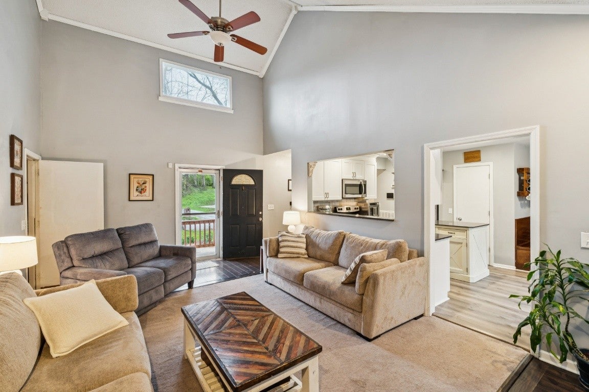 Unique soft contemporary nestled on a lovely treed lot in south Nashville on 10 minutes to downtown! This home offers easy one level living with three bedrooms down and bonus room up, currently used as bedroom #4. Other unique features include volume ceilings, kitchen with quartz counter tops and stainless appliances, spacious great room, separate laundry room with storage. This home is special and has a wonderful setting for enjoying nature, or outdoor play. Come see it!