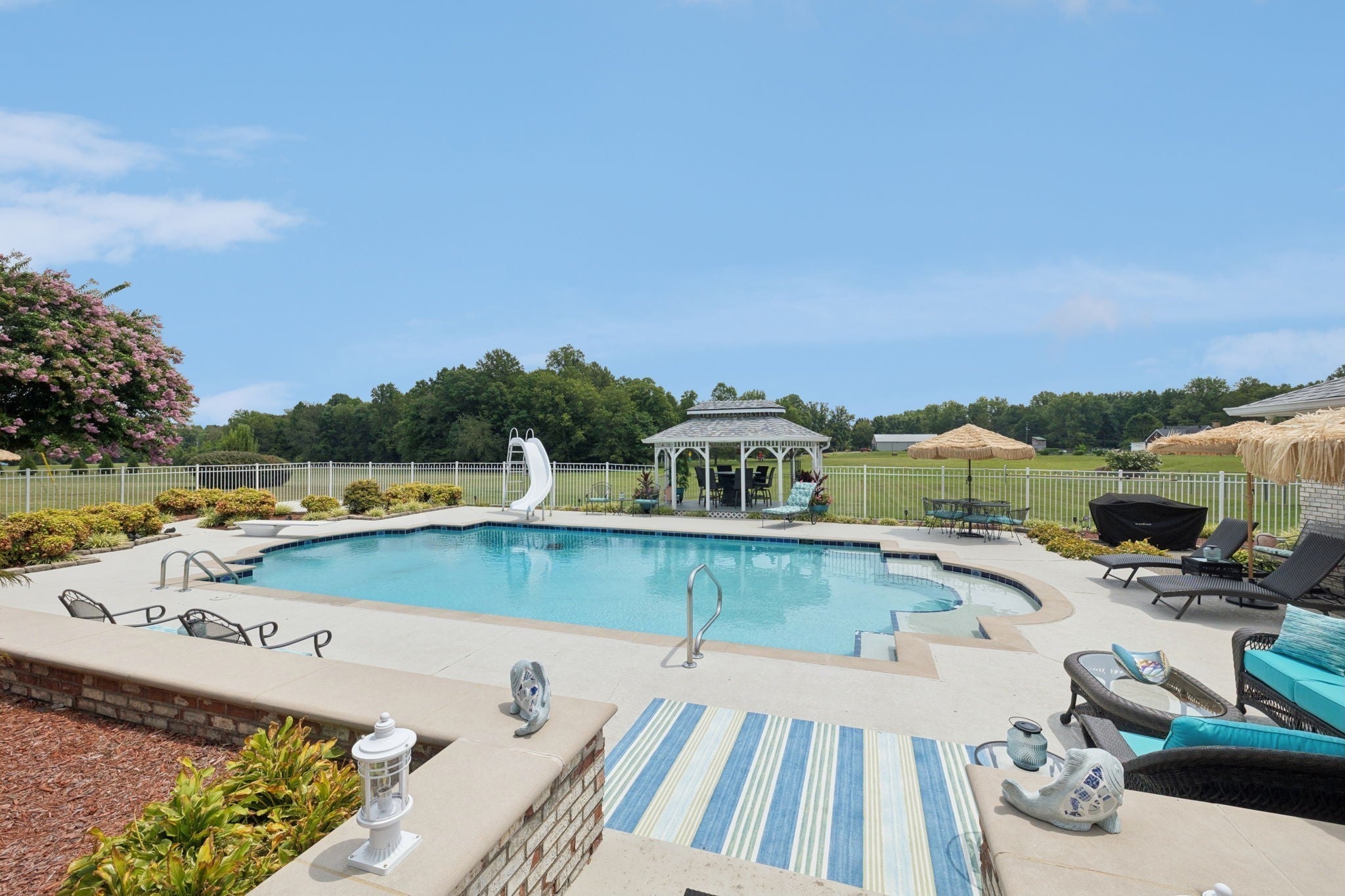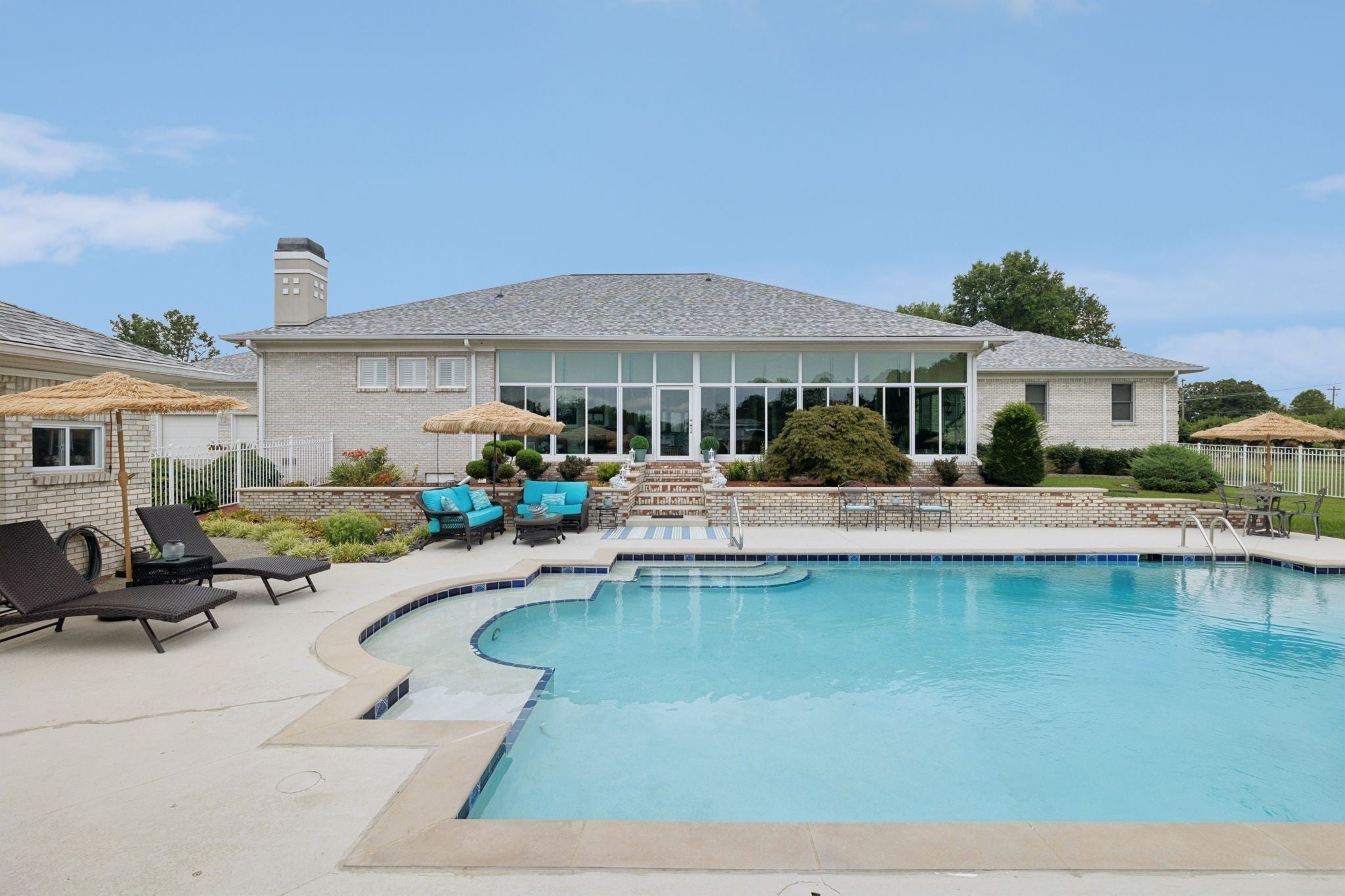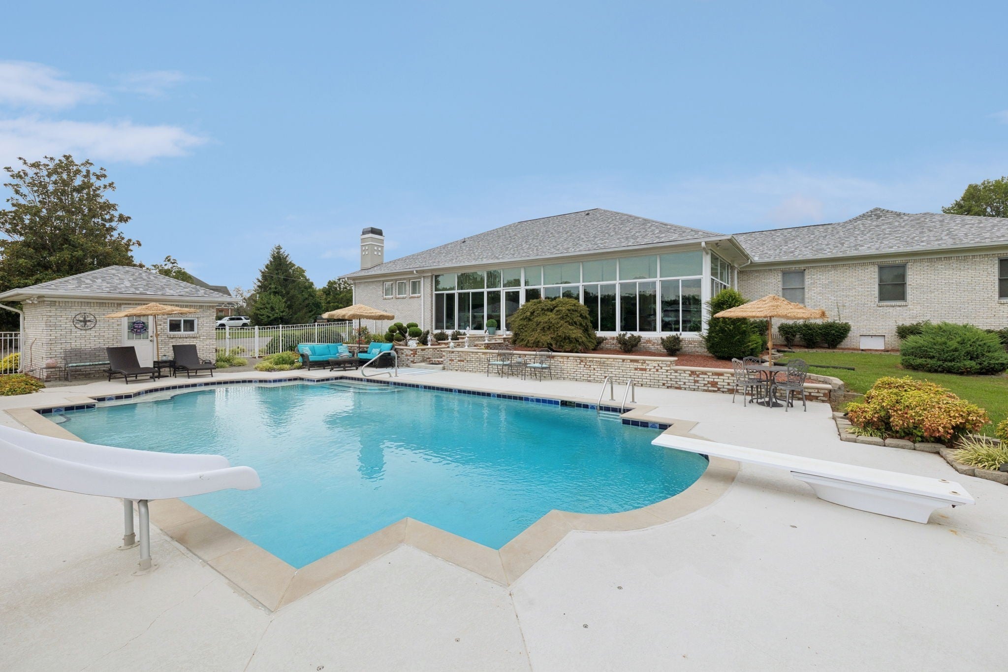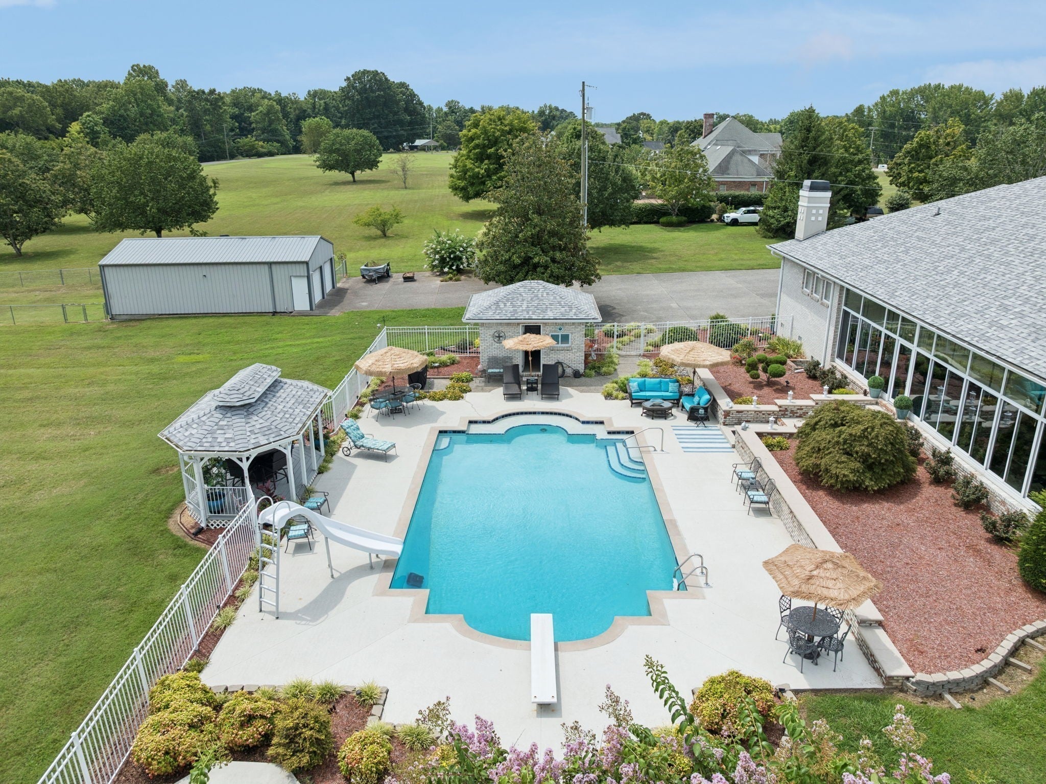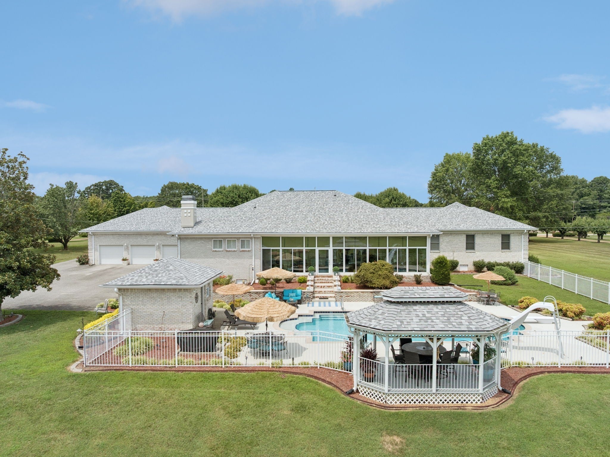 Luxury Contemporary Estate – One Level Living with Resort-Style Amenities Step into elegance with this sprawling 5,797 sq. ft. contemporary one-story home, perfectly designed for both comfort and entertaining. Situated on almost 3 acres just 20 minutes from Downtown Nashville, this estate offers the best of privacy, space, and convenience. The primary suite is truly a retreat at 36 x 22 ft., featuring abundant space for lounging and relaxation. The home includes 4 spacious bedrooms, 3 full baths, and a huge office, ideal for working from home. Two fireplaces create warmth and charm throughout the open living areas. The chef’s kitchen with a large eating area flows seamlessly into the formal dining room, making it the perfect place for gatherings. A stunning 45 x 13 Florida room overlooks the pool and patio area, bringing the outdoors in. Car enthusiasts and hobbyists will love the garage space, offering an oversized 3-car attached garage plus a 2-car detached garage for a total of 5 bays. 25 x 40 detached building provides endless options for storage, workshop, or recreation. The backyard is an entertainer’s paradise with a huge in-ground pool, 1,204 sq. ft. pool house, and expansive patio areas for lounging and entertaining. This rare single-level estate combines contemporary design with resort-style living—just minutes from the heart of Nashville.
