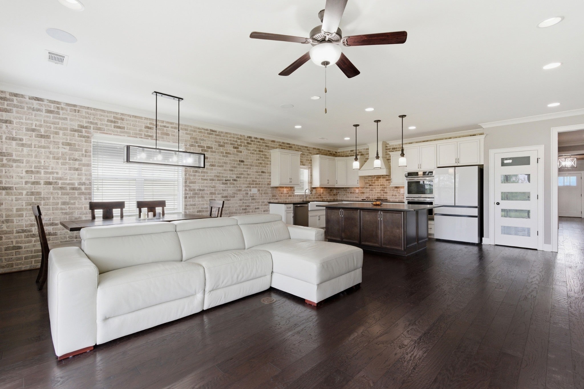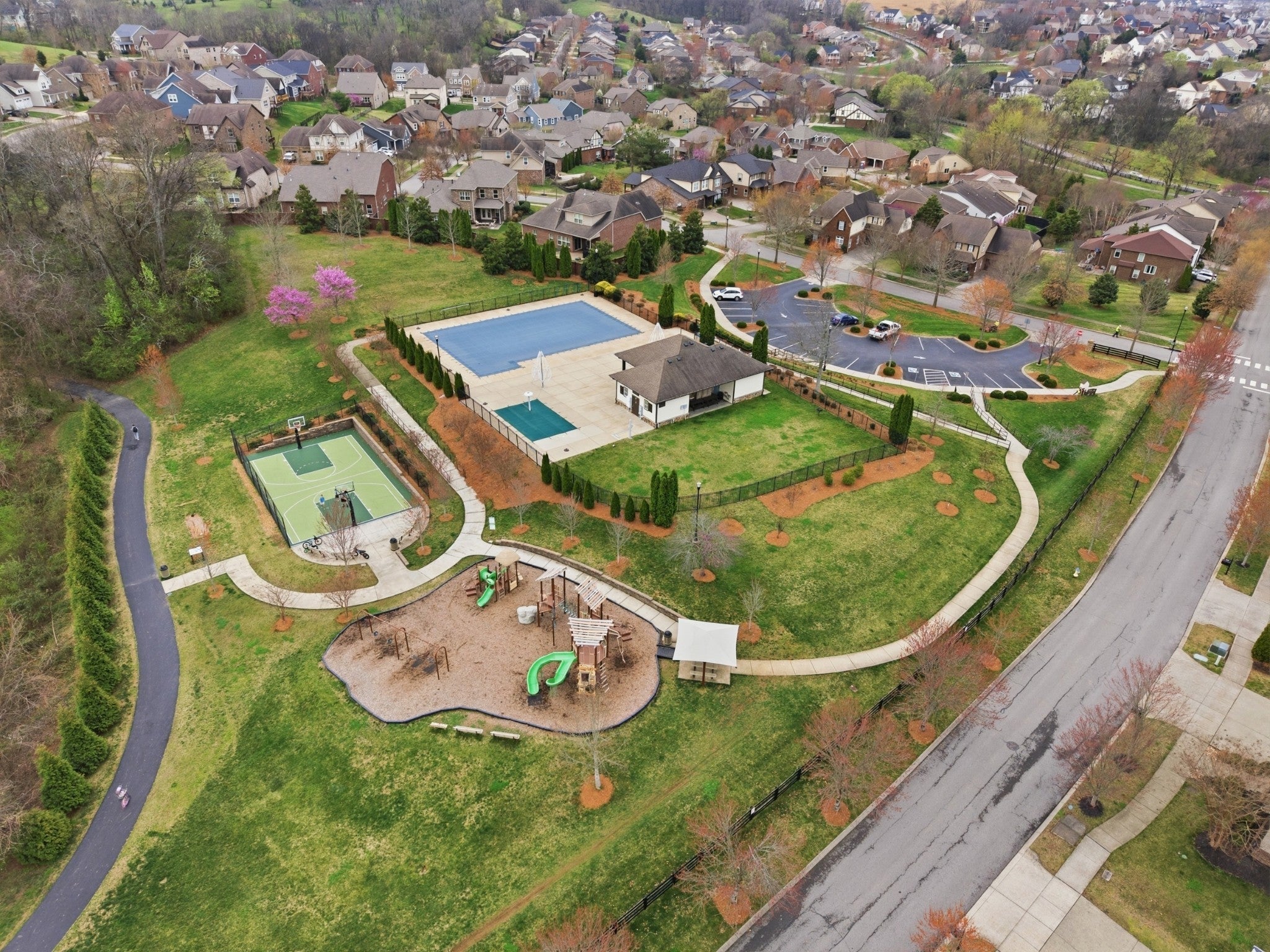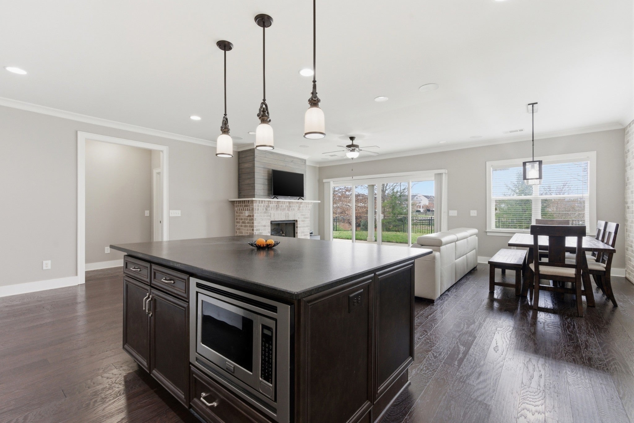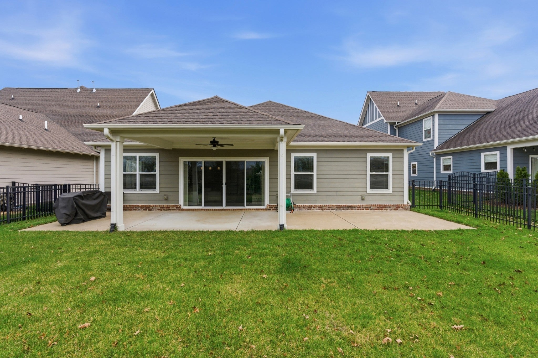 This handsome and not commonly available one level single family home is situated in the highly desirable Ladd Park community with convenient access to I-65 and top rated schools! The home has been meticulously and lovingly maintained by the original owner. The Great room with an impressive brick fireplace opens up to the dining area and kitchen with cool exposed brick accent walls. The expansive kitchen is a chef’s dream with huge island, gas cooktop, upgraded white cabinets, white porcelain farmhouse sink, double ovens and stainless steel appliances. The primary bedroom suite is very spacious and the oversized spa bath with rainforest shower has the wow factor. A versatile Flex room with sliding doors is ideal as a home office or hobby room. The level lot boasts a full irrigation system, wrought iron fenced backyard, and covered patio that looks out upon beautifully landscaped green space. The home also has additional thoughtful upgrades, including a gas tankless water heater, Tesla charger and 5 indoor and 2 outdoor built-in ceiling speakers. The AC unit was just replaced with a brand new unit that carries a transferable warranty. Residents of Ladd Park enjoy exceptional community amenities including two swimming pools, playgrounds, walking trails, and a basketball court. The nearby river is only about five minutes away, offering opportunities for kayaking and fishing. Don’t miss this unique opportunity for easy one level living in historic and charming Franklin, Tennessee!