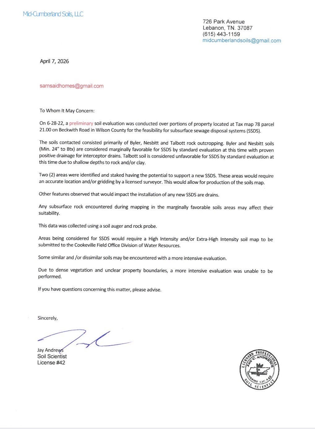 Back on the market due to Finance. Prime location in one of the fastest-growing areas of Wilson County, TN, just minutes from I-40 with easy access to Mt. Juliet, Lebanon, Nashville International Airport, and downtown Nashville. Offers the perfect balance of privacy and convenience near shopping, dining, and major employment centers. Approximately 26.25 acres on Beckwith Rd (Parcel/Tax ID: 078 021.00), zoned R-1 (Residential Household Units), ideal for a private estate, family compound, or future residential development subject to county guidelines. Mostly level and highly usable land with paved road frontage, open space, and a peaceful natural setting. Utilities include electricity, with well and septic typical for the area. Soil test completed in 2022 identified two approved perc sites, adding strong building potential. Wilson County continues to see strong growth, making this a great opportunity for homeowners, builders, or investors. Information believed to be accurate. Buyers and buyer’s agents to verify all pertinent details.