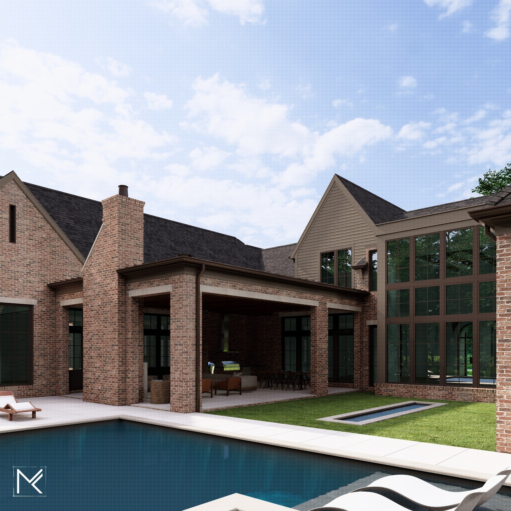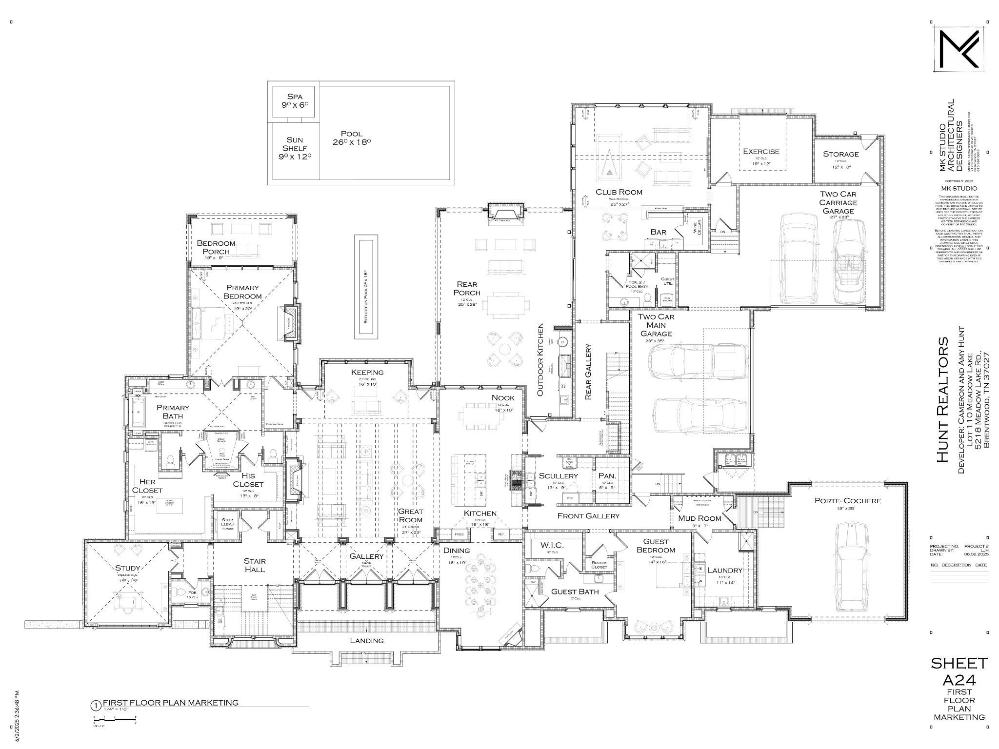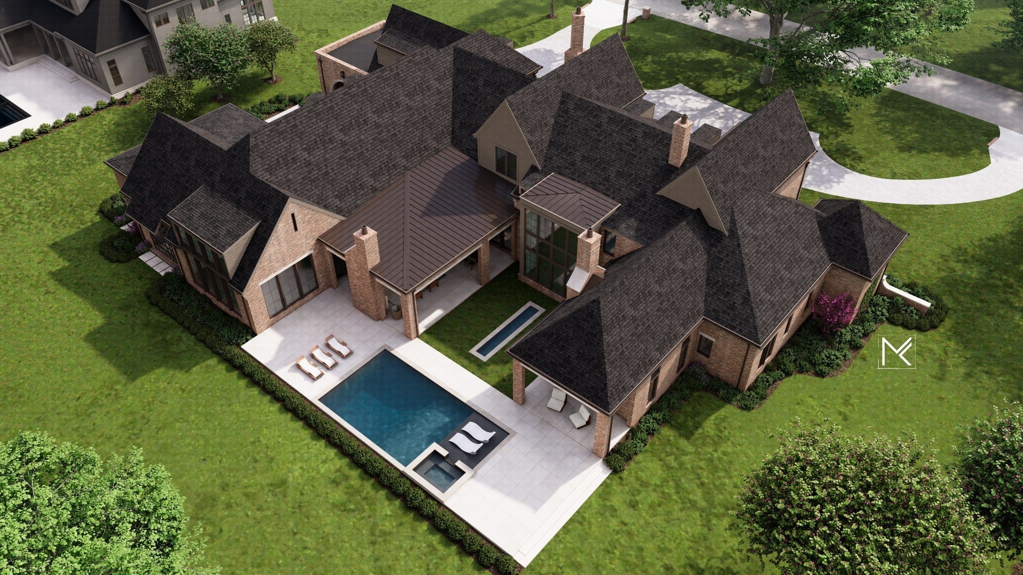 A showcase of stunning architectural design, this home is set to impress with its thoughtfully planned interiors and attention to every detail. Three recessed half-round doors create a grand entry into the expansive gathering areas, including the great room with 21’ ceilings and the keeping room overlooking the outdoor reflection pool. The upscale kitchen is a chef’s dream, complete with a scullery and walk-in pantry, as well as a breakfast nook and formal dining room. Following the rear gallery leads to the club room with vaulted ceilings, expansive windows, and a pub room. Adjacent to this is the separate exercise room and access to the four-car garage. The lavish primary suite features a fireplace wall dressed in chic wallpaper, vaulted ceilings, and a private back porch. The en suite bath includes two water closets, a zero-entry marble steam shower, and generous his-and-her walk-in closets. Also on the main level are a guest bedroom with an en suite bath and a study with vaulted ceilings and a stunning half-round window seen from the front elevation. Outside, a covered porch with a fireplace and full kitchen sets the stage for entertaining beside the premium in-ground pool and spa. On the second level, a beautiful catwalk leads to the remaining bedrooms, which each have an en suite bath and walk-in closet. There is also a bonus room, bunk room, and additional laundry room upstairs. Zoned for Williamson County Schools, this home offers easy access to the amenities of Brentwood, Cool Springs, Franklin, and Nashville.