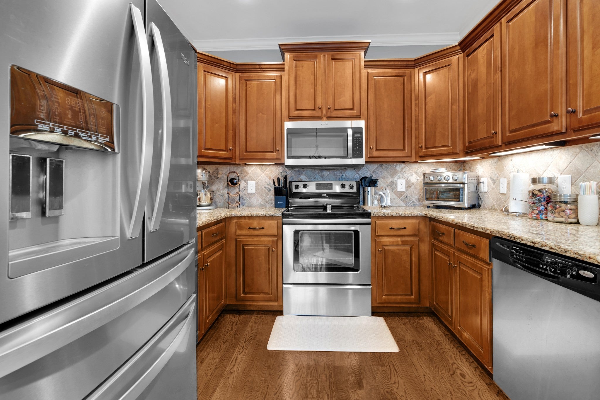 - Oven, Electric Range, Dishwasher, Disposal, Dryer, Microwave, Refrigerator, Stainless Steel Appliance(s), Washer