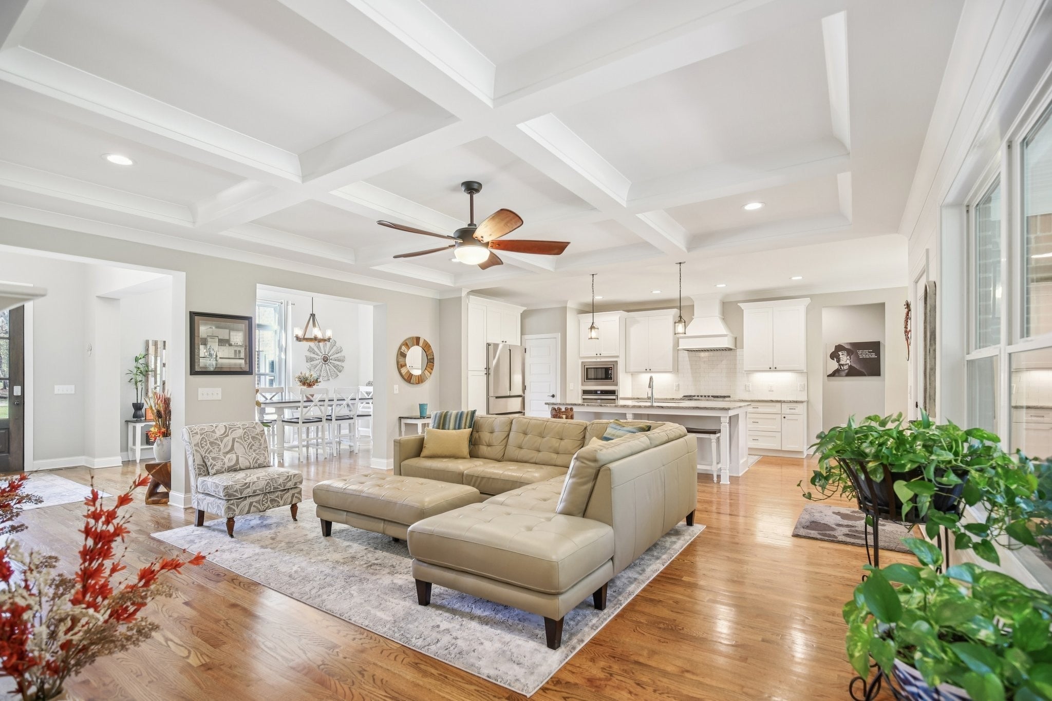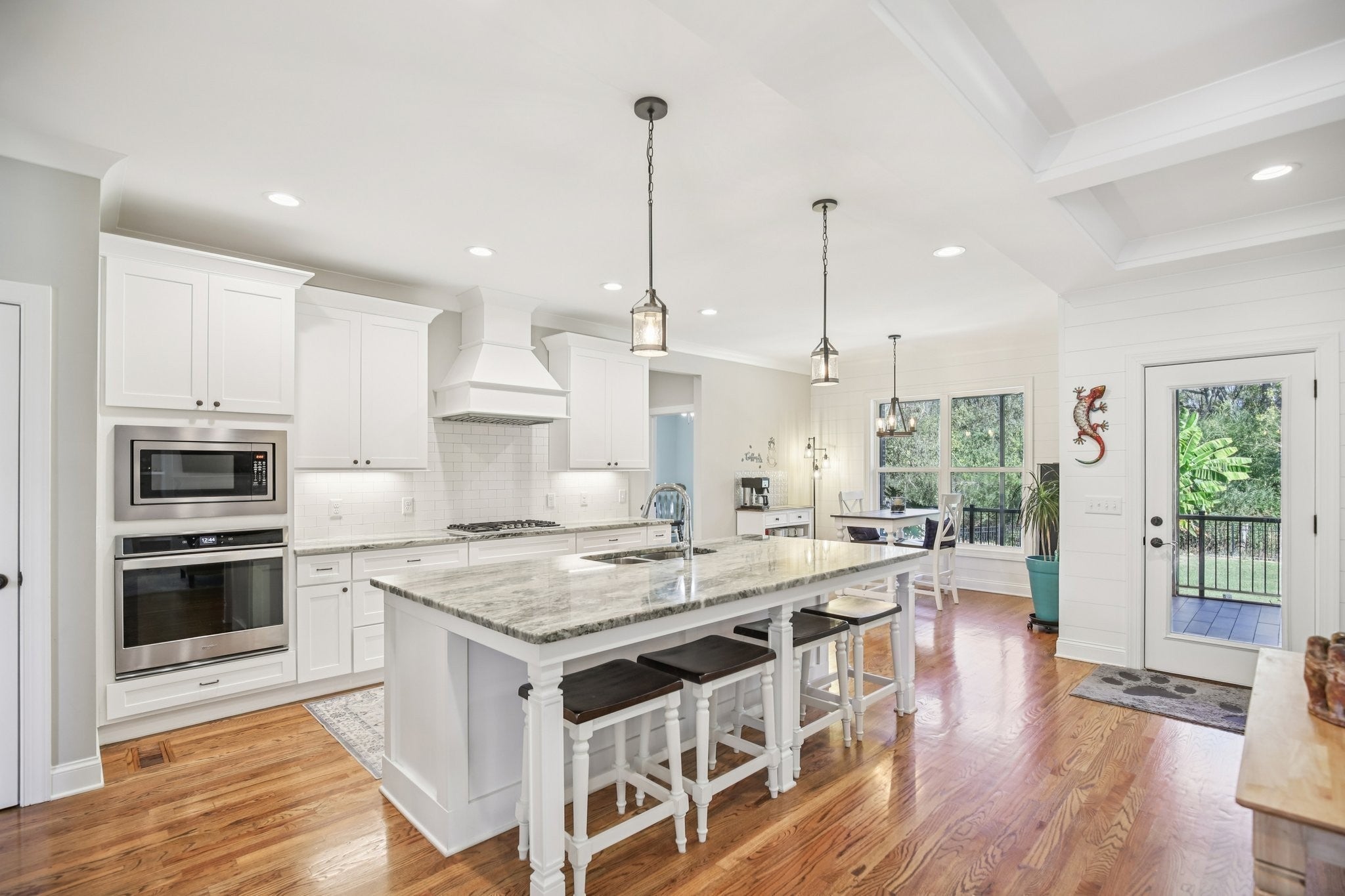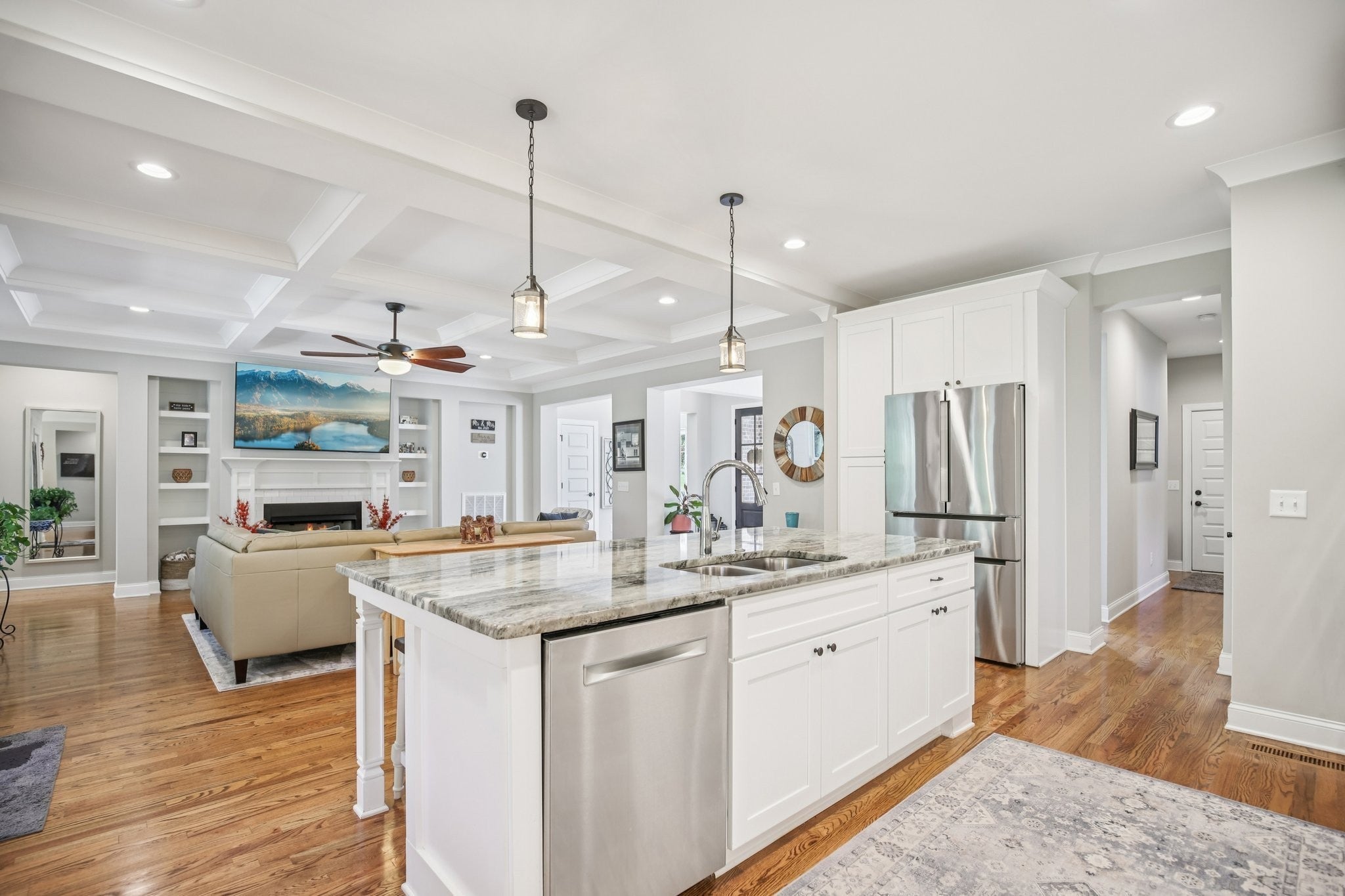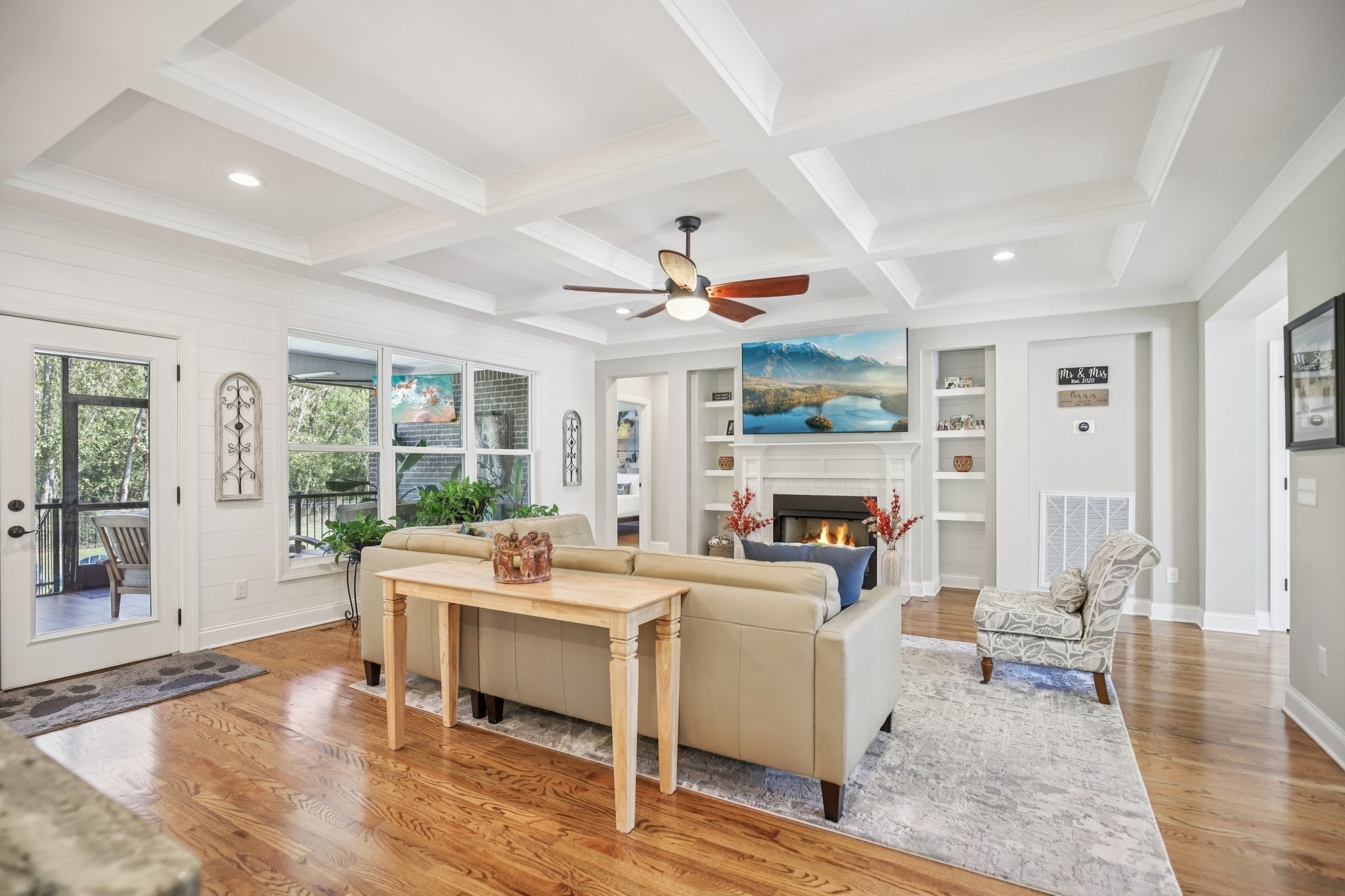 Step inside this gorgeous 3-bedroom, 3 full, 2 half bath home and be immediately impressed by premium details, including upgraded hardwood and tile flooring, custom built-ins, coffered ceilings, and custom closets throughout. The kitchen features a massive gathering island, bright white soft-close cabinetry, a gas cooktop, subway tile backsplash, upgraded Bosch appliances, and a sunny breakfast nook. All three bedrooms are conveniently located on the main level. The Primary Suite offers beautiful views, an ensuite with a standing tub, a large tiled shower with a glass enclosure, a dual vanity, and a massive walk-in closet with custom wood shelving. The two secondary bedrooms also boast large walk-in closets and private ensuite full bathrooms. Relax and enjoy the screened porch or patio overlooking the private, fenced yard, which backs directly to Corps of Engineers land, guaranteeing no rear neighbors. Property line extends to the second fence on the left side of the home. Additional features include a dedicated office, formal dining space, a great room with a cozy fireplace, a laundry room with built-in sink and cabinets, and an oversized 2-car garage measuring 30 by 23 feet, with plenty of room for garage cabinets or storing a golf cart for trips to the nearby golf course or neighborhood restaurants. Upstairs, the spacious bonus room with an attached half bath offers flexible space that could easily serve as a fourth bedroom and provides attic access for extra storage. Lovingly maintained and thoughtfully updated, this home is ready for its new owner. Schedule a tour today to see it in person.