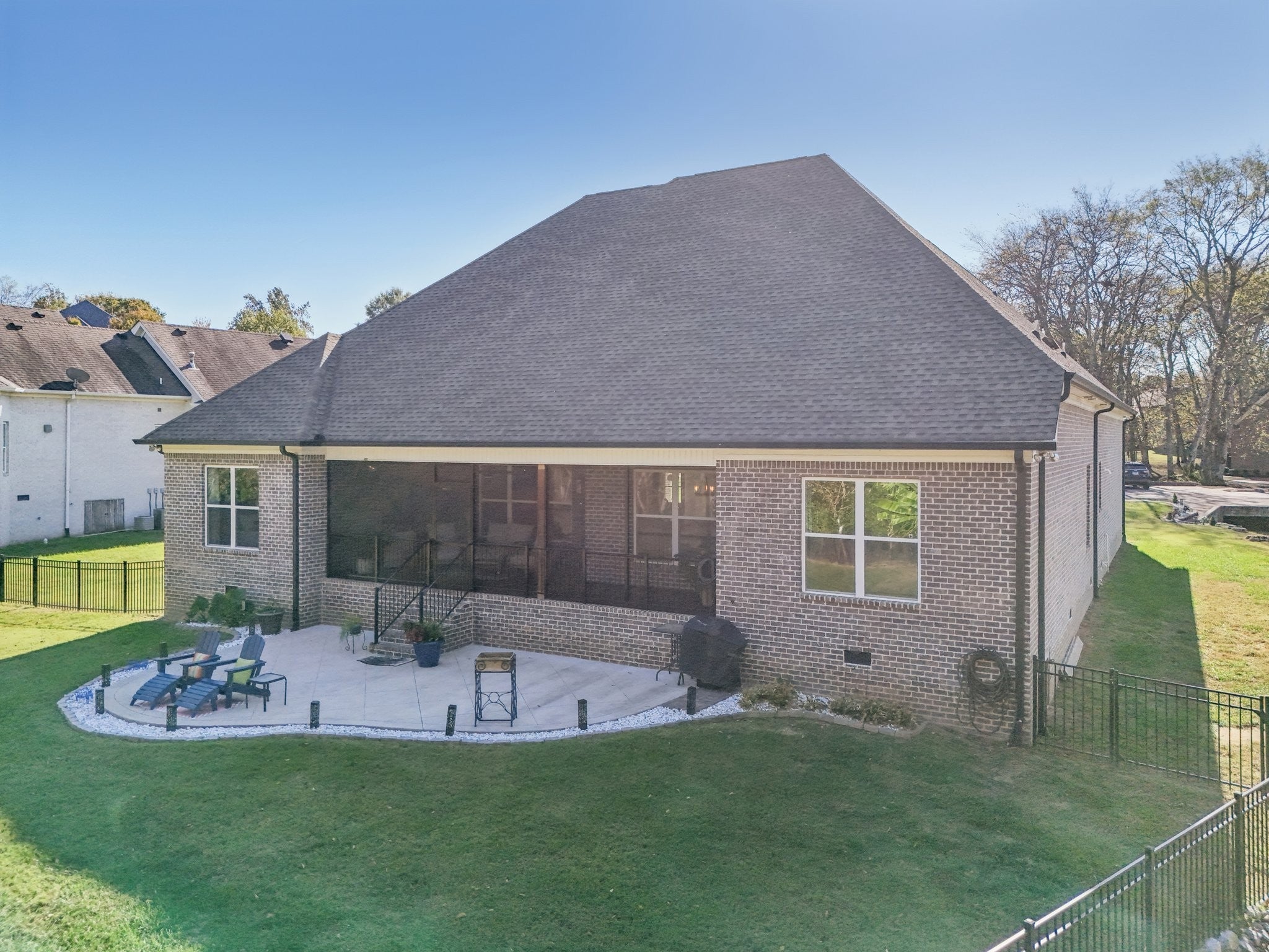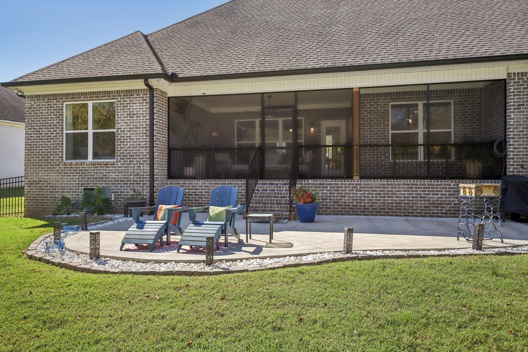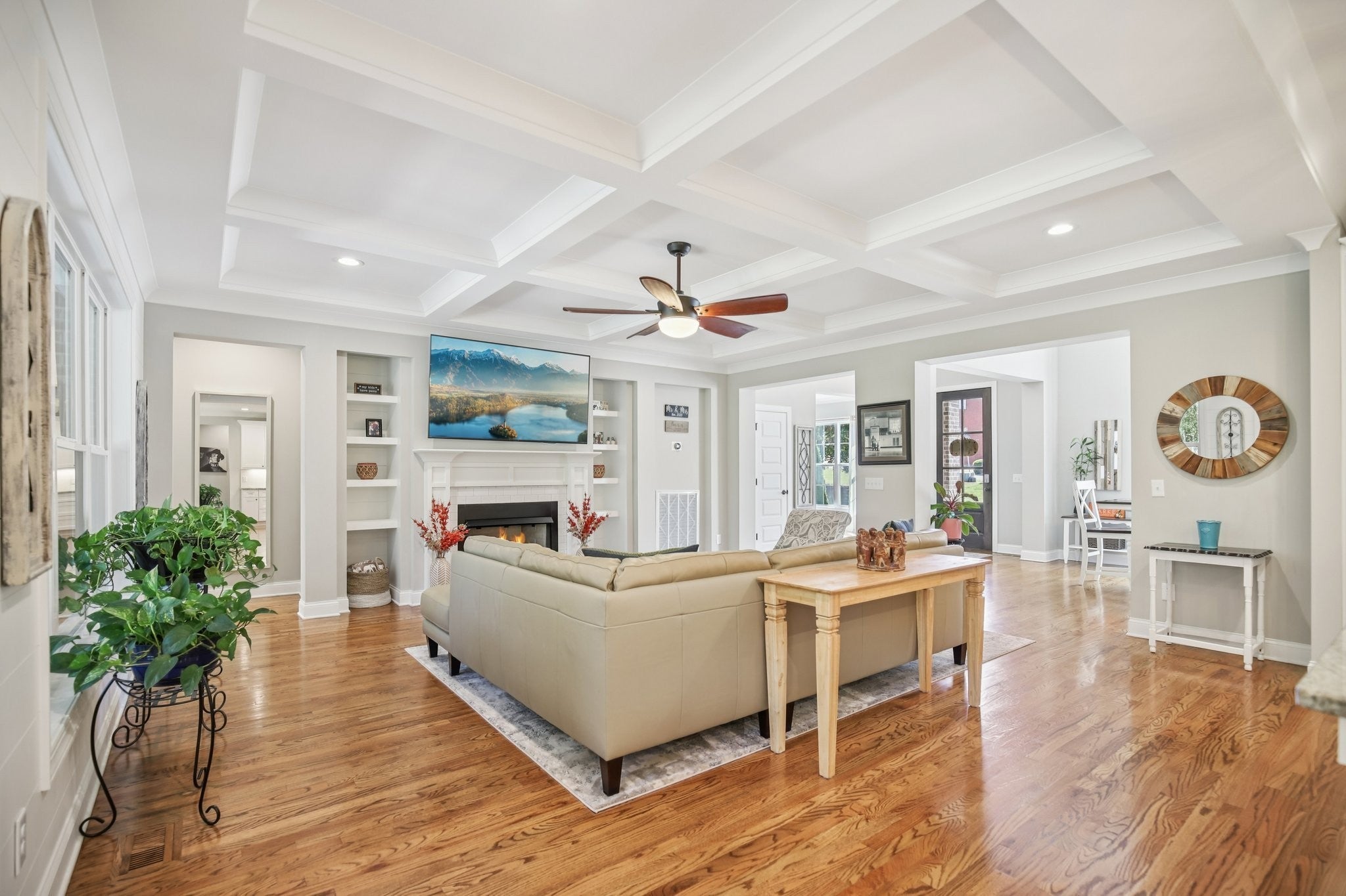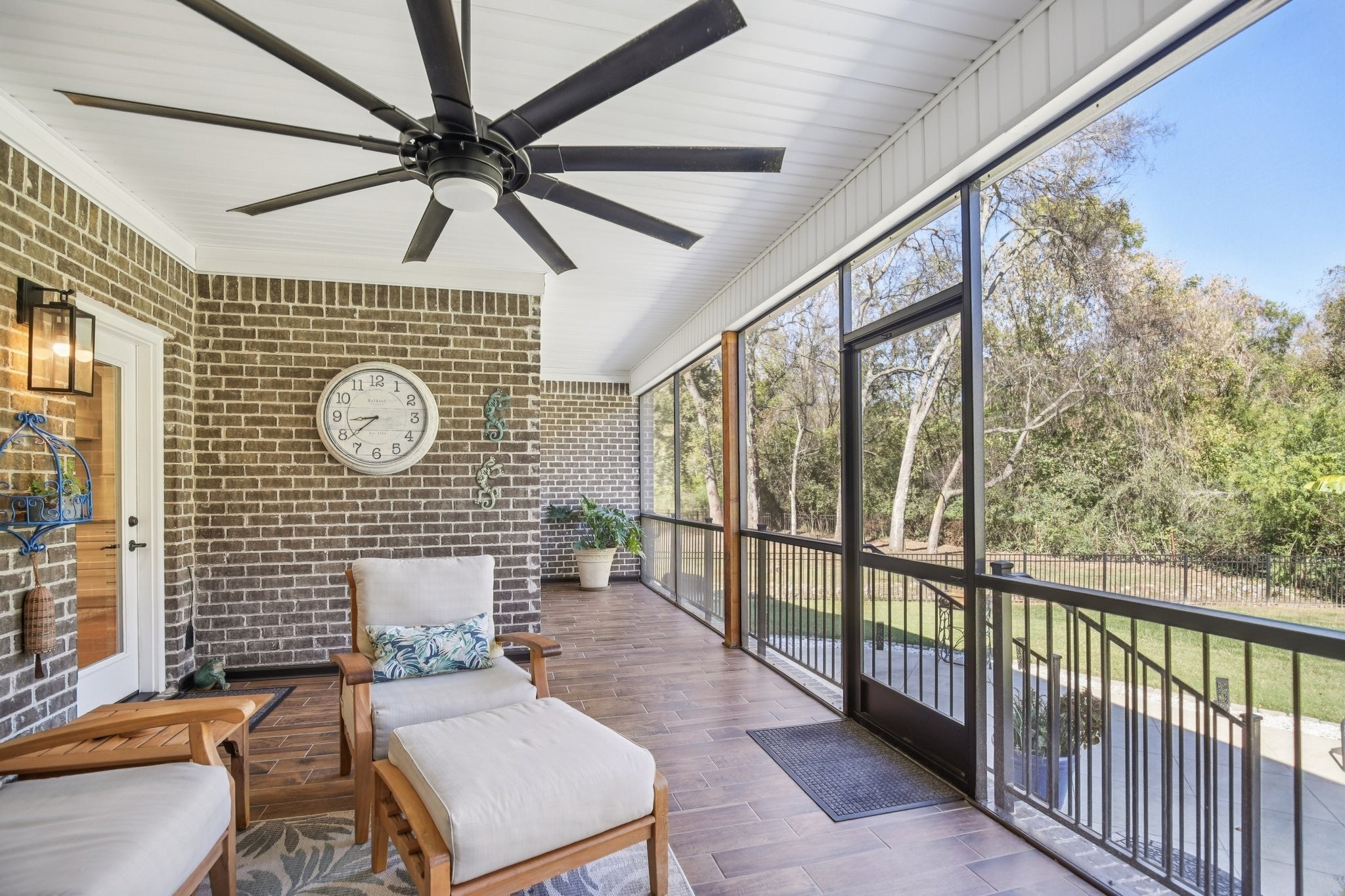 Step inside this gorgeous 3-bedroom, 3 full, 2 half bath home and be immediately impressed by premium details, including upgraded hardwood and tile flooring, custom built-ins, coffered ceilings, and custom closets throughout. The kitchen features a massive gathering island, bright white soft-close cabinetry, a gas cooktop, subway tile backsplash, upgraded Bosch appliances, and a sunny breakfast nook. All three bedrooms are conveniently located on the main level. The Primary Suite offers beautiful views, an ensuite with a standing tub, a large tiled shower with a glass enclosure, a dual vanity, and a massive walk-in closet with custom wood shelving. The two secondary bedrooms also boast large walk-in closets and private ensuite full bathrooms. Relax and enjoy the screened porch or patio overlooking the private, fenced yard, which backs directly to Corps of Engineers land, guaranteeing no rear neighbors. Property line extends to the second fence on the left side of the home. Additional features include a dedicated office, formal dining space, a great room with a cozy fireplace, a laundry room with built-in sink and cabinets, and an oversized 2-car garage measuring 30 by 23 feet, with plenty of room for garage cabinets or storing a golf cart for trips to the nearby golf course or neighborhood restaurants. Upstairs, the spacious bonus room with an attached half bath offers flexible space that could easily serve as a fourth bedroom and provides attic access for extra storage. Lovingly maintained and thoughtfully updated, this home is ready for its new owner. Schedule a tour today to see it in person.