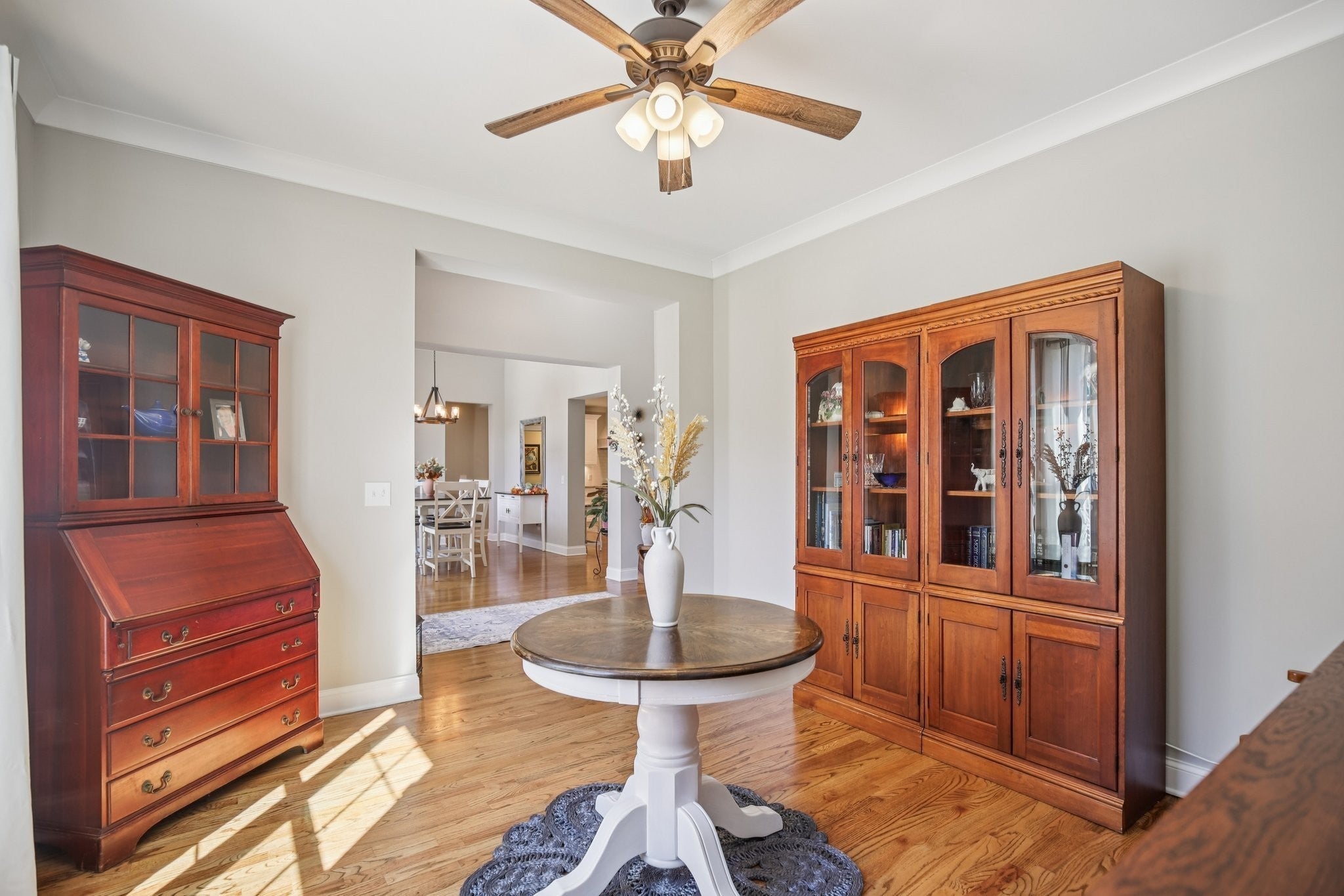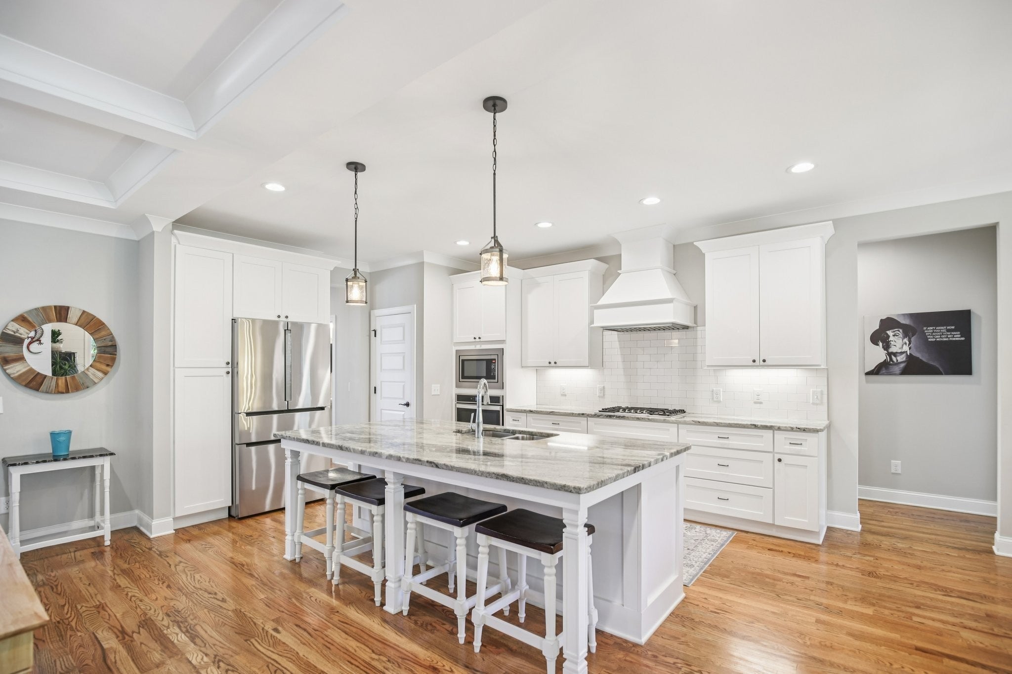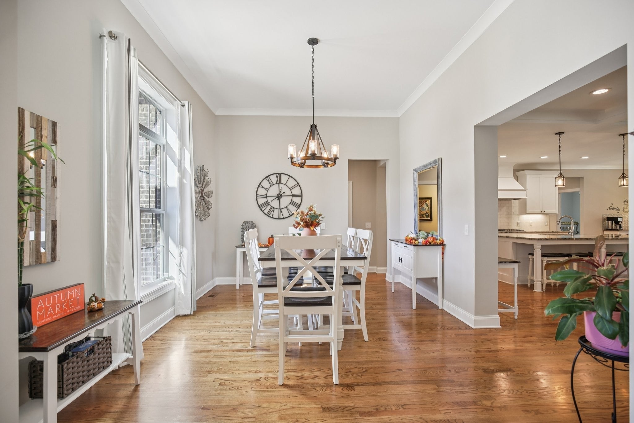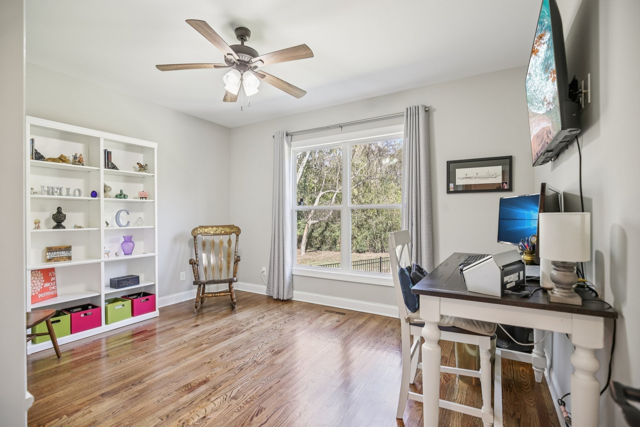 Step inside this gorgeous 3-bedroom, 3 full, 2 half bath home and be immediately impressed by premium details, including upgraded hardwood and tile flooring, custom built-ins, coffered ceilings, and custom closets throughout. The kitchen features a massive gathering island, bright white soft-close cabinetry, a gas cooktop, subway tile backsplash, upgraded Bosch appliances, and a sunny breakfast nook. All three bedrooms are conveniently located on the main level. The Primary Suite offers beautiful views, an ensuite with a standing tub, a large tiled shower with a glass enclosure, a dual vanity, and a massive walk-in closet with custom wood shelving. The two secondary bedrooms also boast large walk-in closets and private ensuite full bathrooms. Relax and enjoy the screened porch or patio overlooking the private, fenced yard, which backs directly to Corps of Engineers land, guaranteeing no rear neighbors. Property line extends to the second fence on the left side of the home. Additional features include a dedicated office, formal dining space, a great room with a cozy fireplace, a laundry room with built-in sink and cabinets, and an oversized 2-car garage measuring 30 by 23 feet, with plenty of room for garage cabinets or storing a golf cart for trips to the nearby golf course or neighborhood restaurants. Upstairs, the spacious bonus room with an attached half bath offers flexible space that could easily serve as a fourth bedroom and provides attic access for extra storage. Lovingly maintained and thoughtfully updated, this home is ready for its new owner. Schedule a tour today to see it in person.